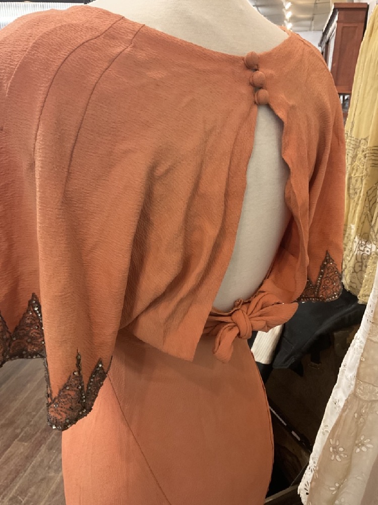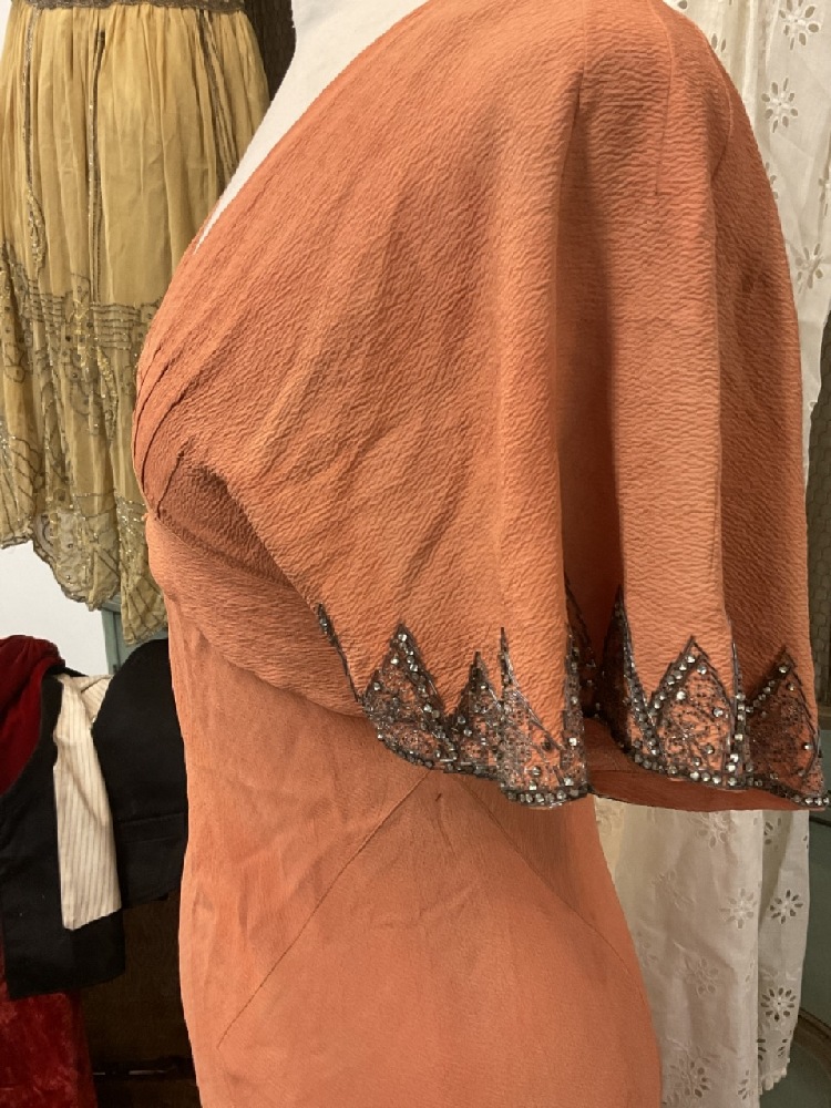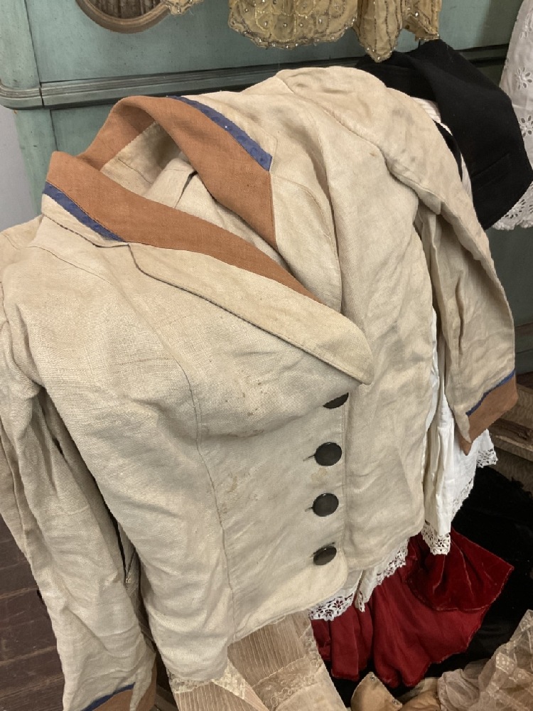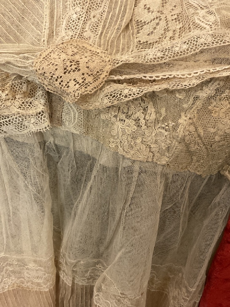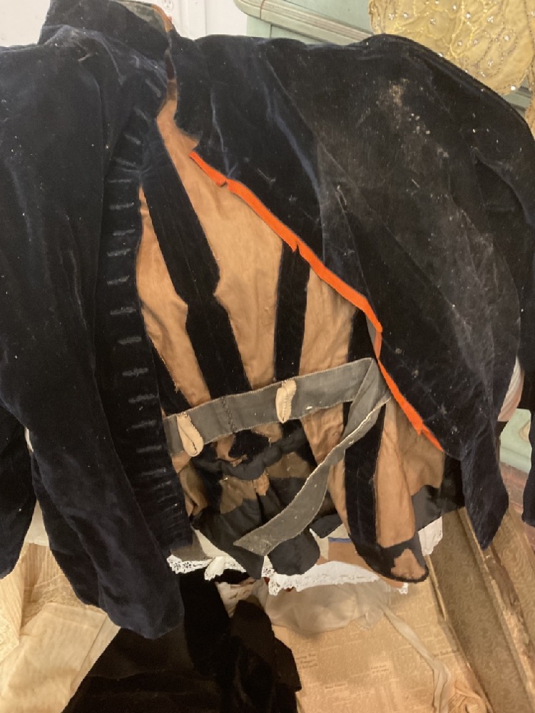 Estate compiled trunk of clothing. Victorian bodice, 1920's coral dress (two pieces) with beadwork, white lace dress, Driving jacket, beaded dress (poor), red cape and more. As seen in photograph preview.