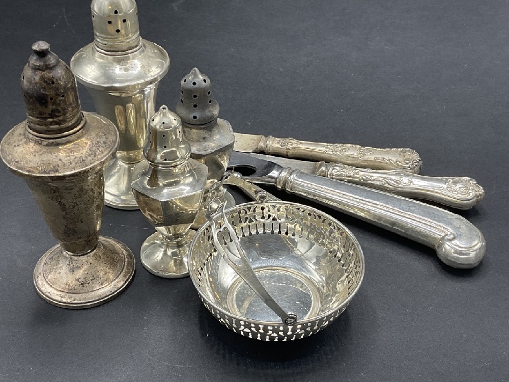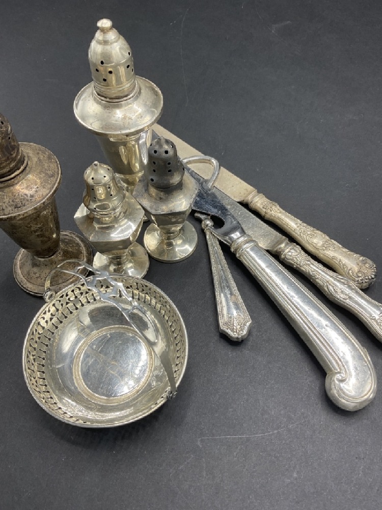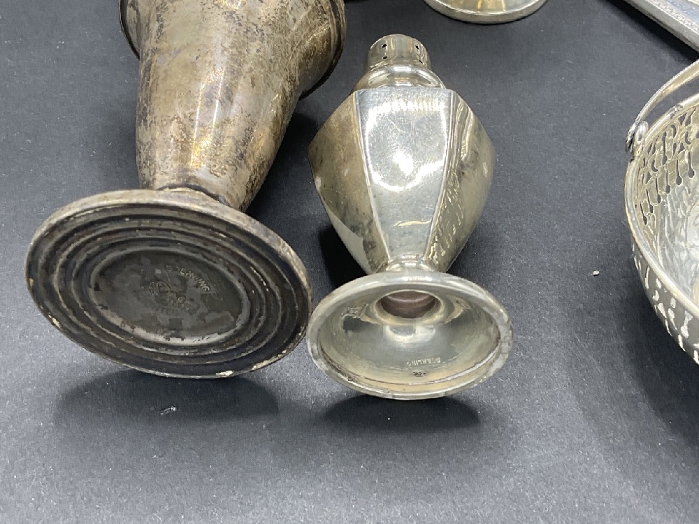 Assorted sterling silver and weighted sterling silver wares. Basket and one salt and pepper shaker not weighted. As seen in photograph preview.