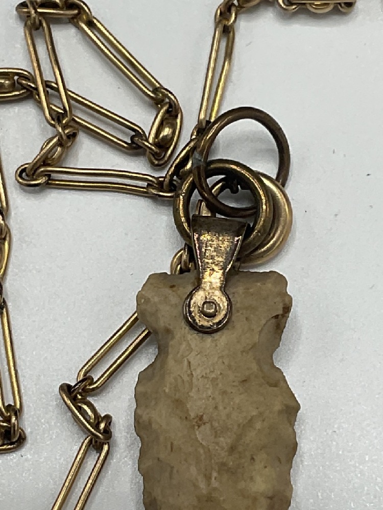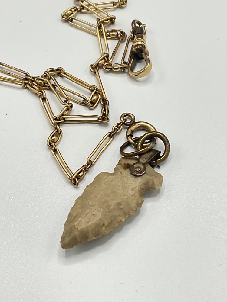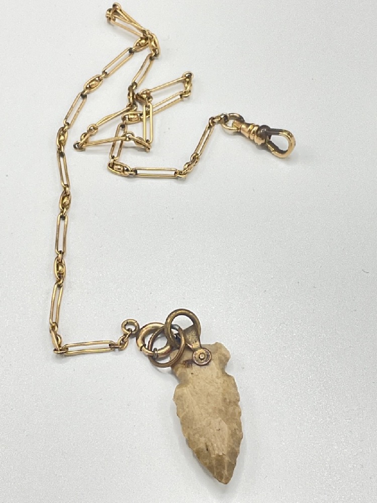 An antique gold filled watch chain with Indian arrowhead as watch fob.
