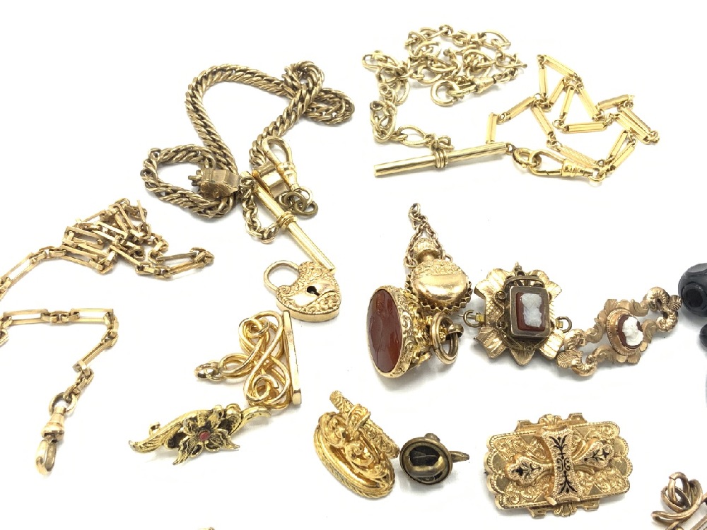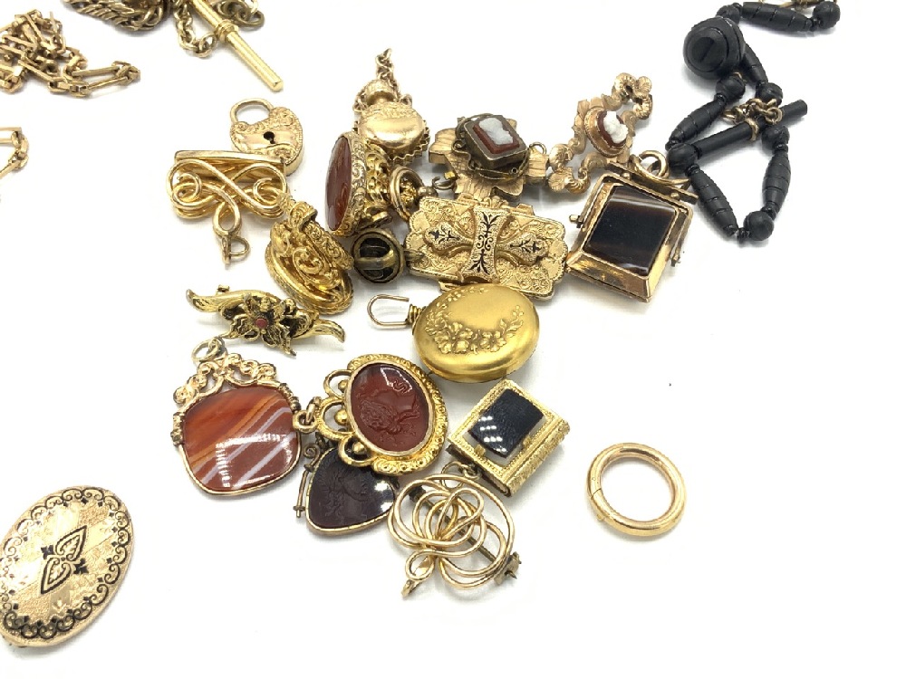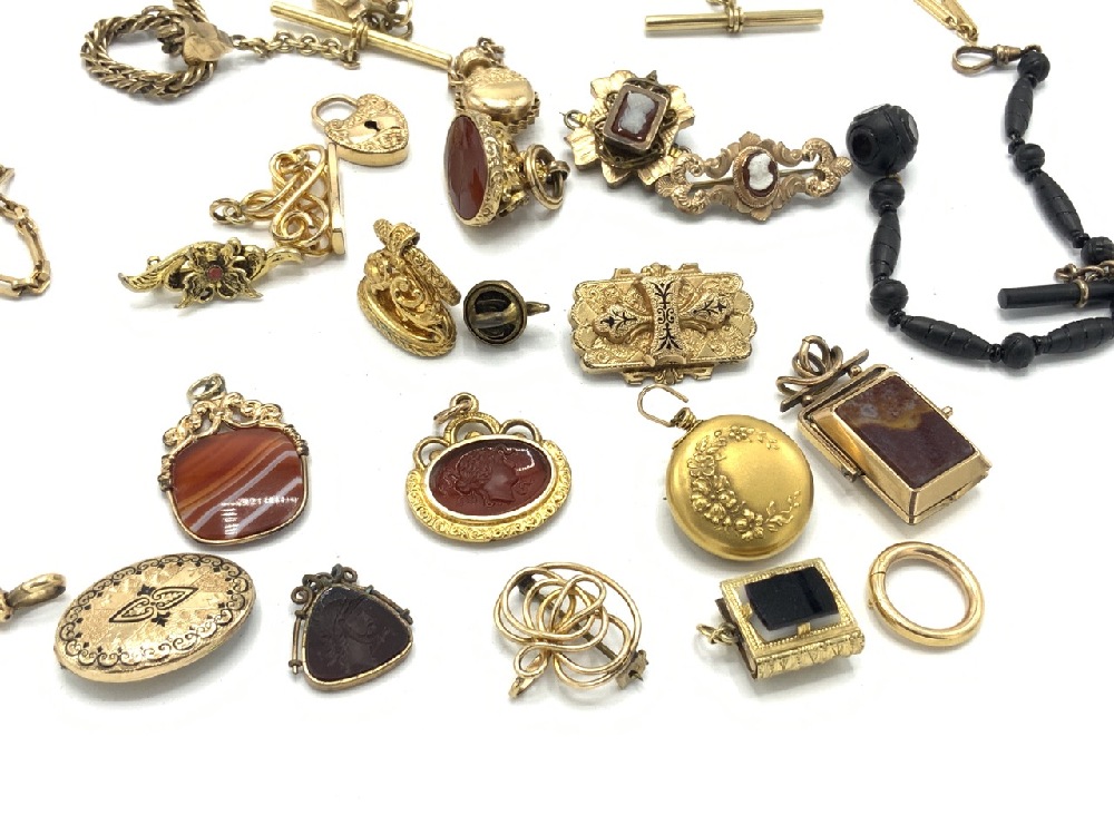 Victorian collection of gold filled watch fobs, pins, cameos, carnelian stones and chains. As seen in photograph preview.
