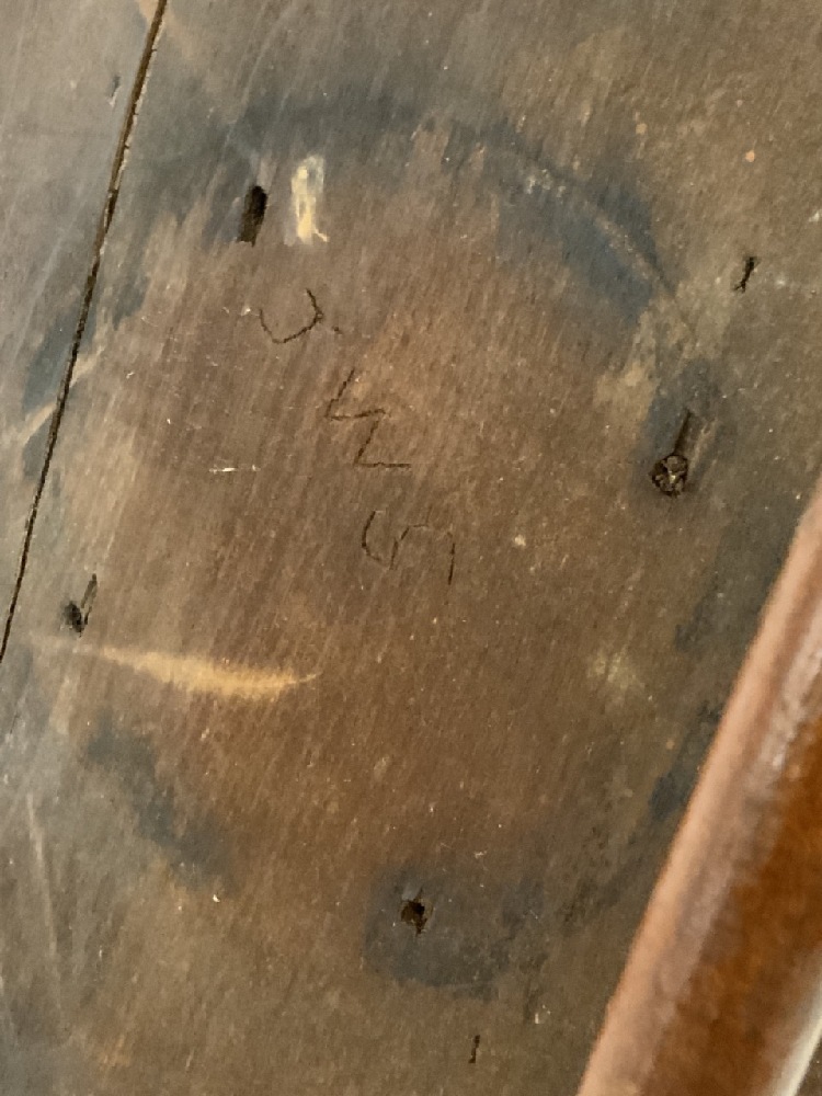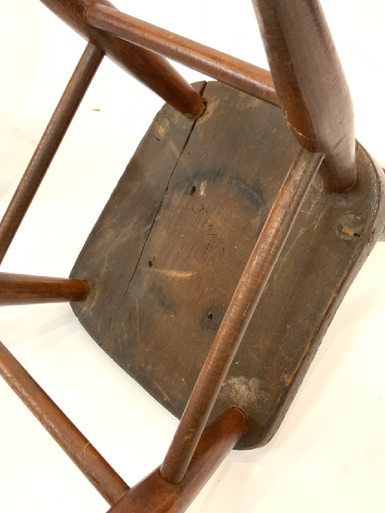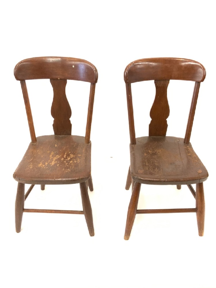 A pair of 19th century child's school desk chairs. Converted to wooden legs original cast iron mounts. One chair is split.