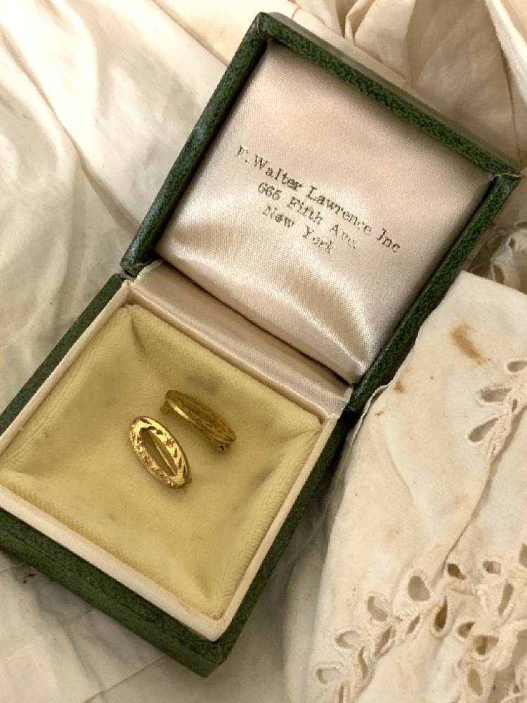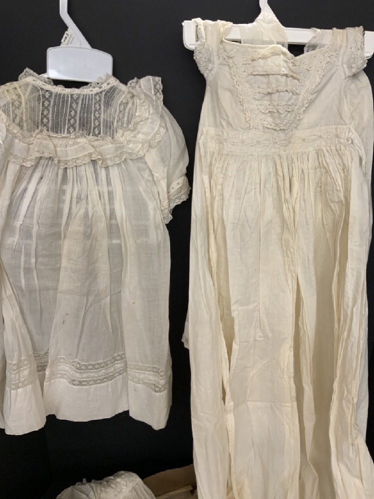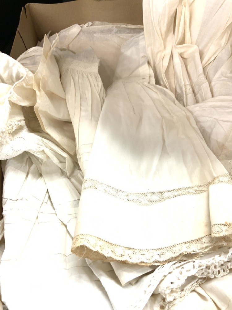 A box contaning 19th century christening dresses and whites. Two gold filled diaper pins. As seen in photograph preview.