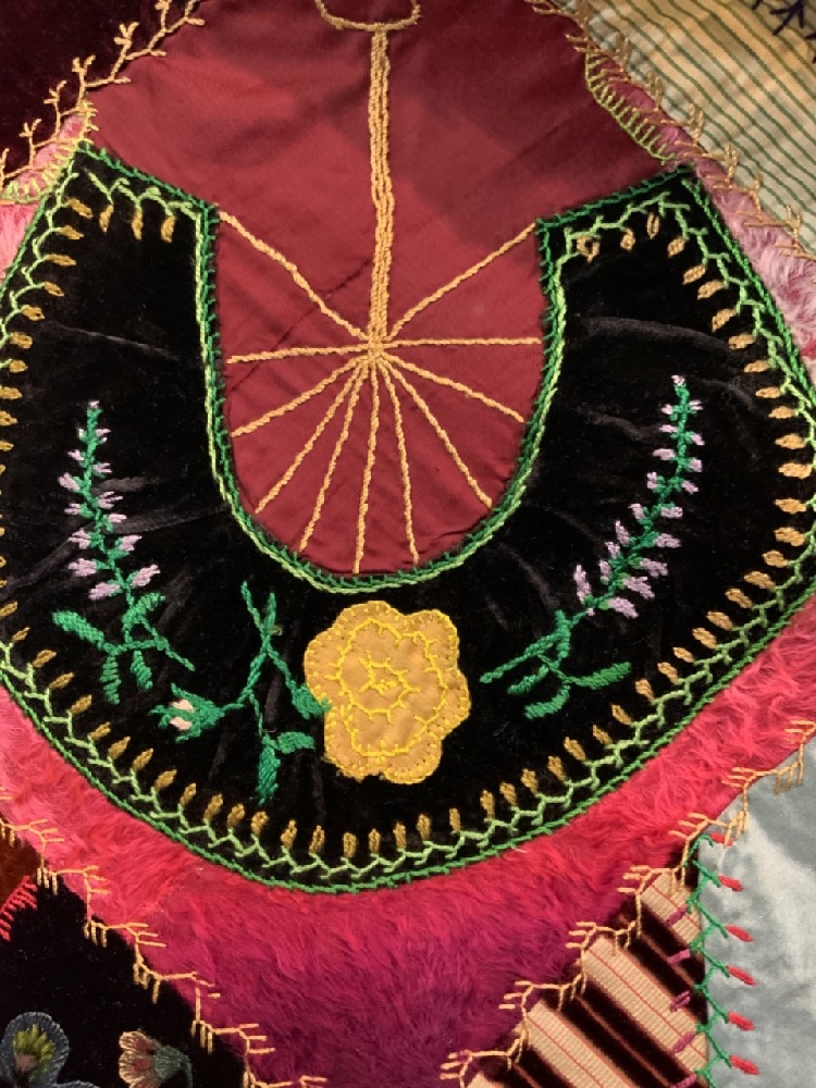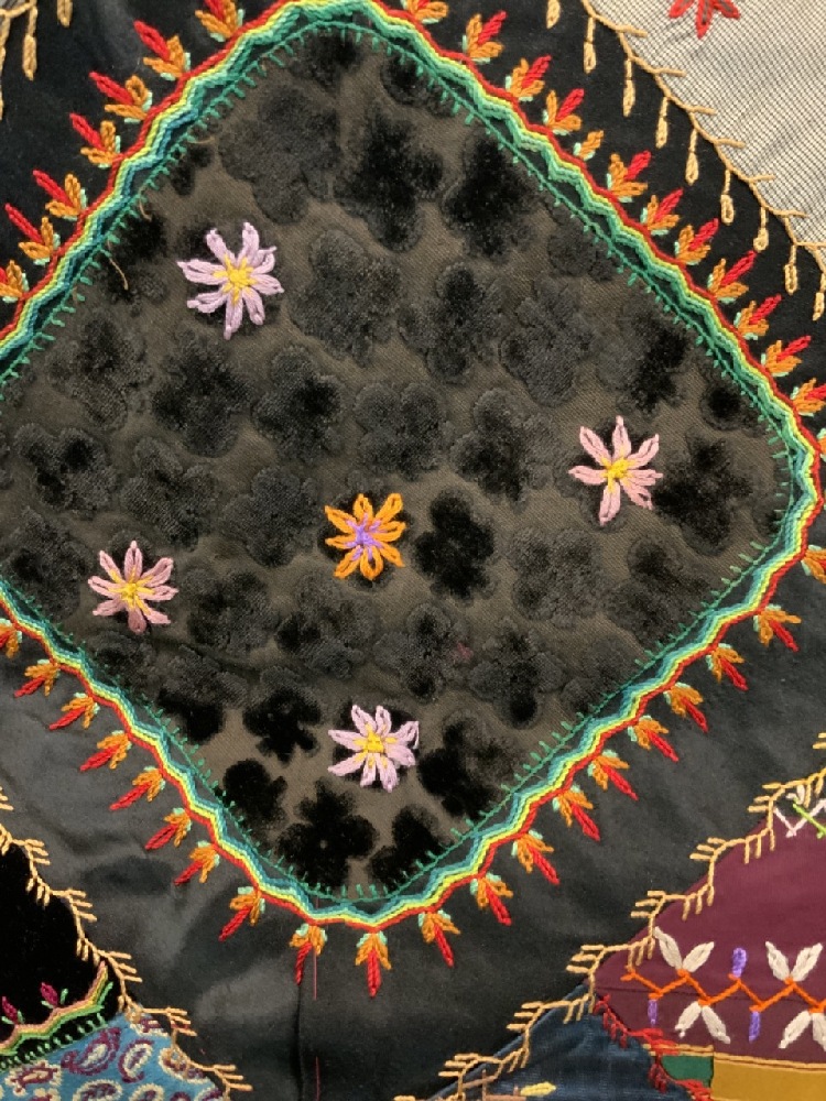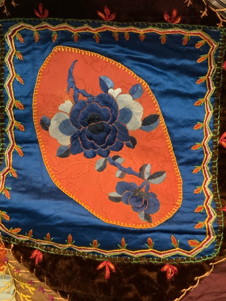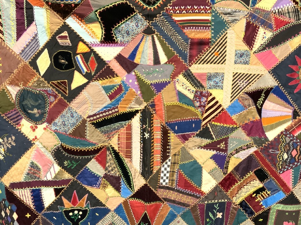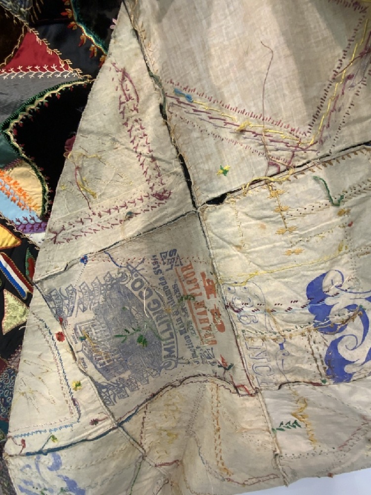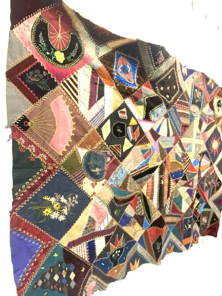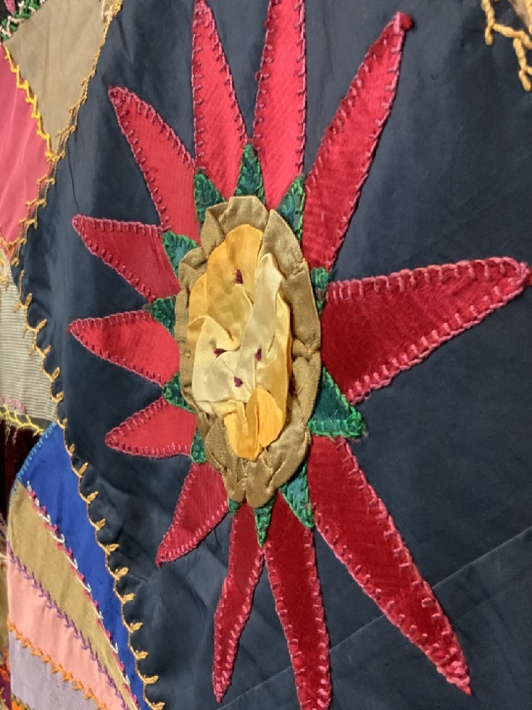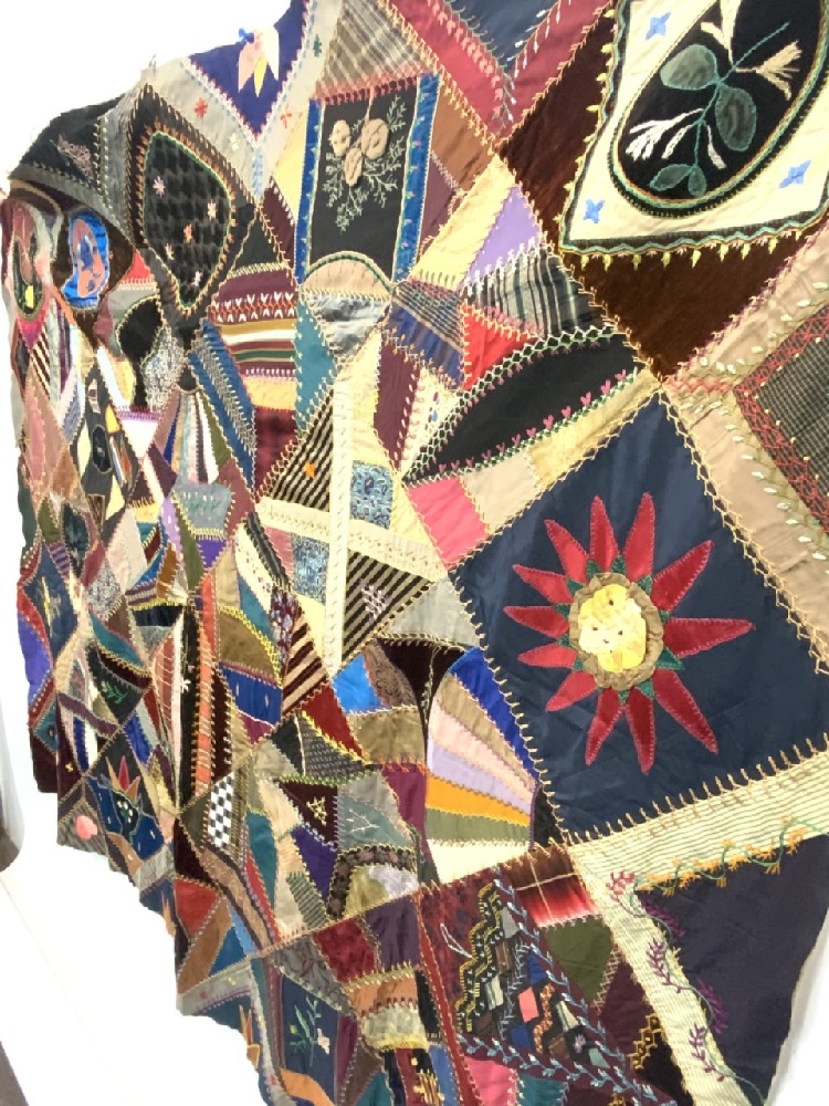 19th century Victorian crazy quilt with hand painted flowers, owl, silk. Hudson Valley 19th century.