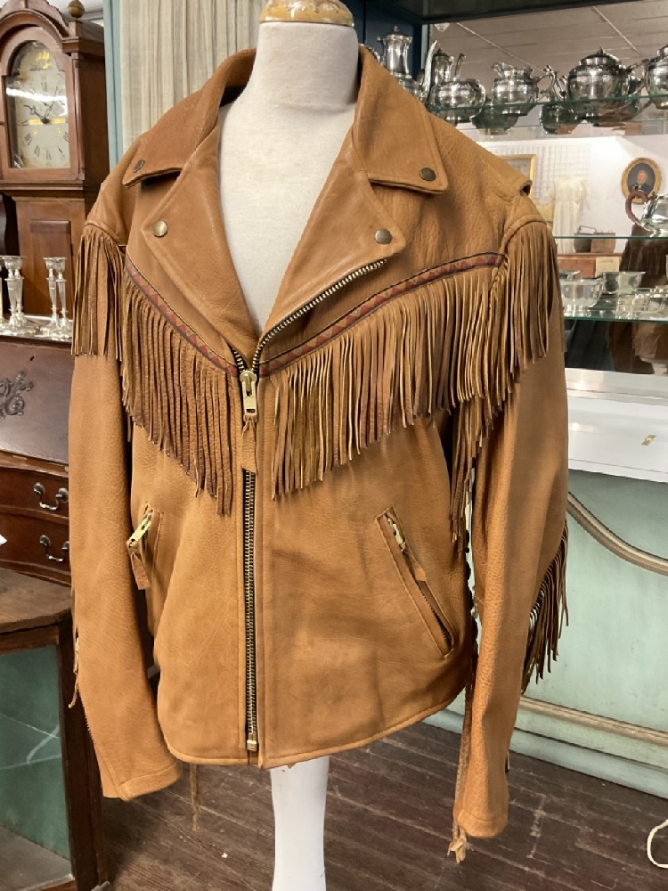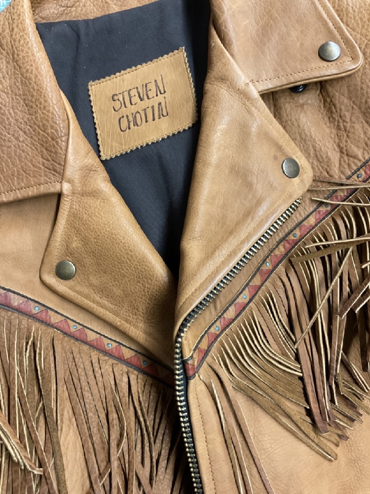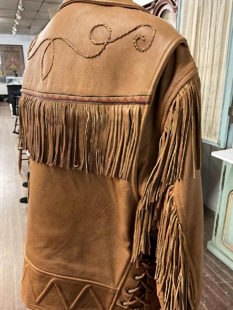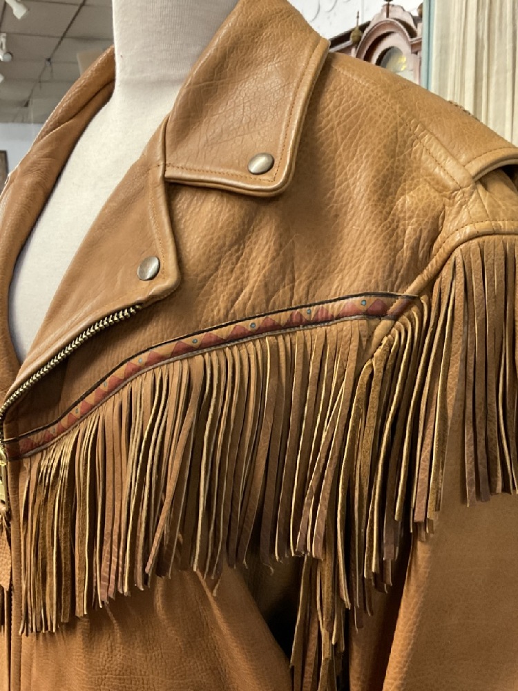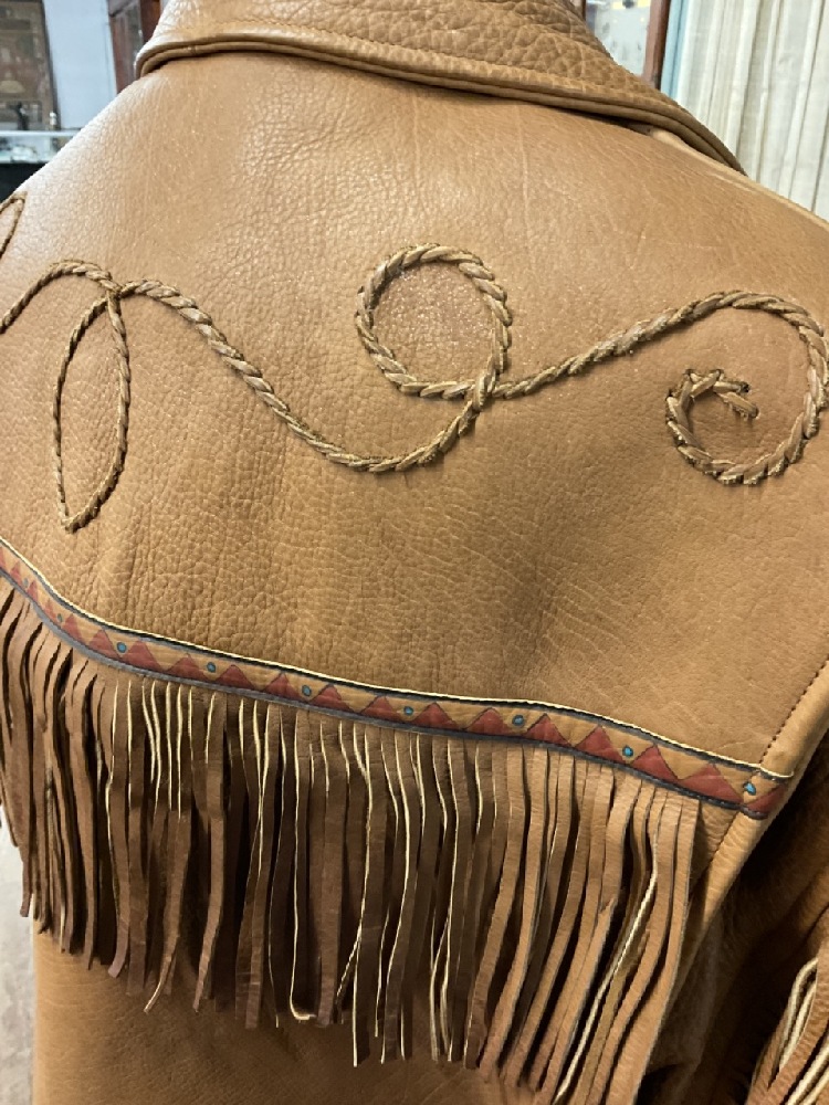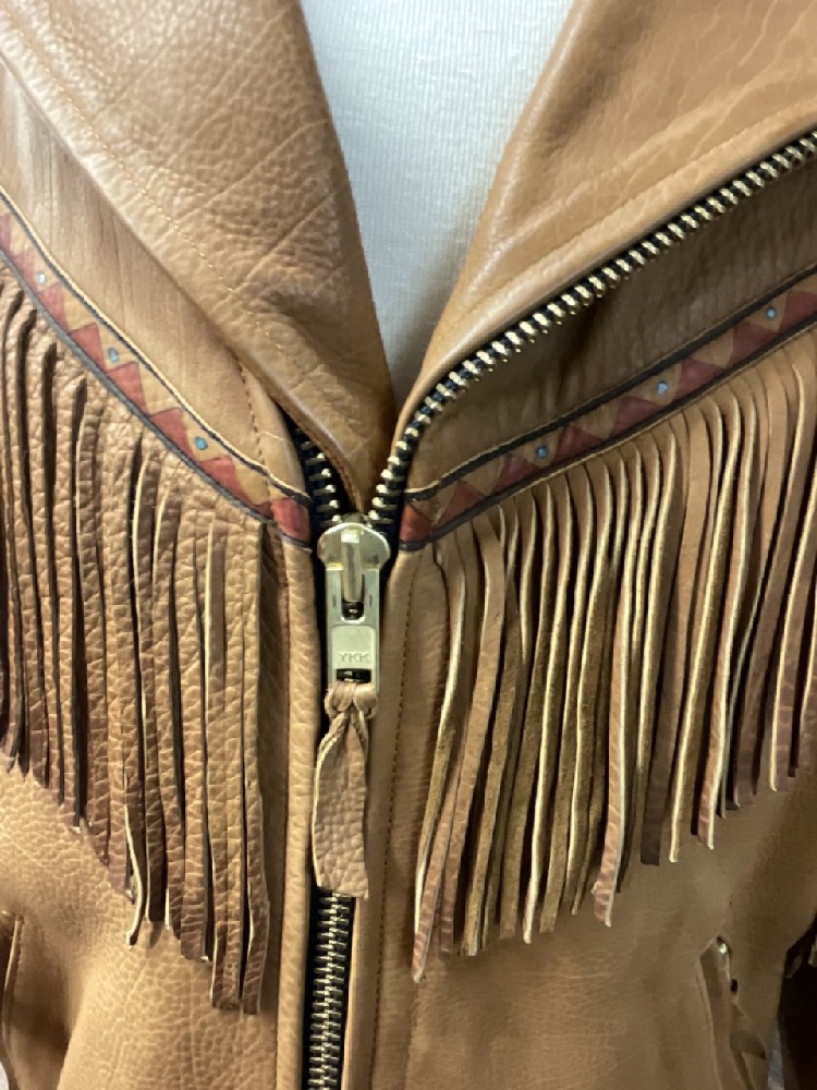 Very high quality men's leather jacket with fringe and embroidery. Size M-L. Unknown maker.