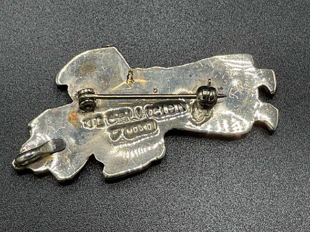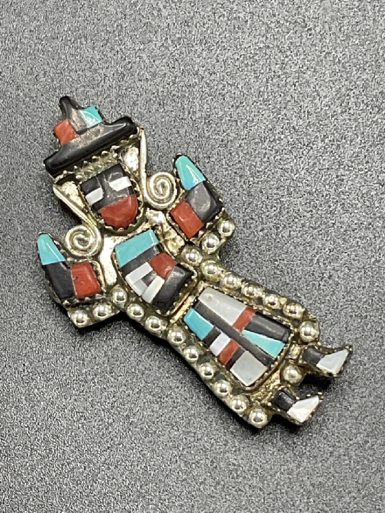 Zuni tribe sterling silver pin with coral, mother of pearl and turquoise. 2" X 1 1/2"