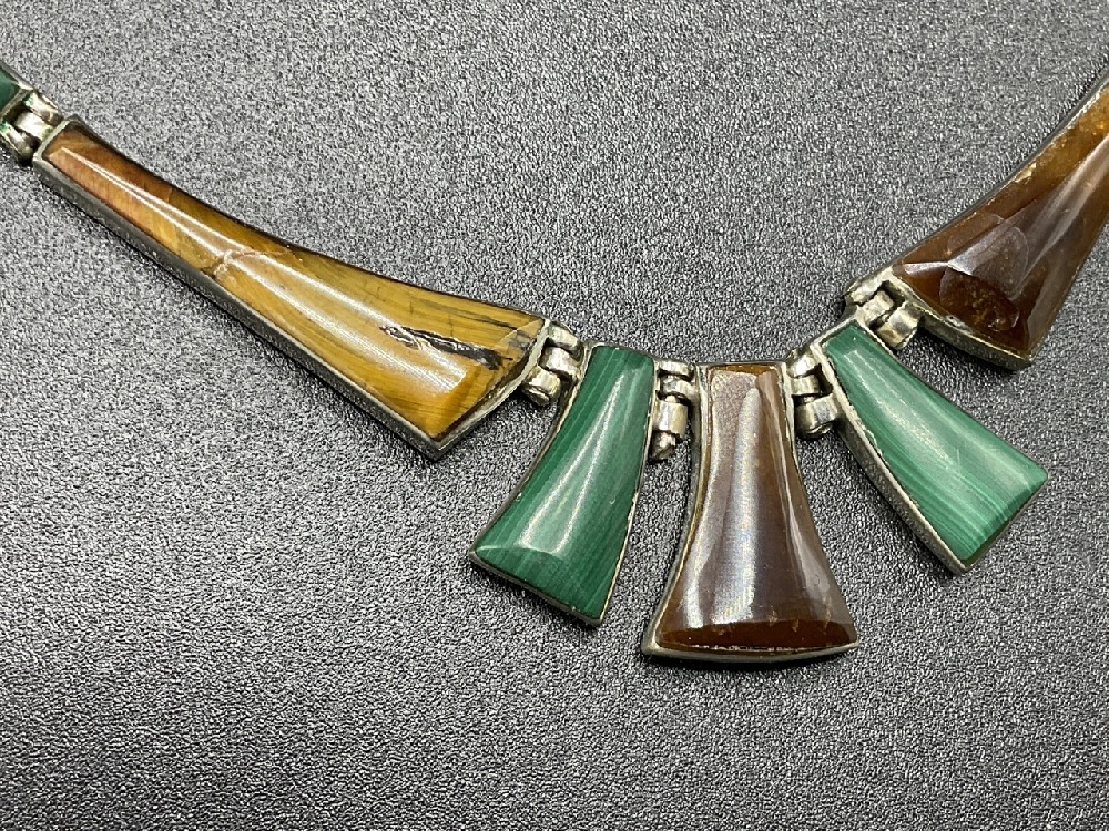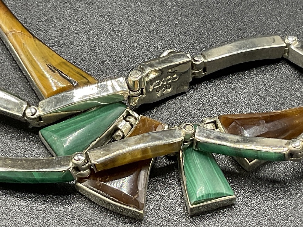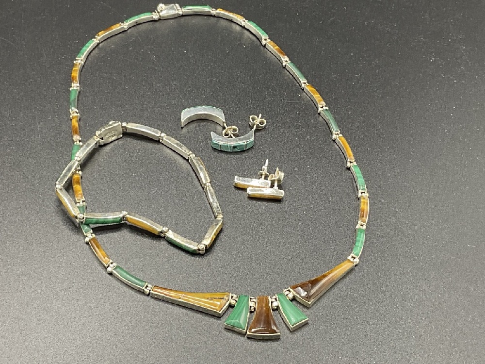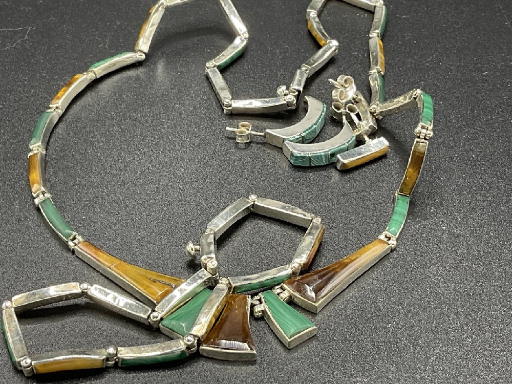 Mexican 950 sterling silver carnelian and malachite necklace, bracelet and two pairs of complimenting earrings.