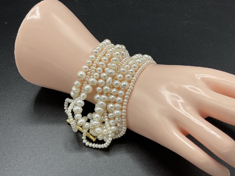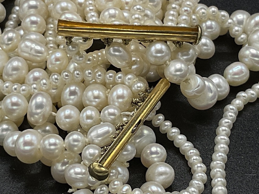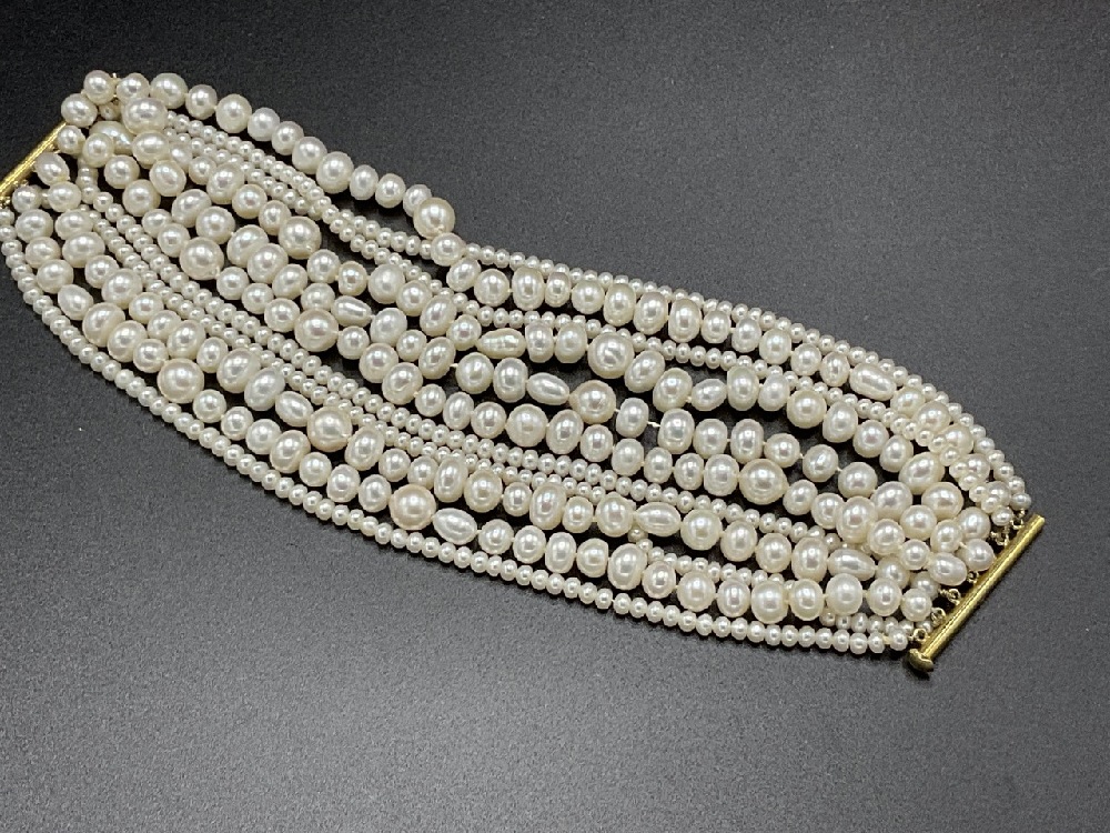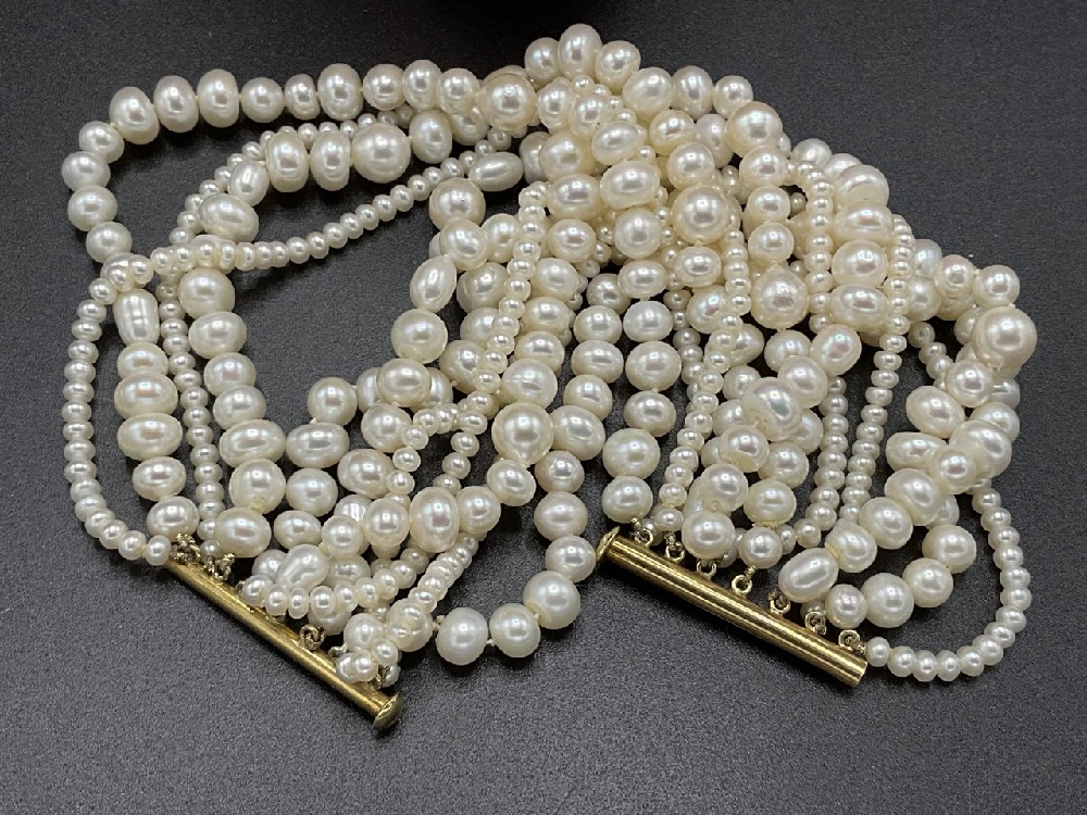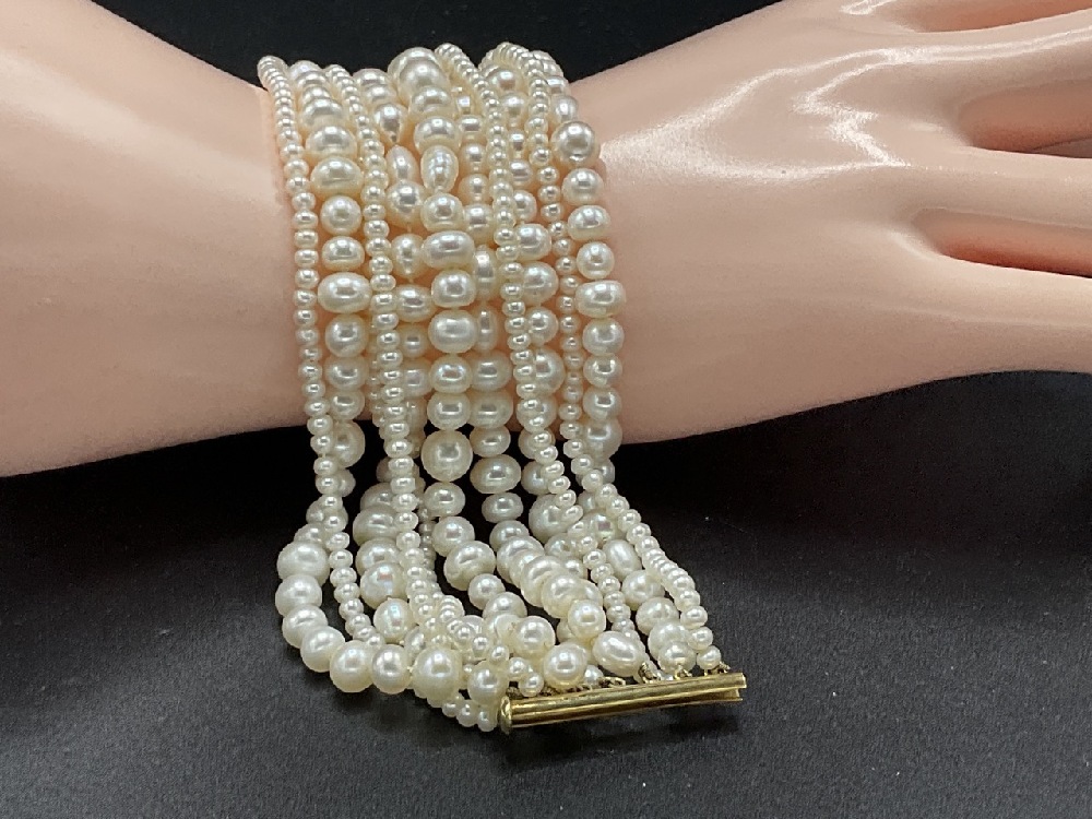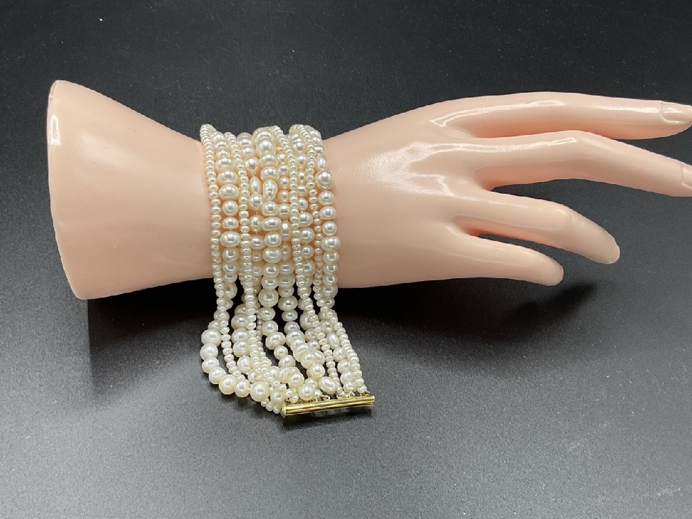 Outstanding multi strand pearl bracelet with 18k yellow gold slide closure.