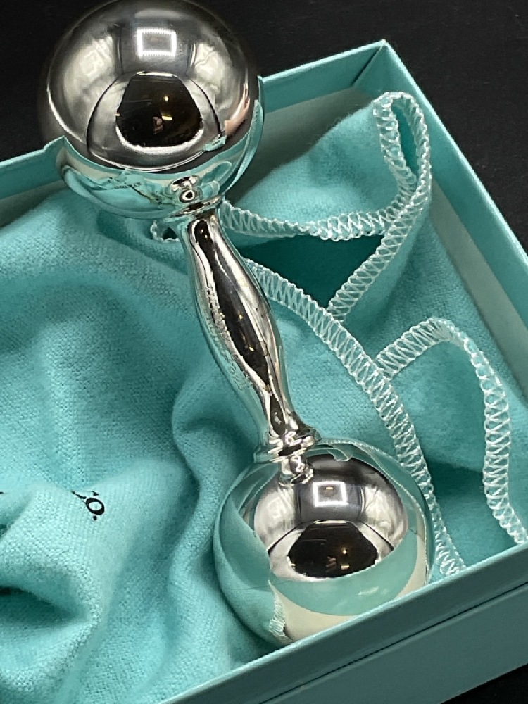 Tiffany & Co. sterling silver baby rattle with original felt bag and box. Perfect gift.