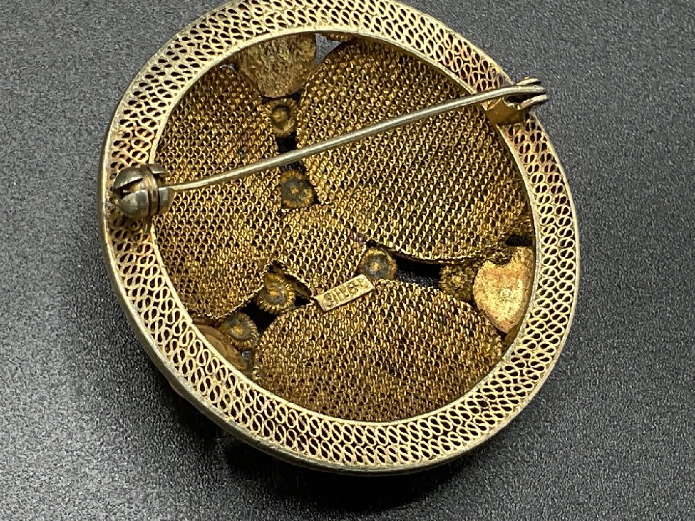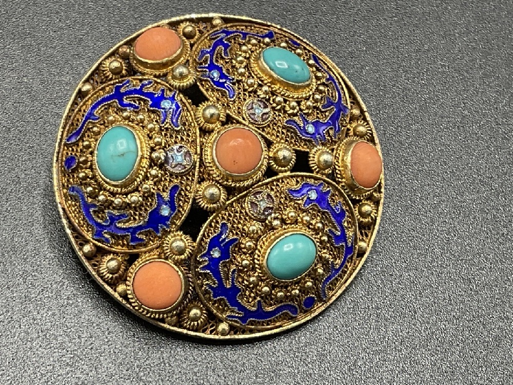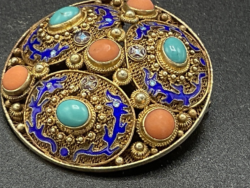Chinese silver vermeil enameled pin with coral and turquoise stones.