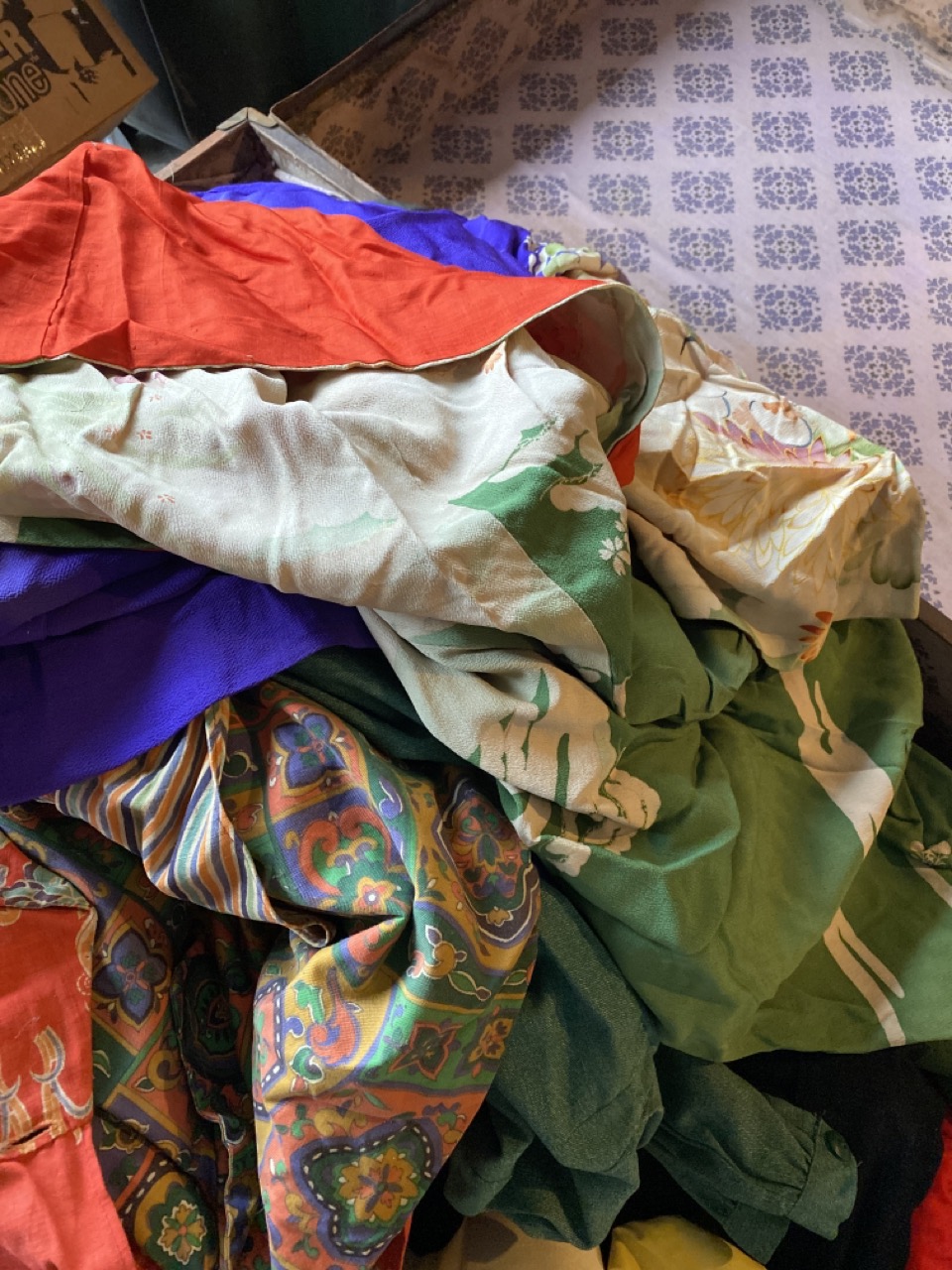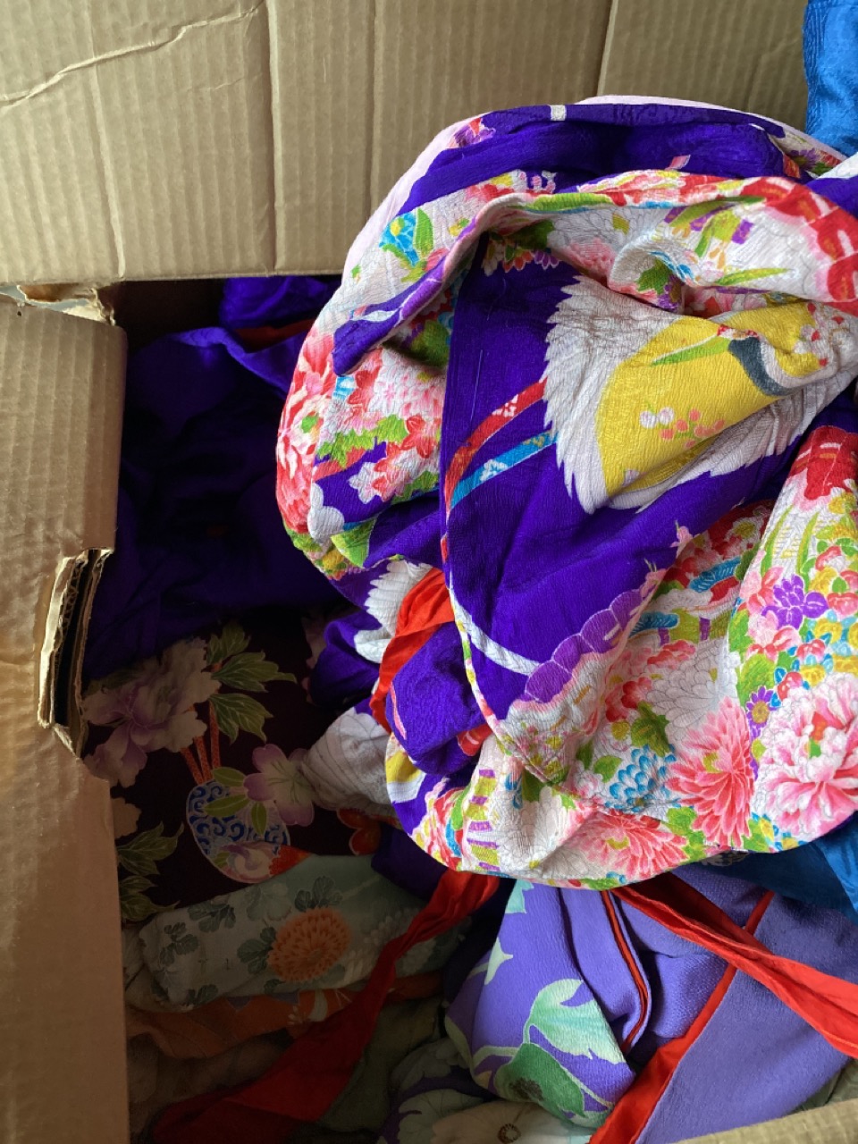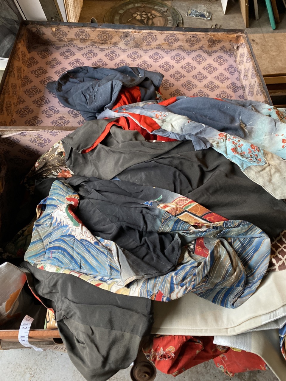 A trunk filled with old Japanese Kimonos and textiles of Asian origin.