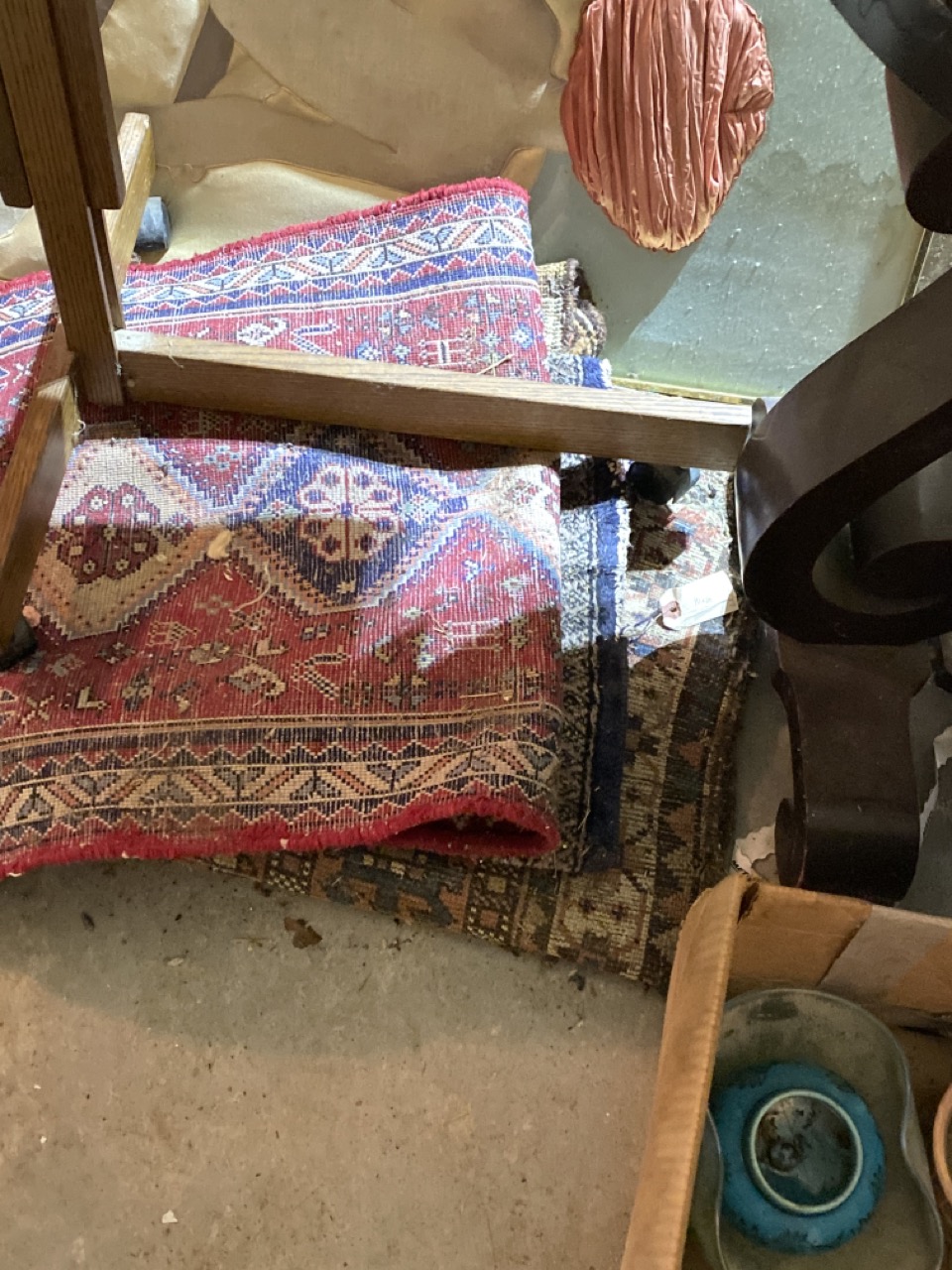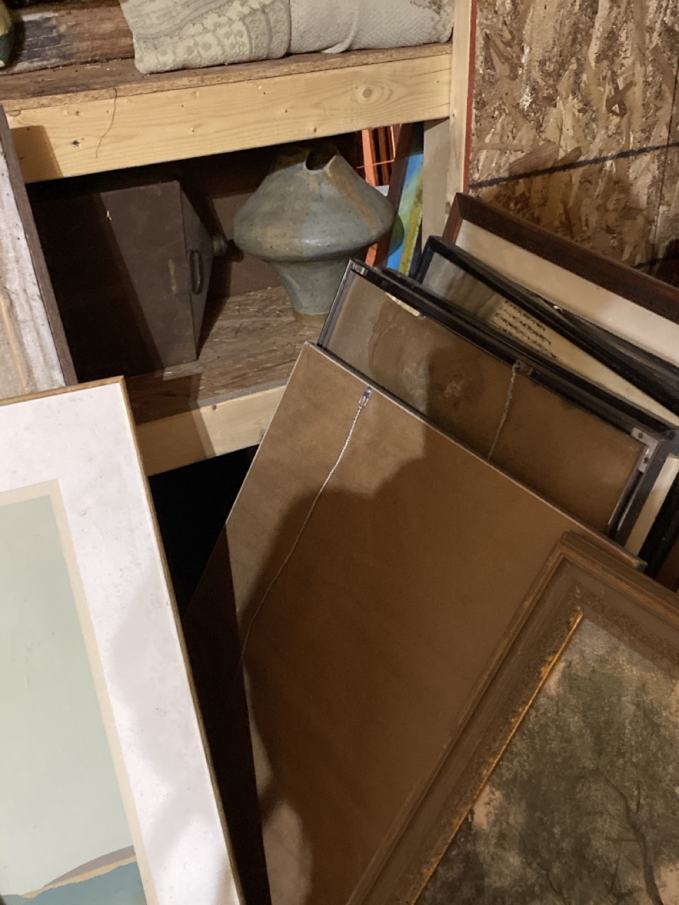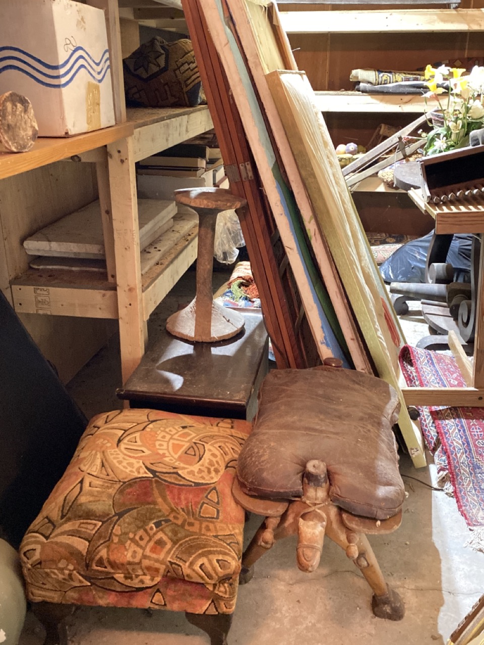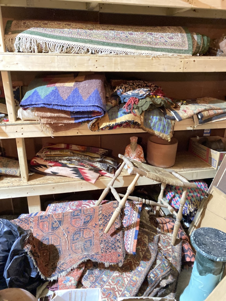 A 15" X 15" space with a combination of items including approx. 30 pieces of art. 50+ pieces of unframed lithographs, rugs (possible old moth damage, soiled ) , camel saddles, pottery, lighting etc.