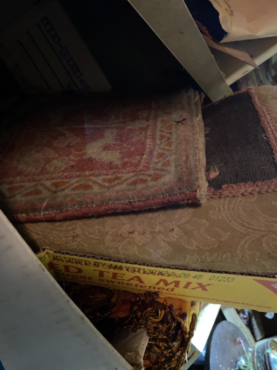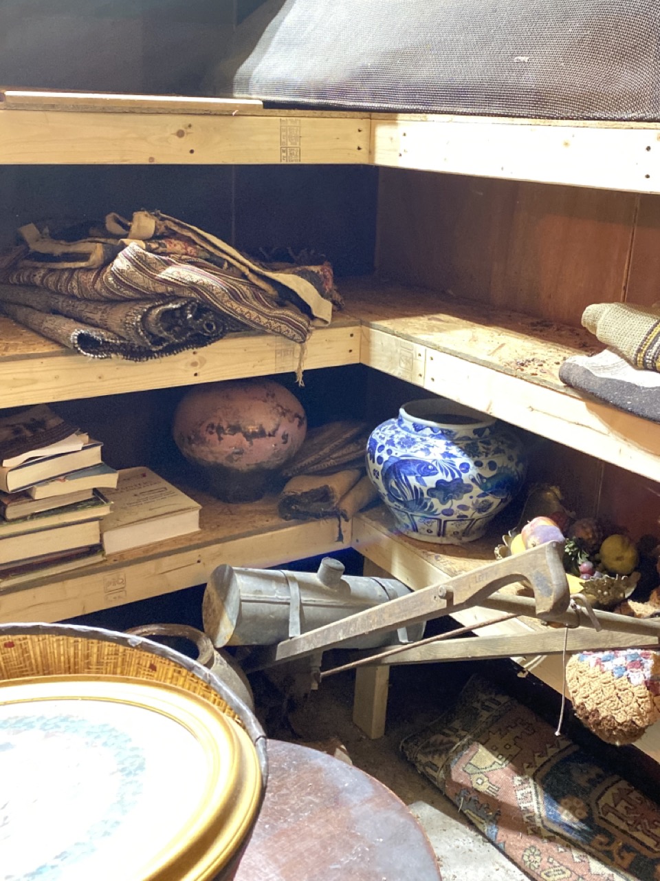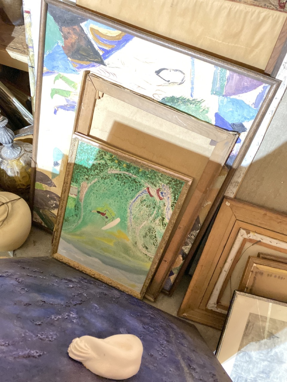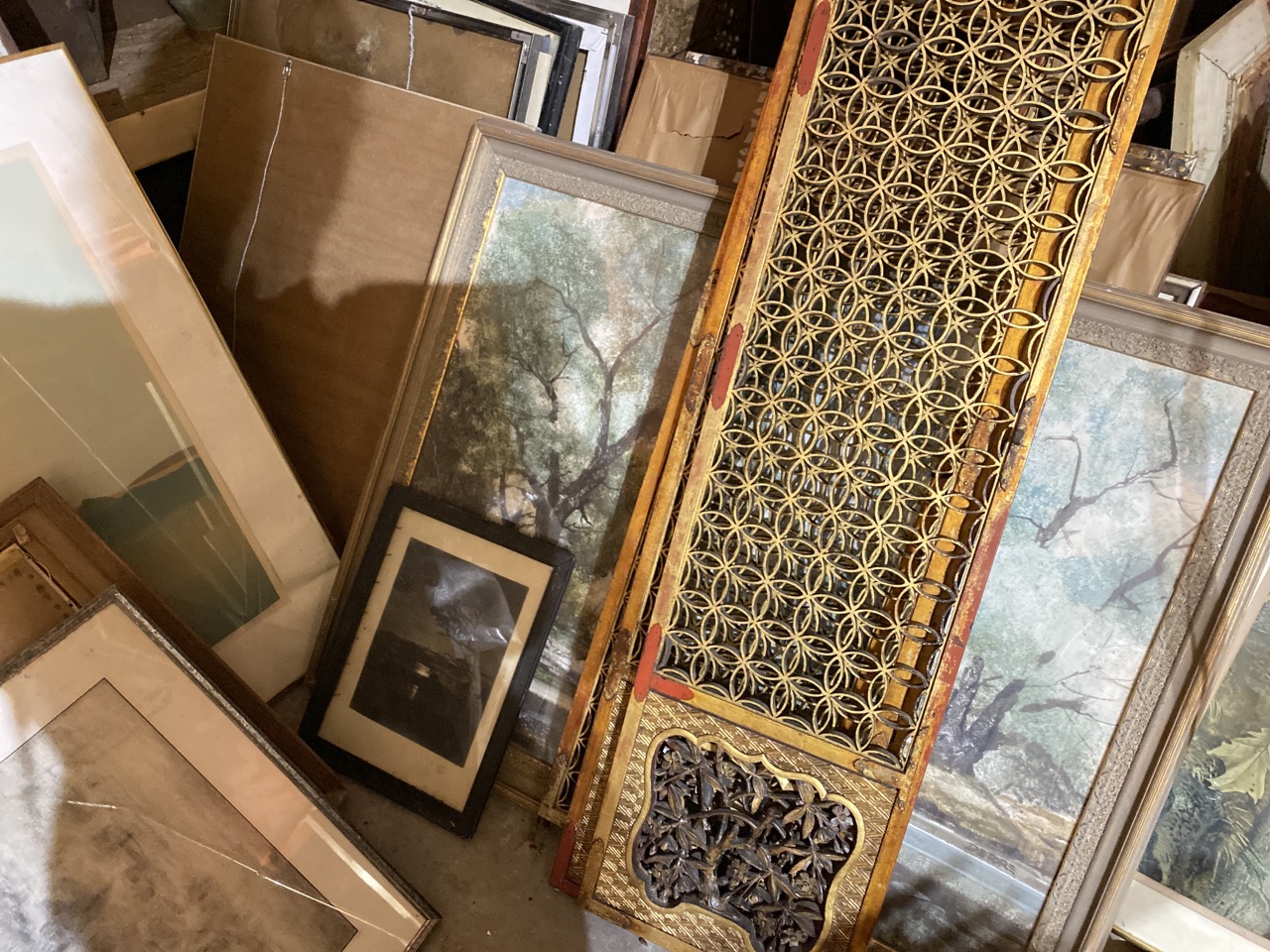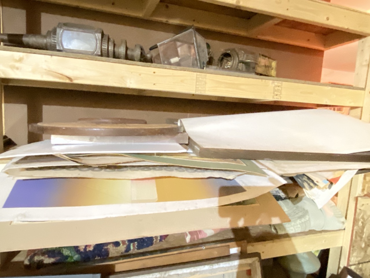 A 15" X 15" space with a combination of items including approx. 30 pieces of art. 50+ pieces of unframed lithographs, rugs (possible old moth damage, soiled ) , camel saddles, pottery, lighting etc.