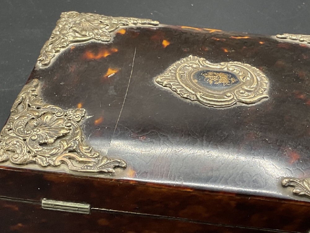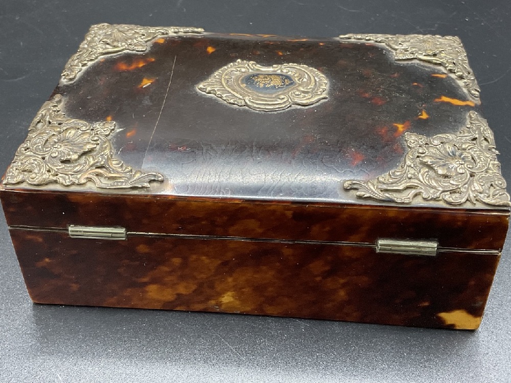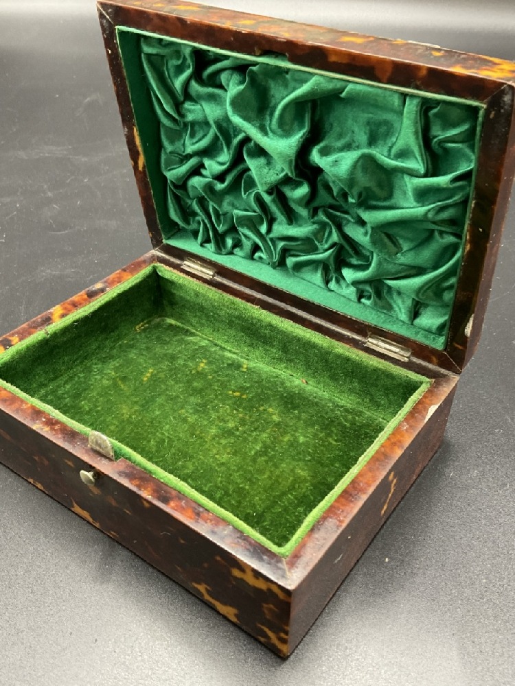 Antique velvet lined English tortoise and sterling silver jewelry box.