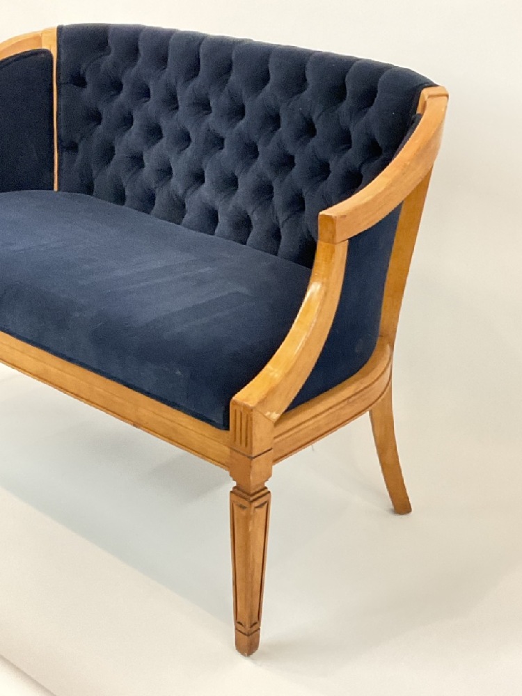 Biedermeier style maple sofa with button back blue velvet upholstery.