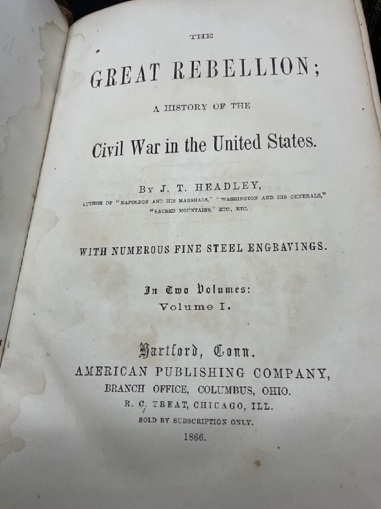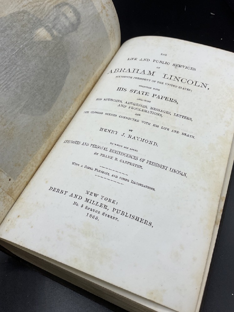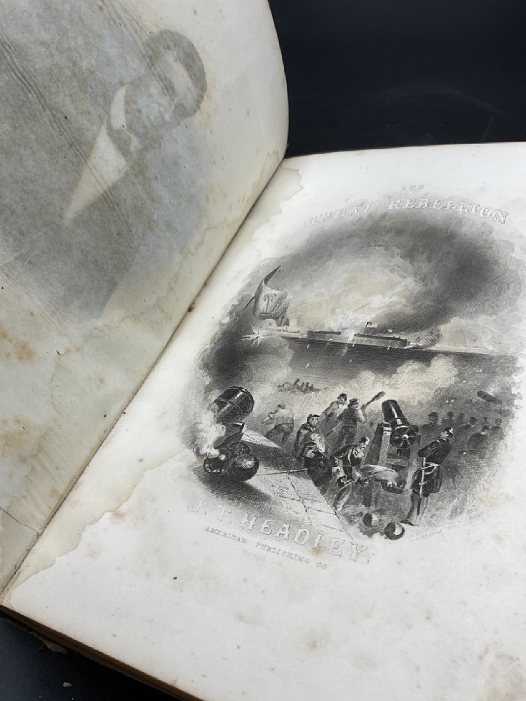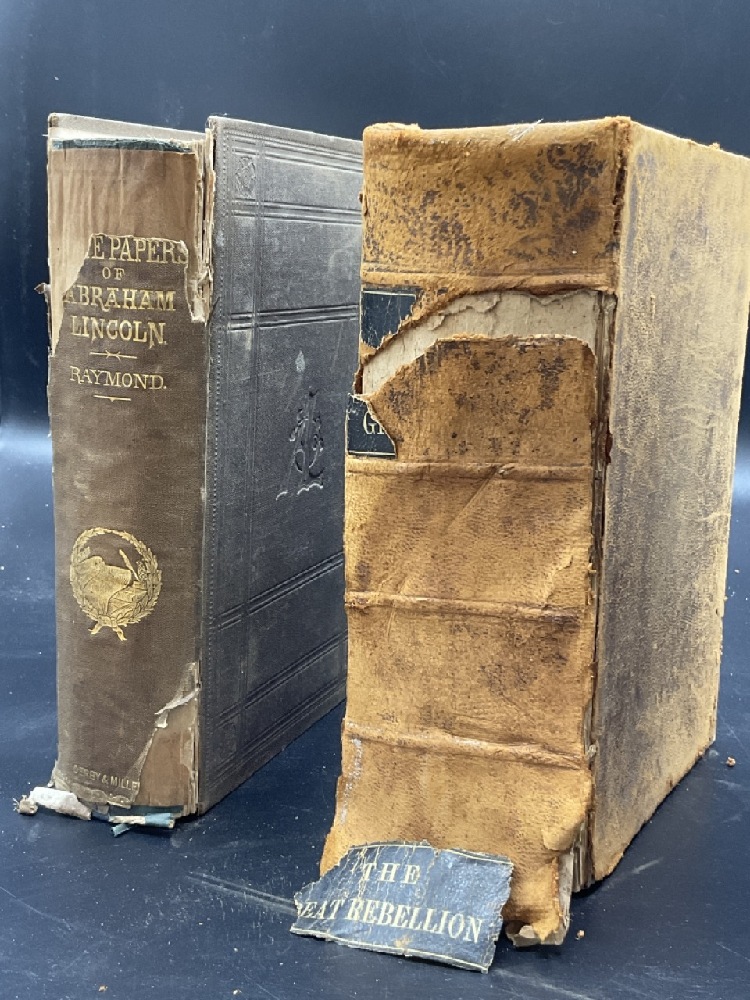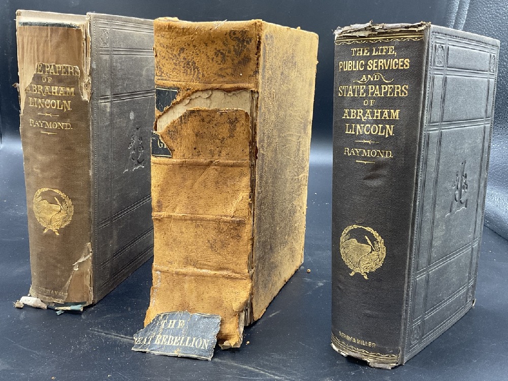 Two copies of Life Public Services and State Papers of Abraham Lincoln by Raymond Henry 1865 and The Great Rebellion Civil War of The United States 1866. Poor condition.