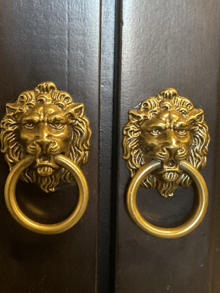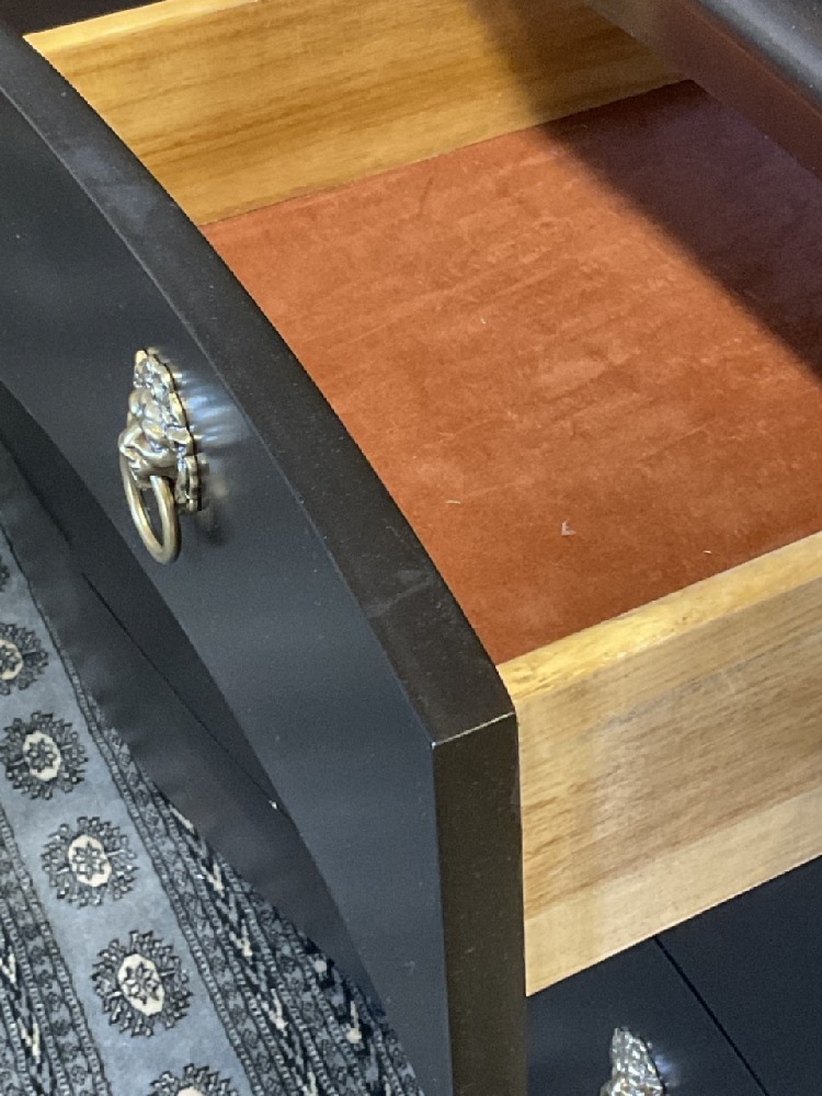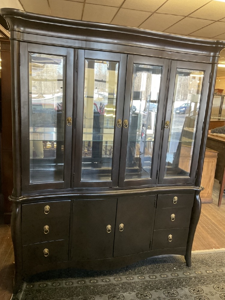 Contemporary lighted breakfront cabinet. Painted black with brass lion pulls.