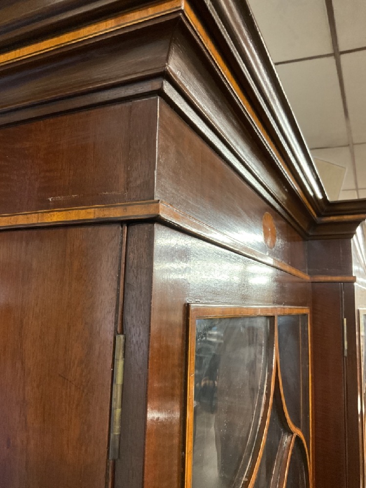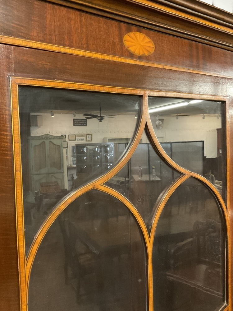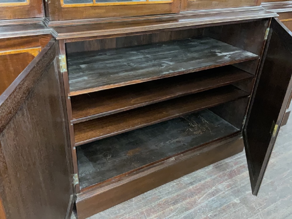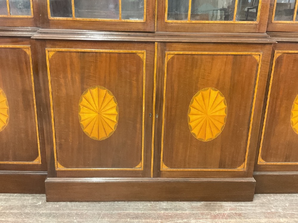 George III mahogany marquetry inlaid breakfront bookcase. New shelves needed. Keys present. Very fine cabinetry. 18th century.
