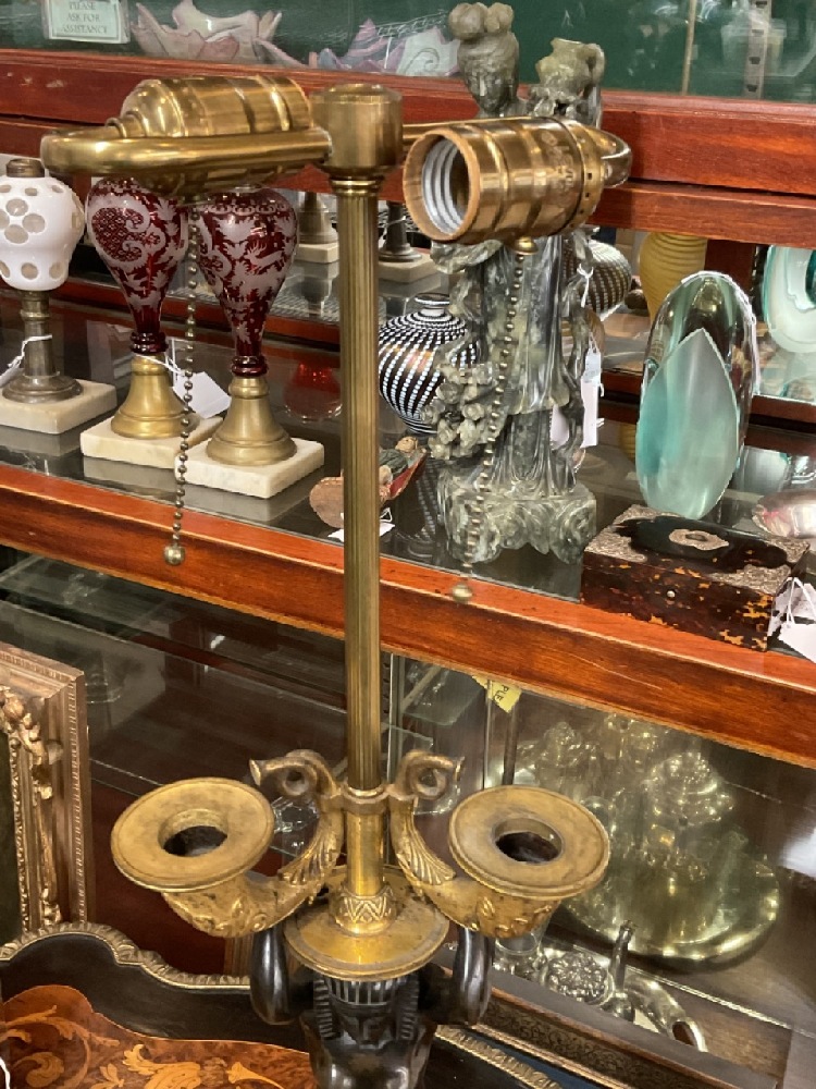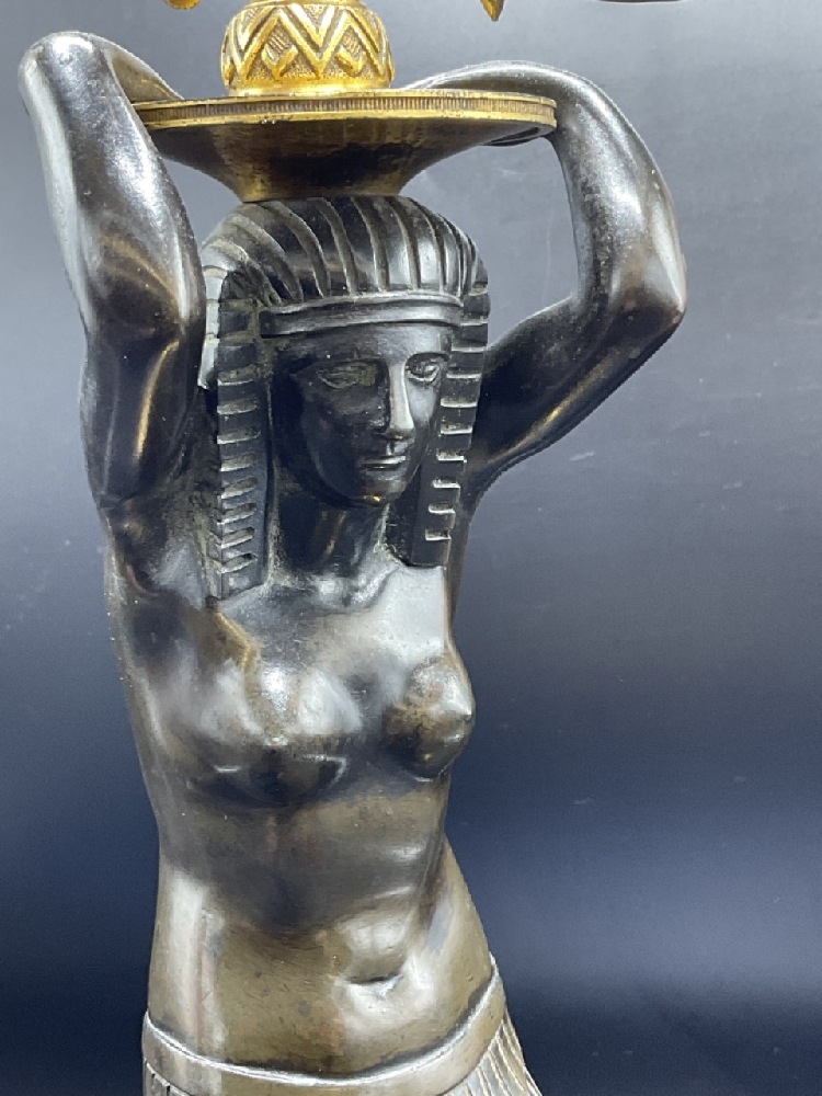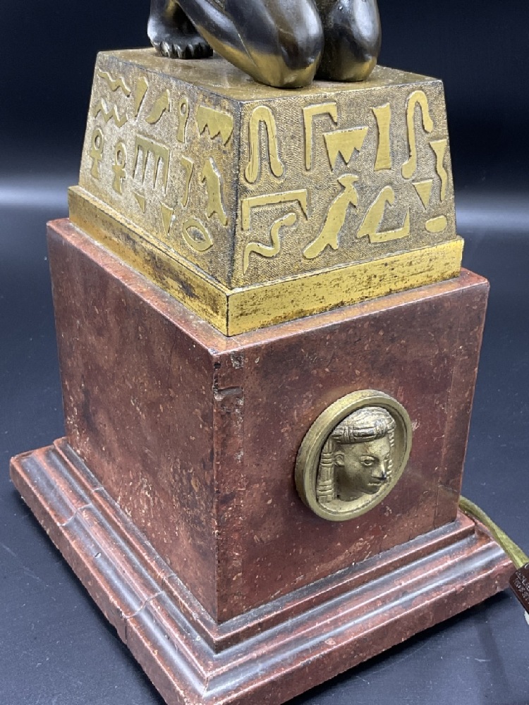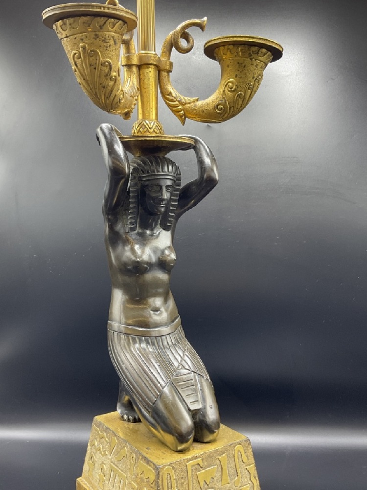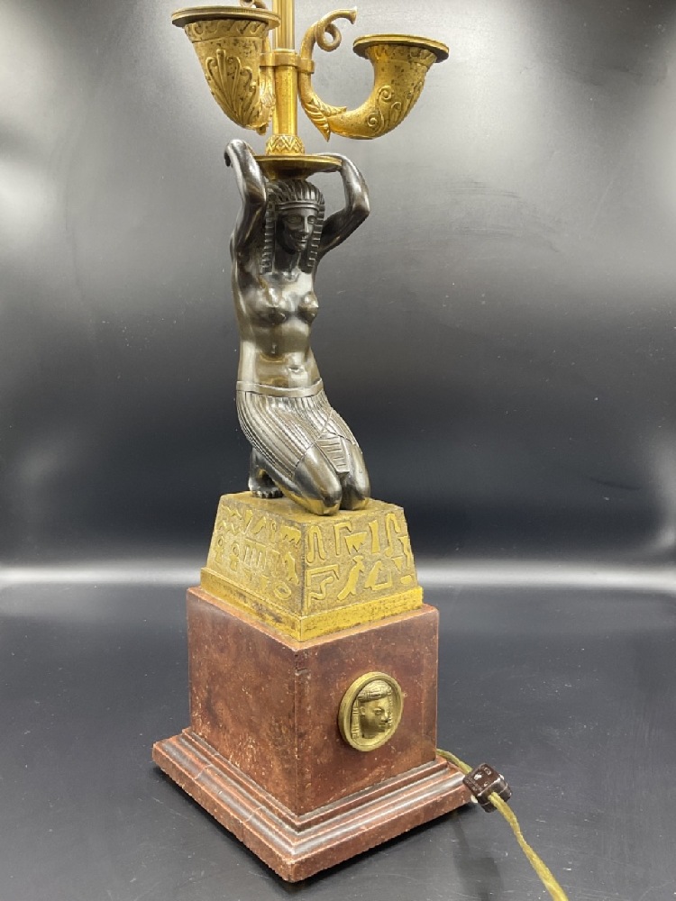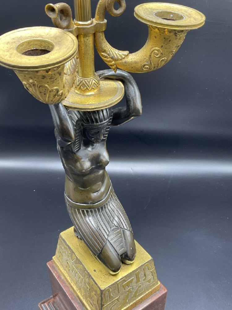 Egyptian Bronze Candelabra converted to electrified table lamp. Fine French gilt bronze with kneeling Egyptian Goddess set on a gold block atop a sierra red marble base.
