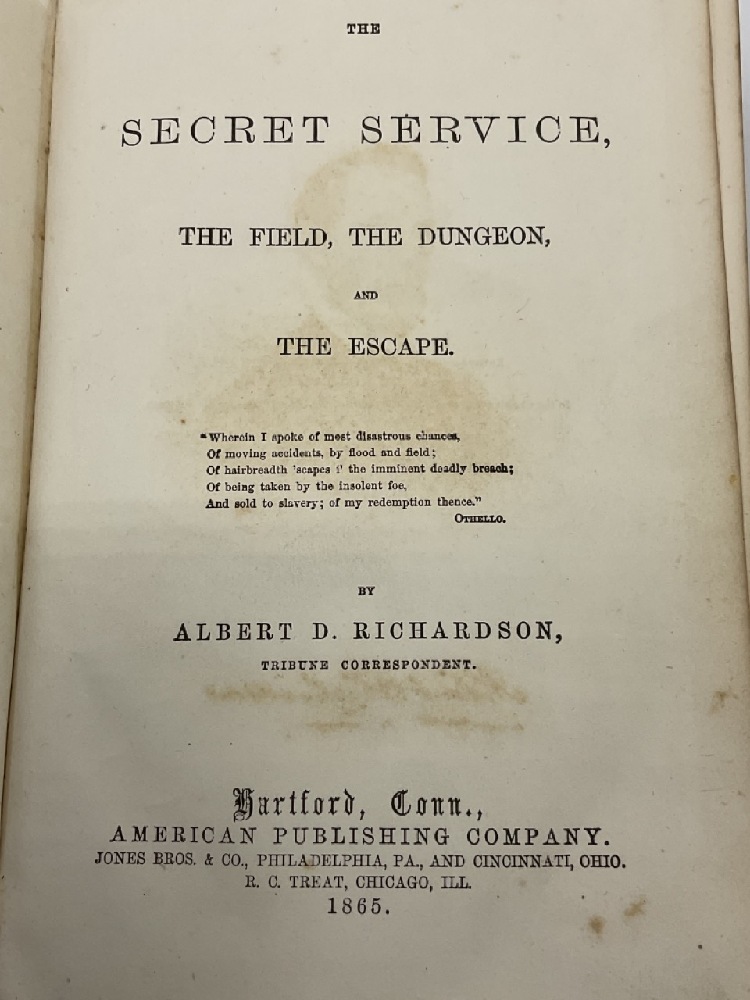 Two (2) Civil War Titles Albert G. Richardson, The Secret Service, The field, the dungeon and the escape 1865. 1st edition. frontispiece.