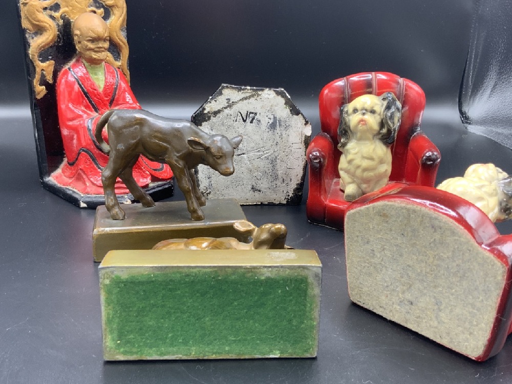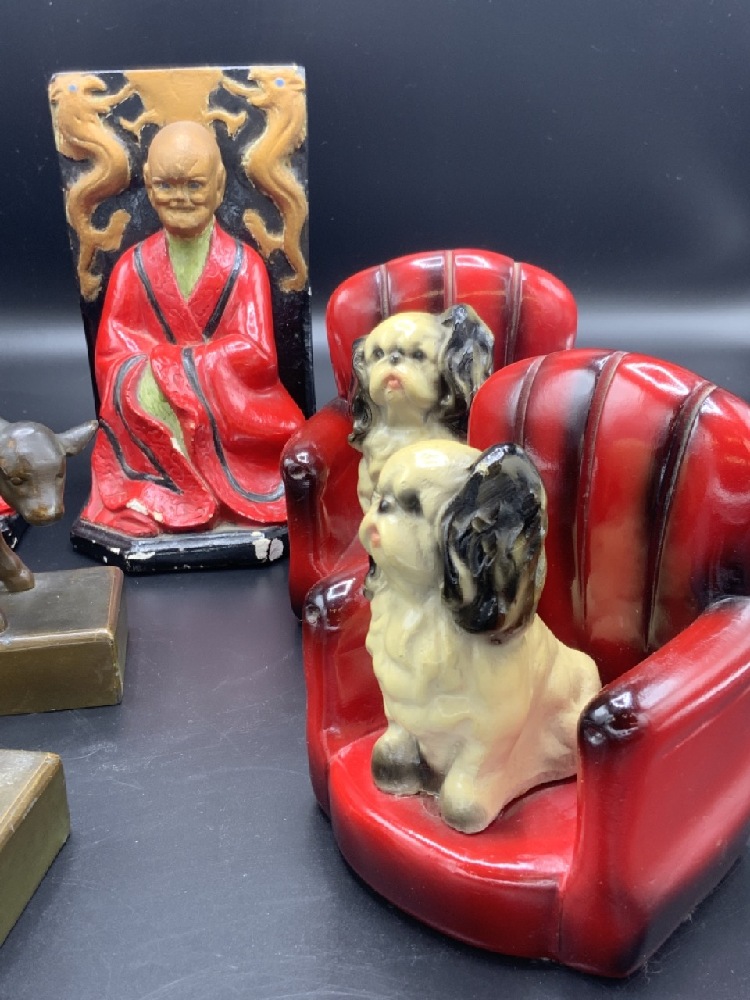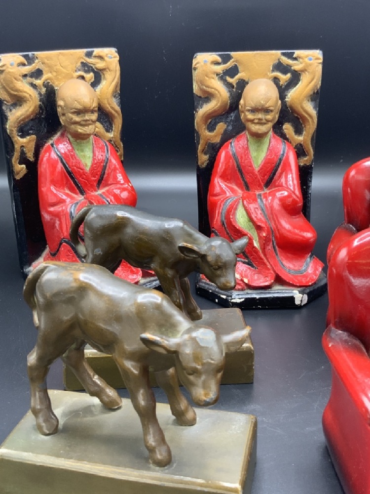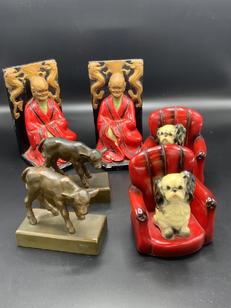 Compiled grouping of bookends. Chinese men, Puppy dog sitting on red chair and spelter calf bookends.