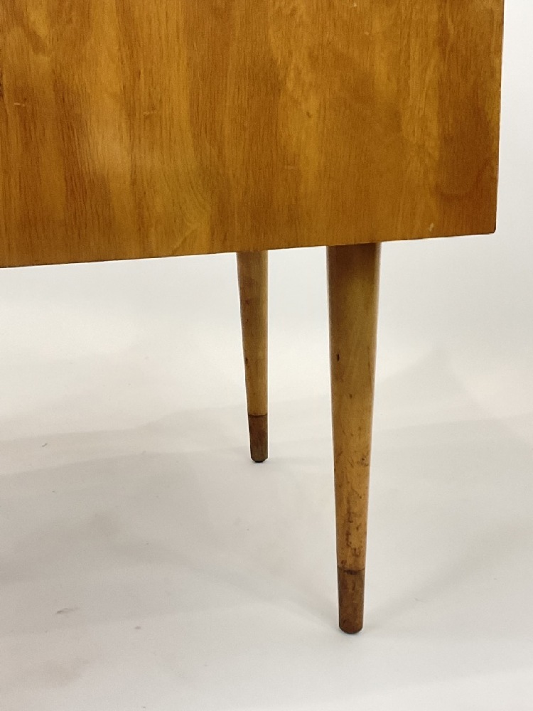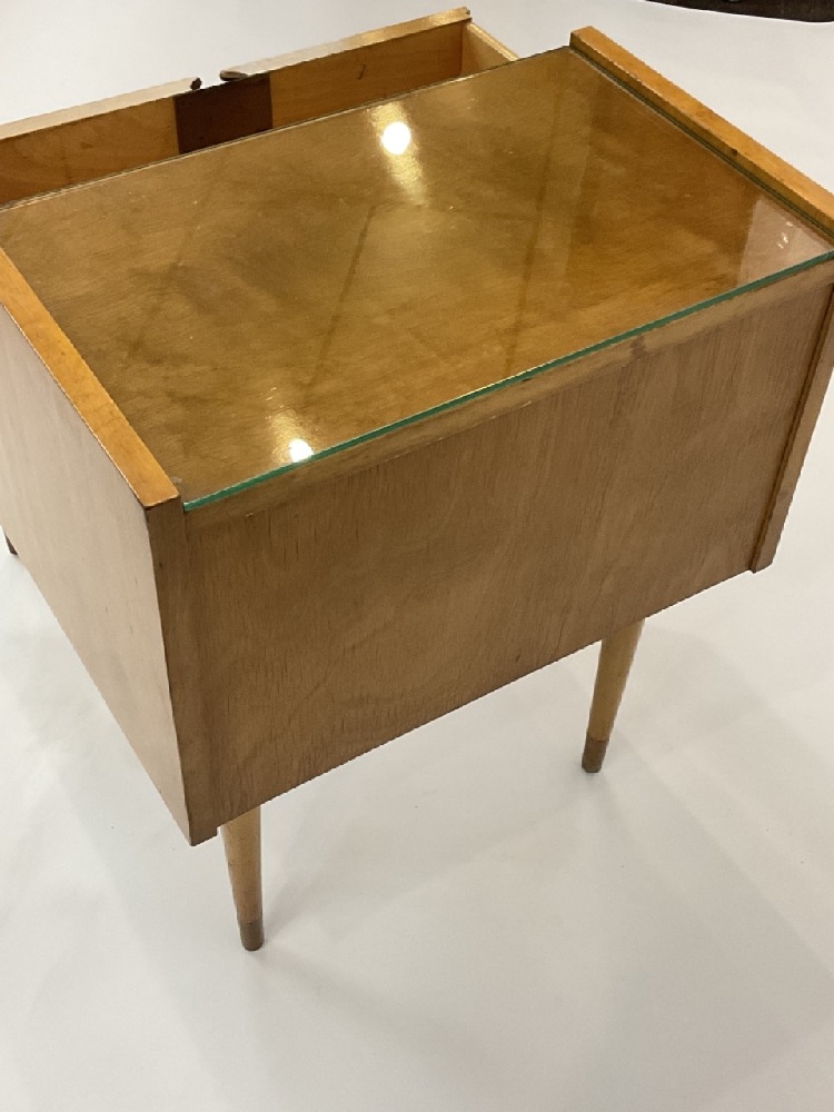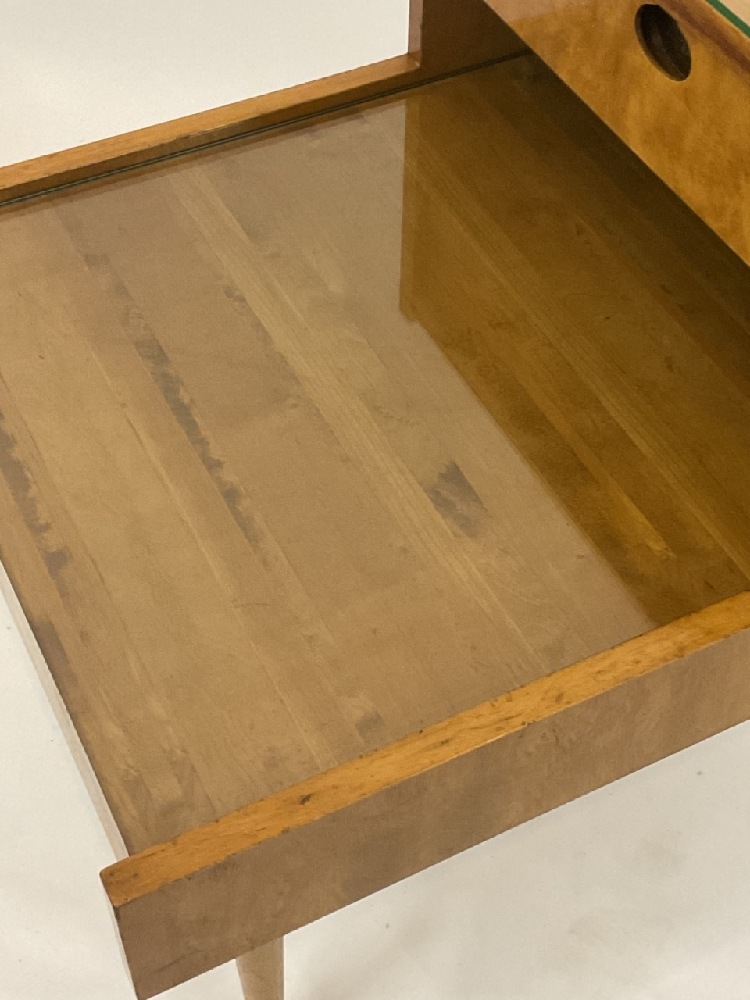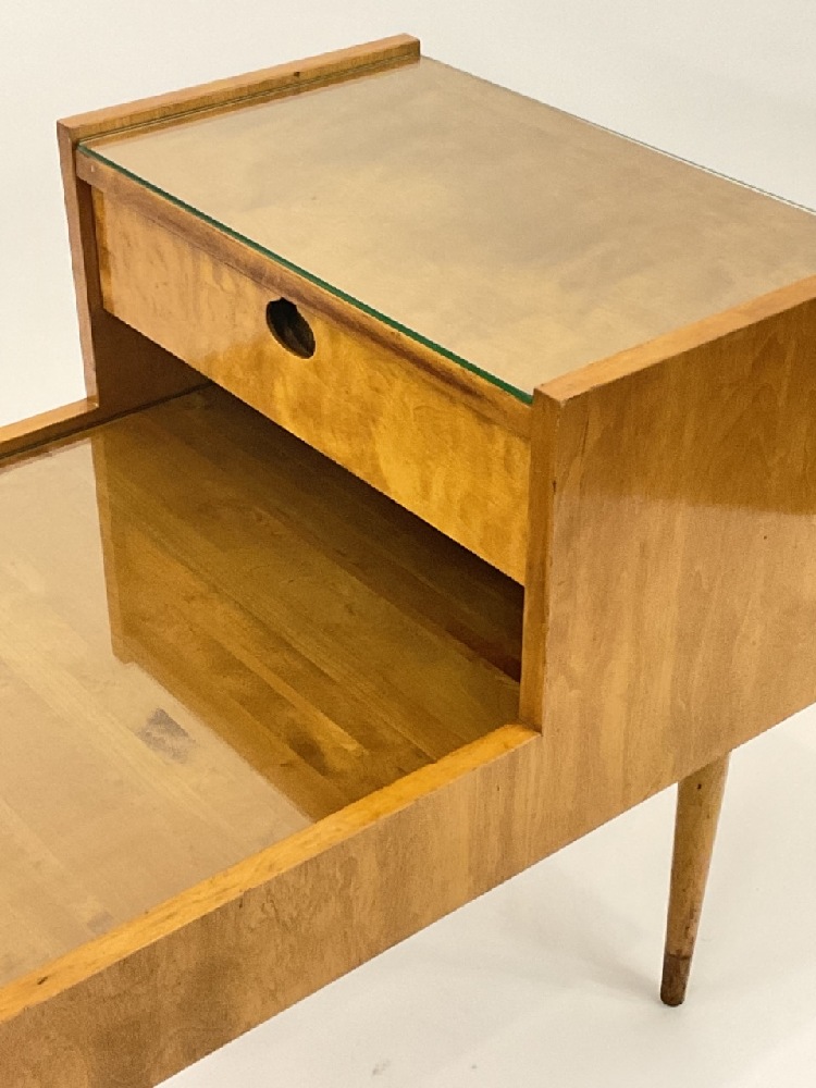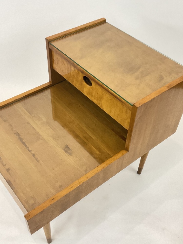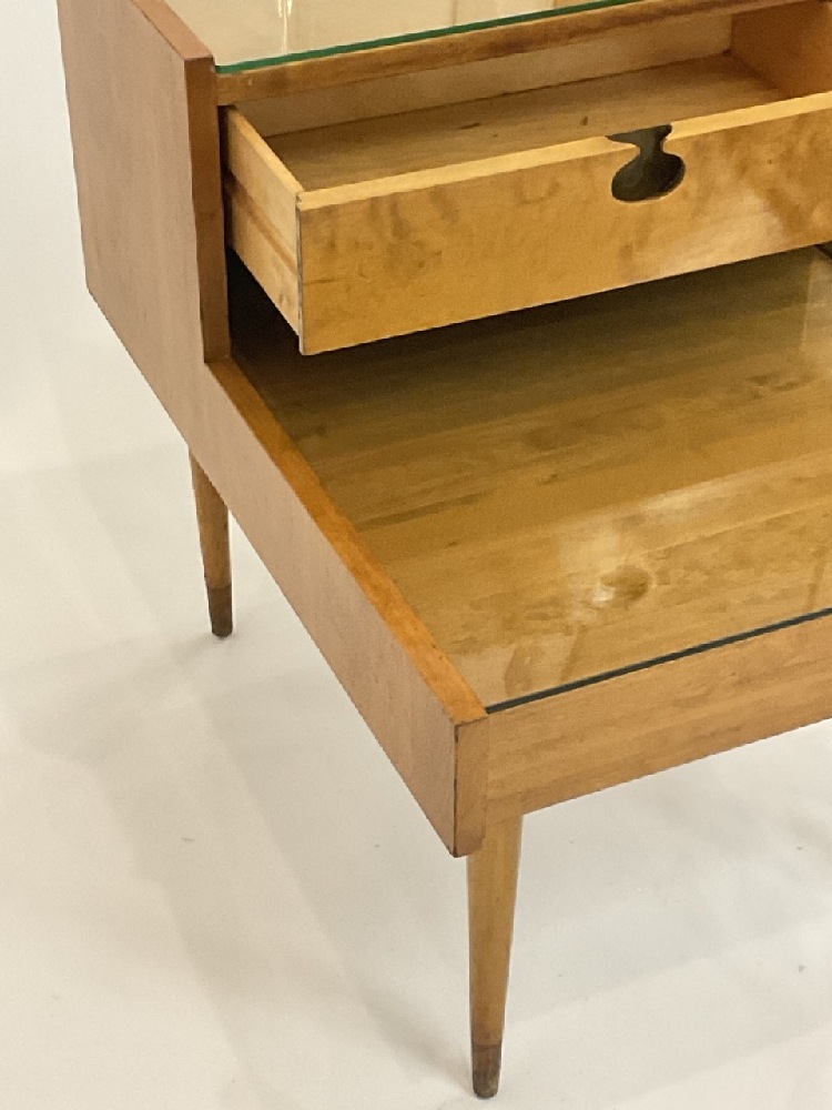 Edmund Spence end table. Original custom glass tops for both tears with one drawer. Unsigned. Very good condition. Please see photograph preview.