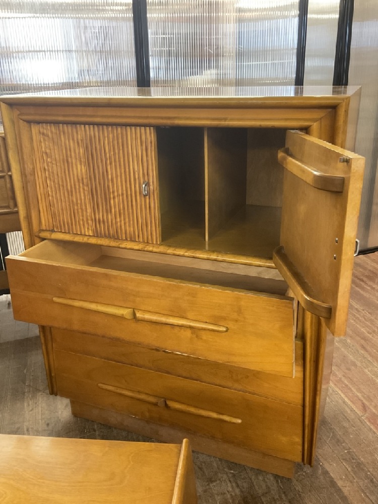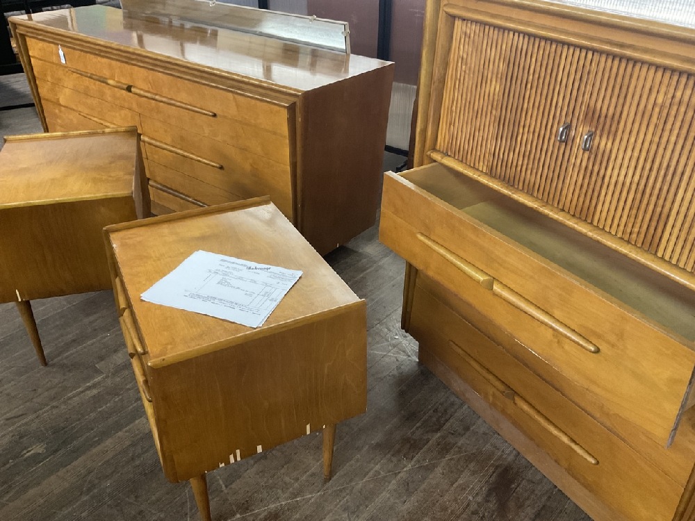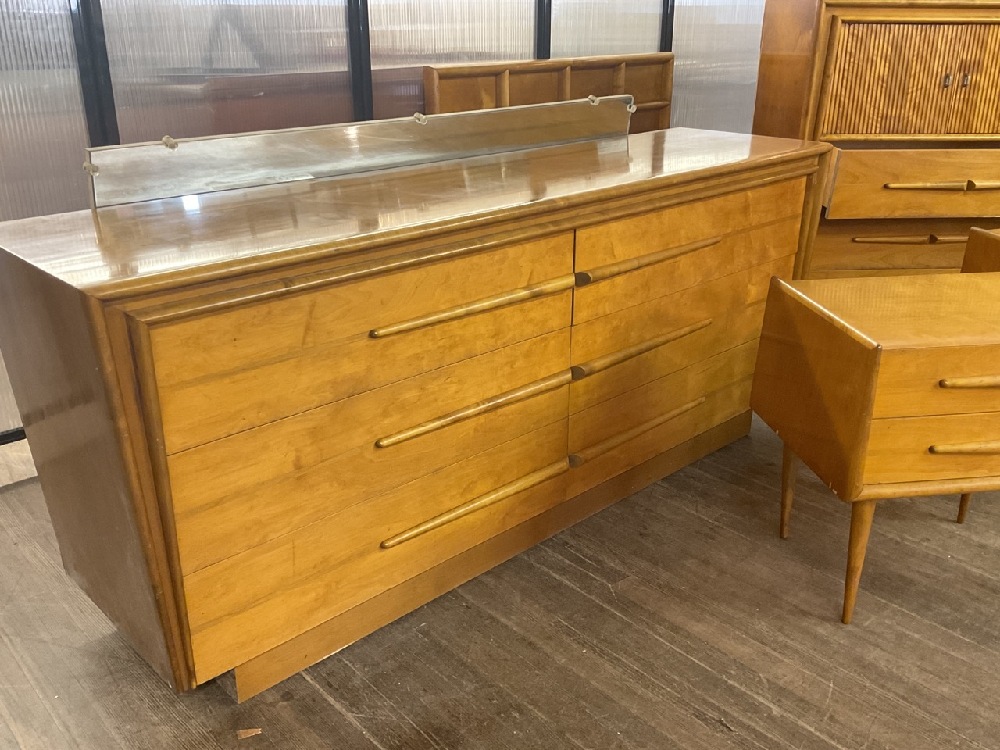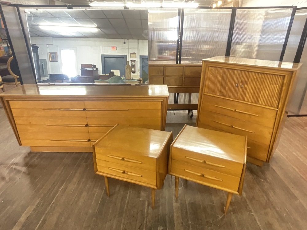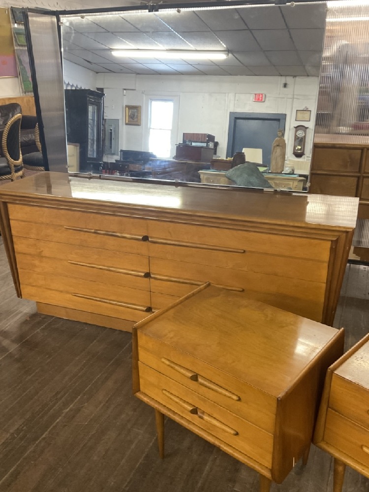 Edmund Spence bedroom suite. Dresser with mirror, bureau, two night stands and one full size headboard.