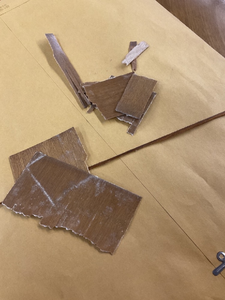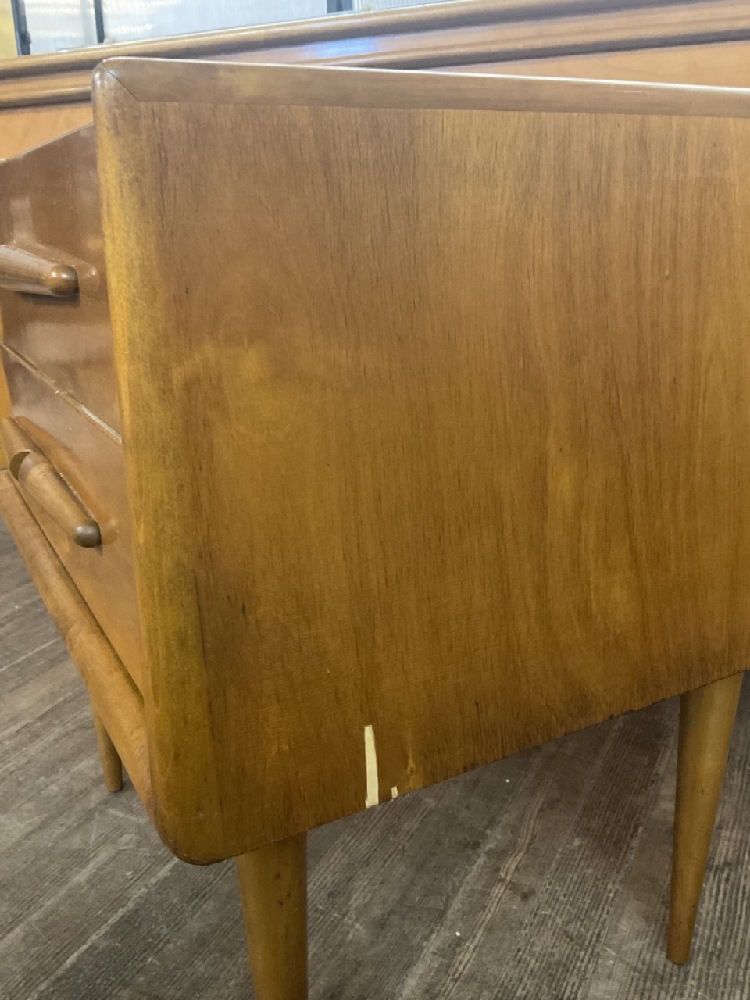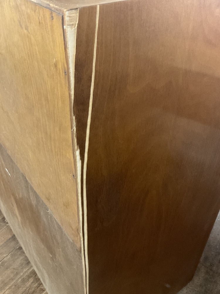 Set has several veneer chips and loss. Any loose pieces found have been collected and saved for restoration. Please see photograph preview. The most significant area being on the back left side of bureau and night stands.