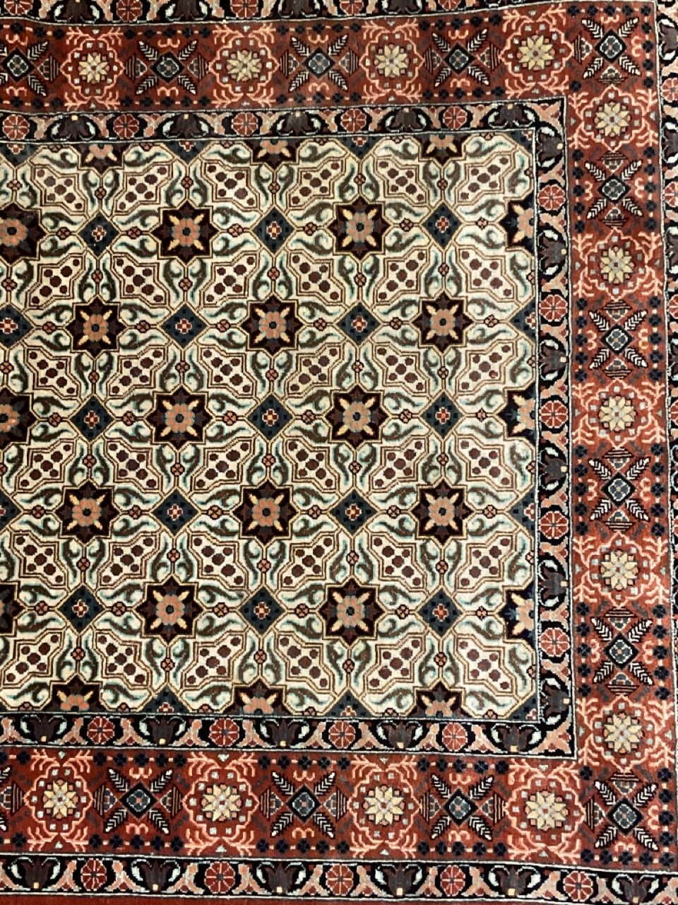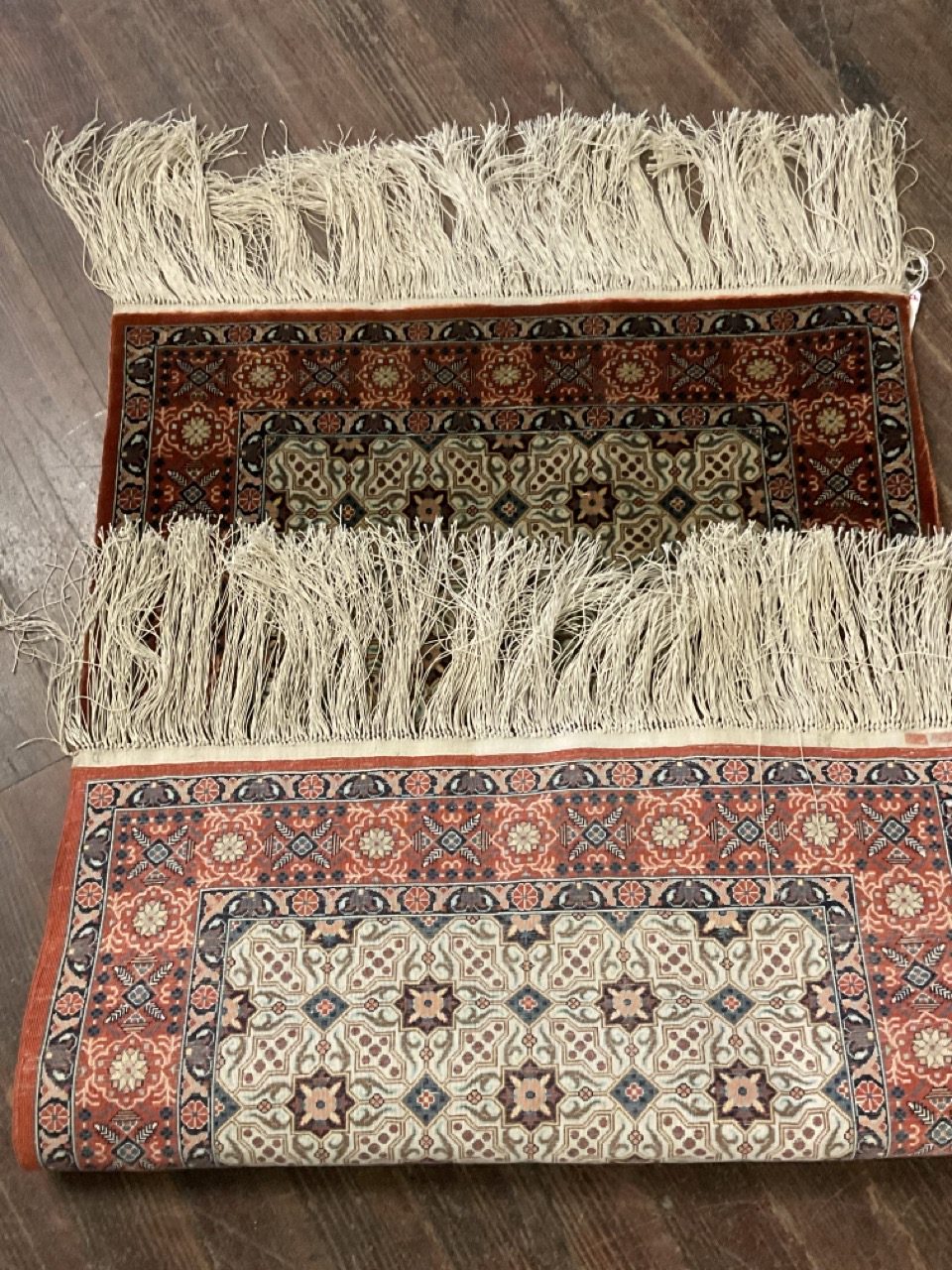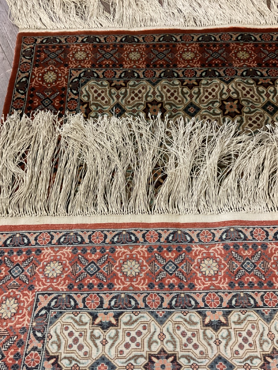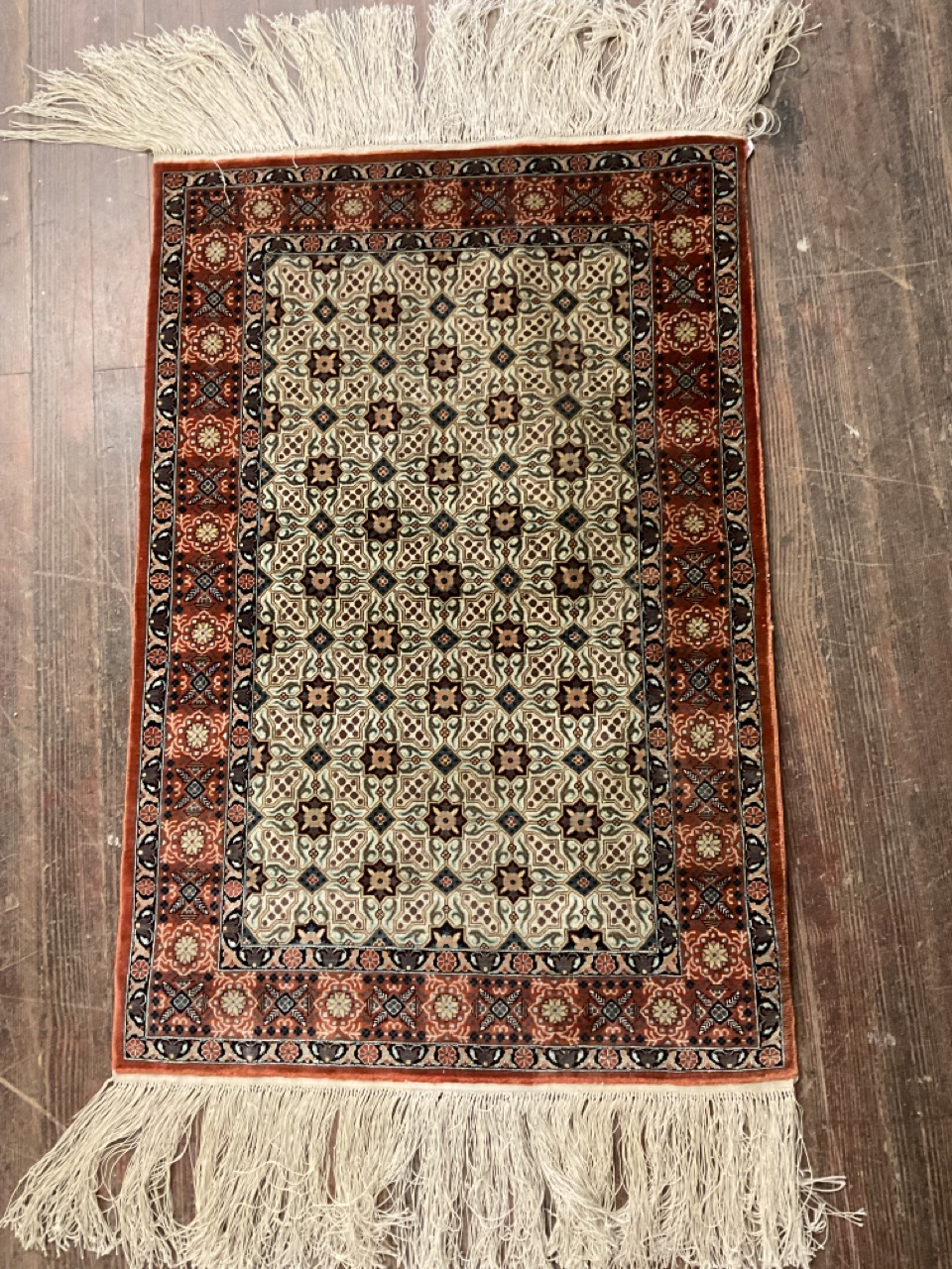 Fine Persian hand woven silk carpet. Dimensions: 4ft 2" X 2ft 6"