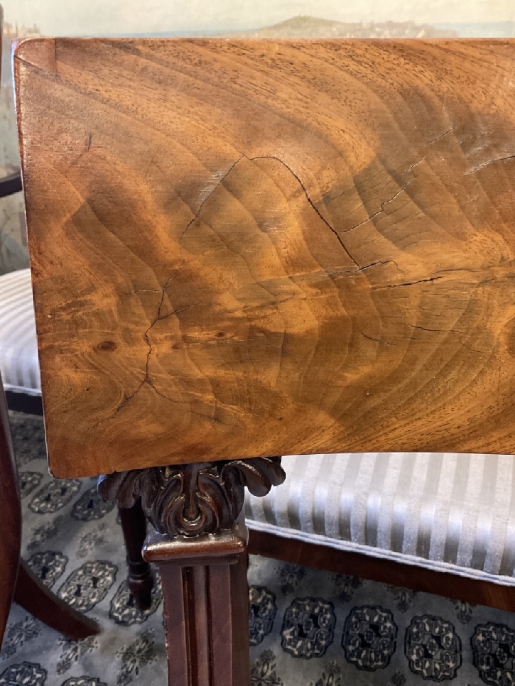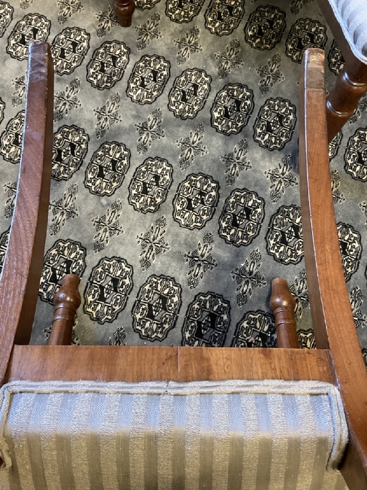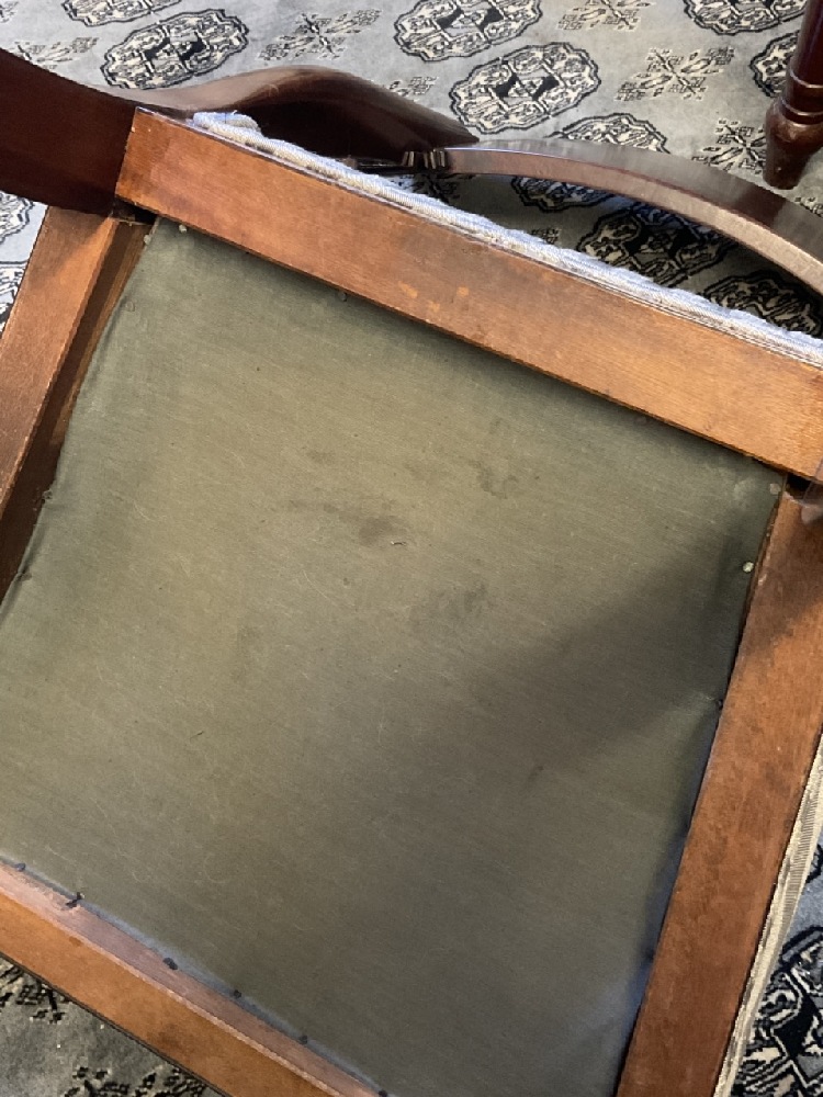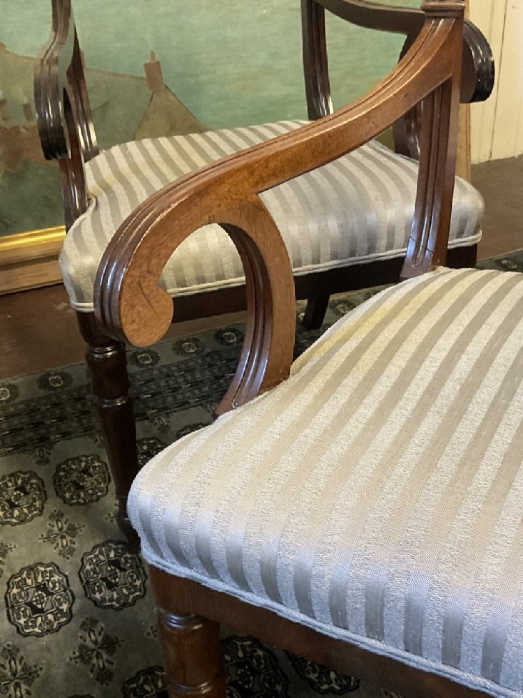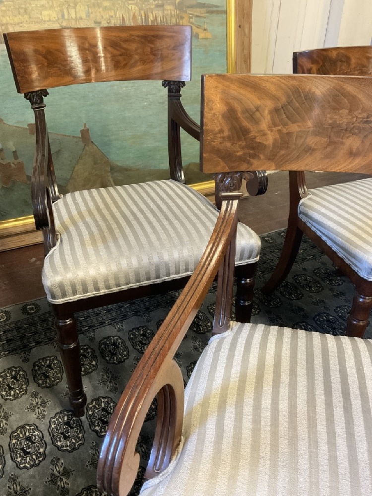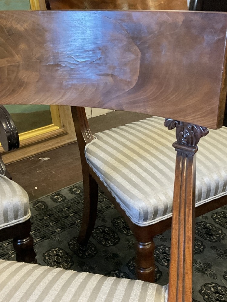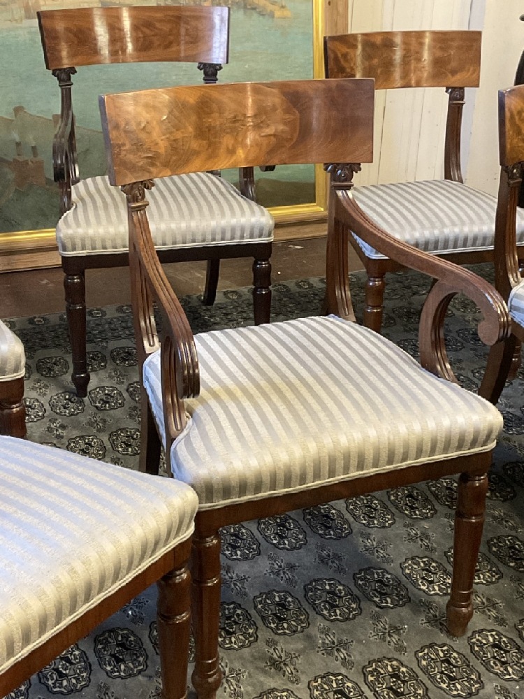A fine set of eight (8) mahogany Regency style dining room chairs. Six side and two (2) arm chairs. fine finish. Minimal wear. Chairs are sturdy and sound. Upholstery will need cleaning or replacement. Arm chairs note: one chair is darker in finish then the other. Please see photograph preview.