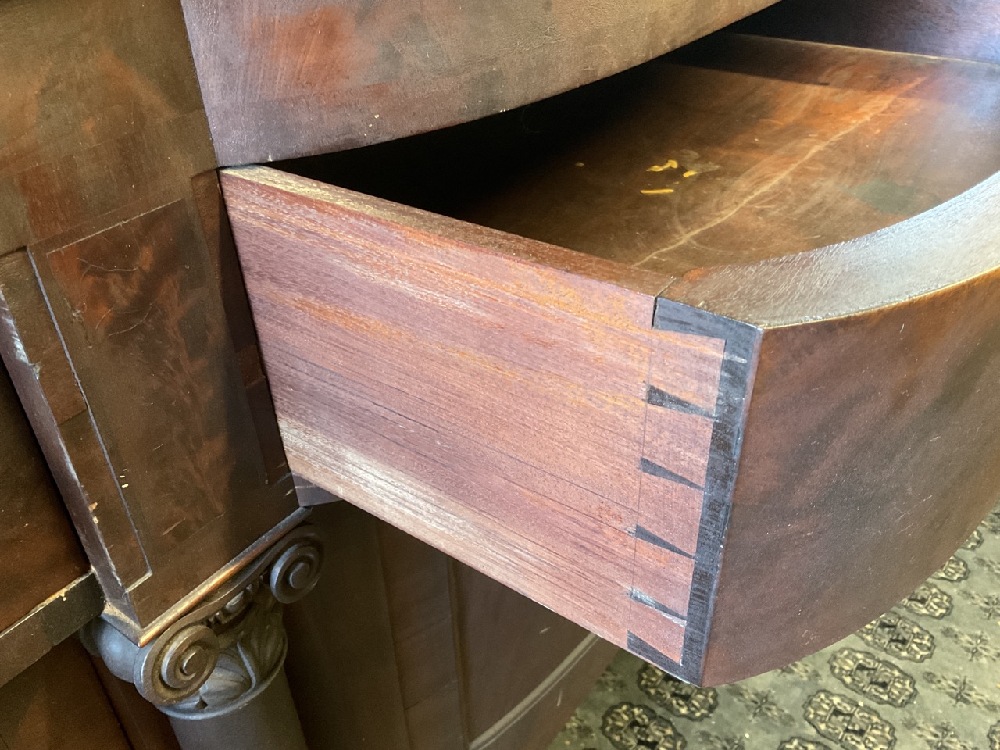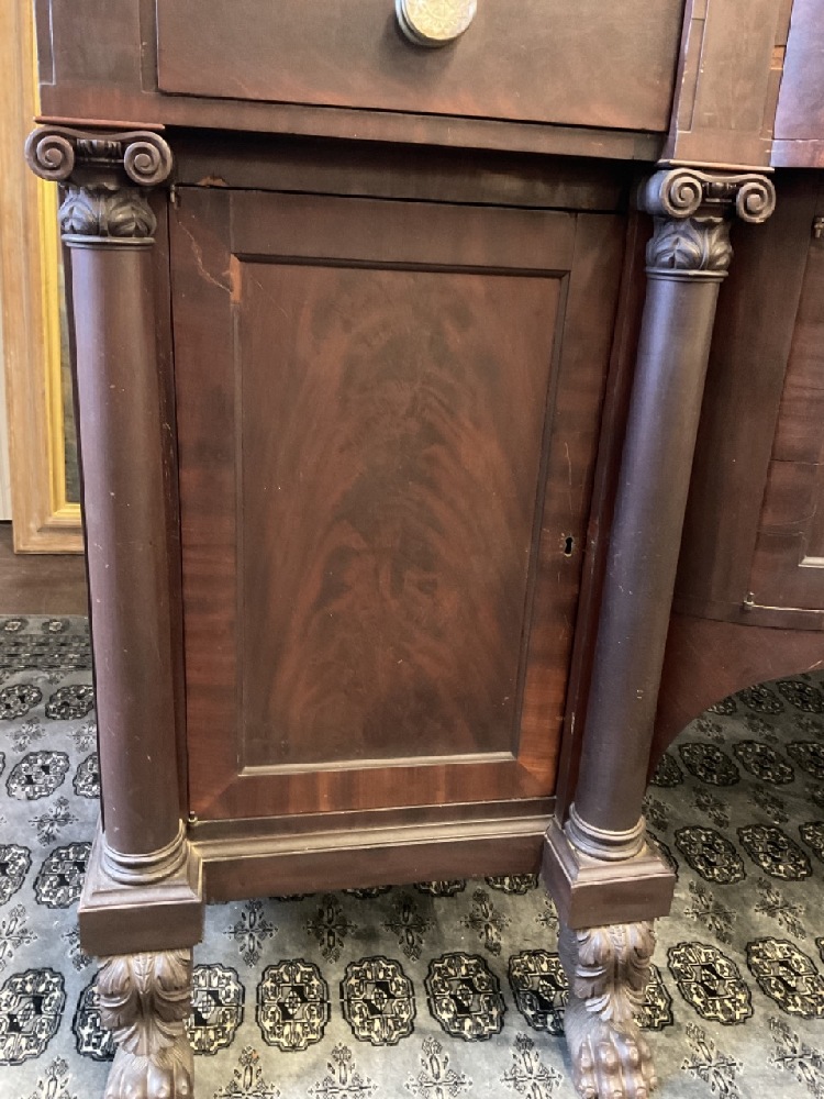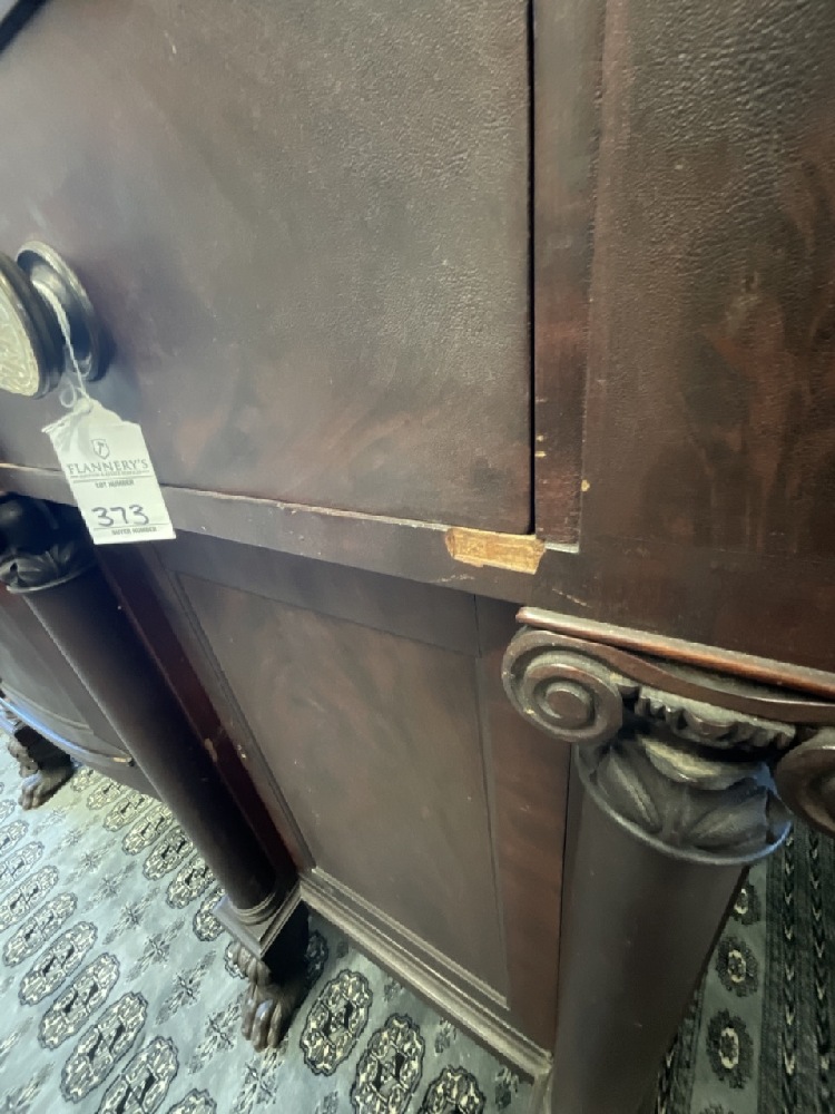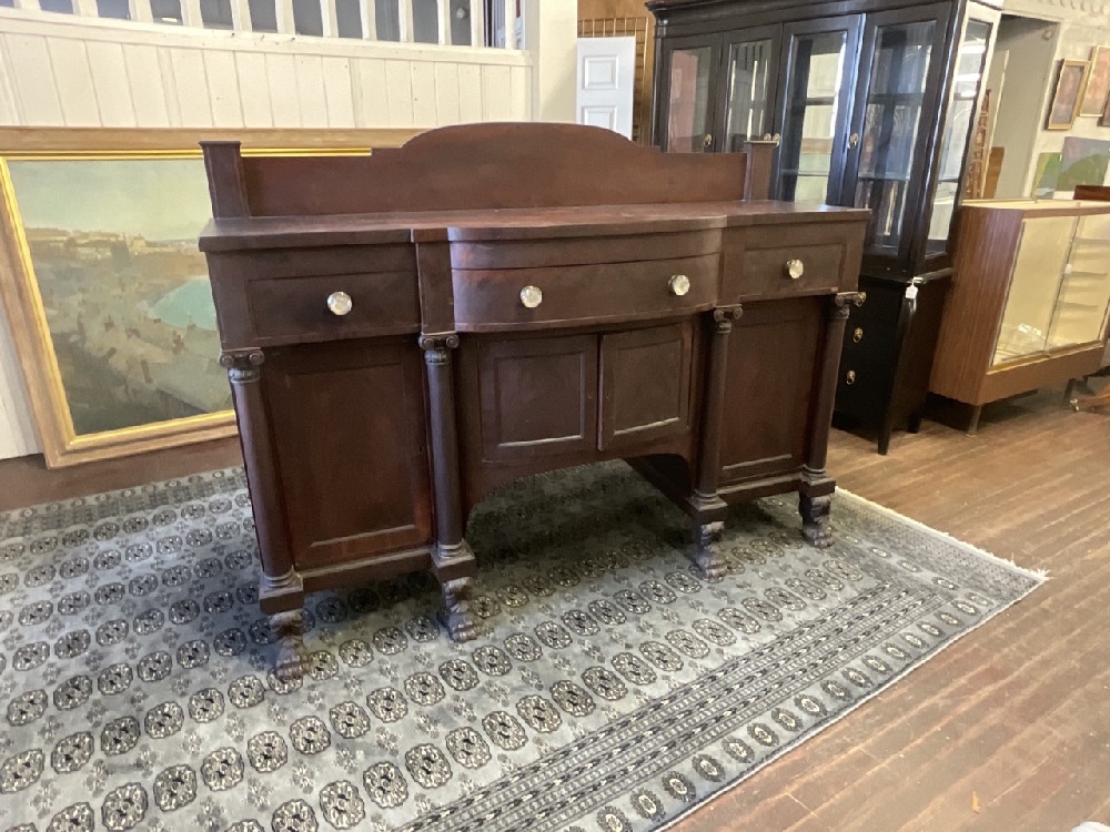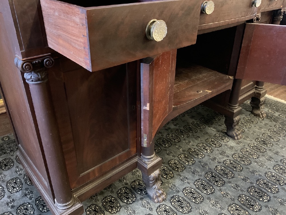 An Empire mahogany period sideboard with sandwich glass pulls, hairy paw feet and back splash. Some veneer loss noted.