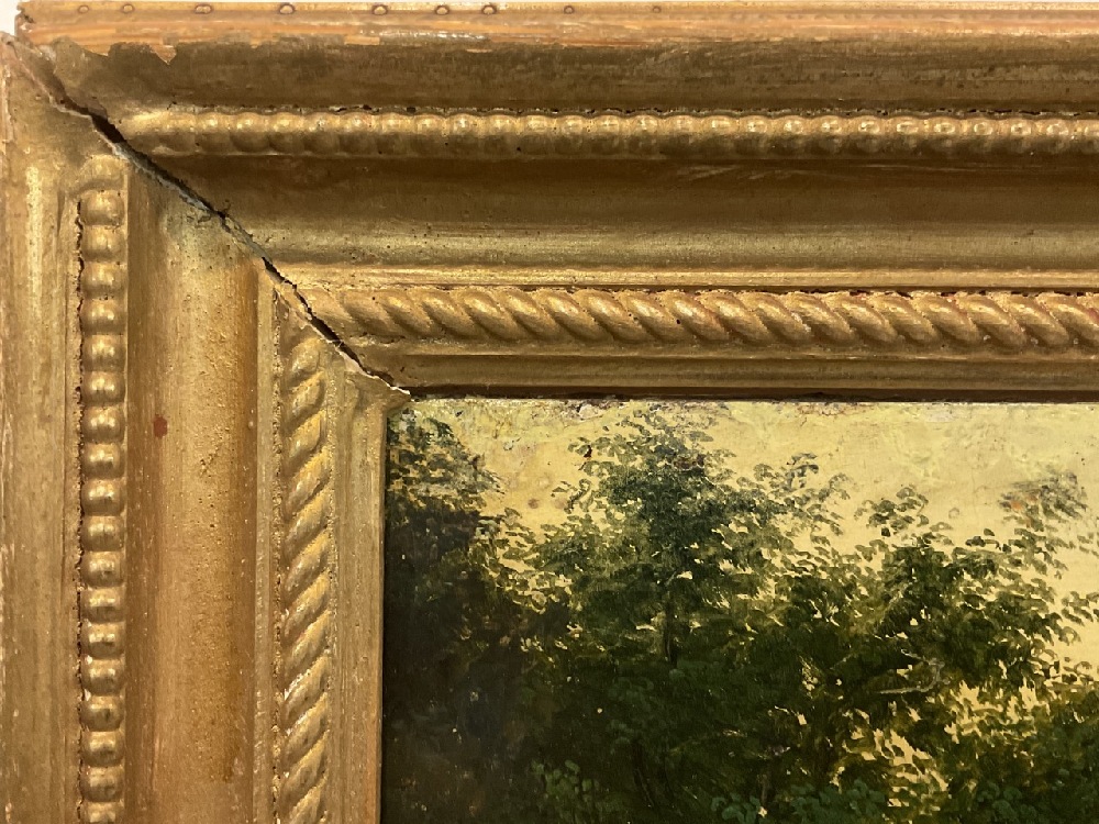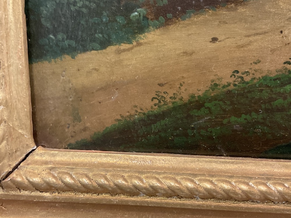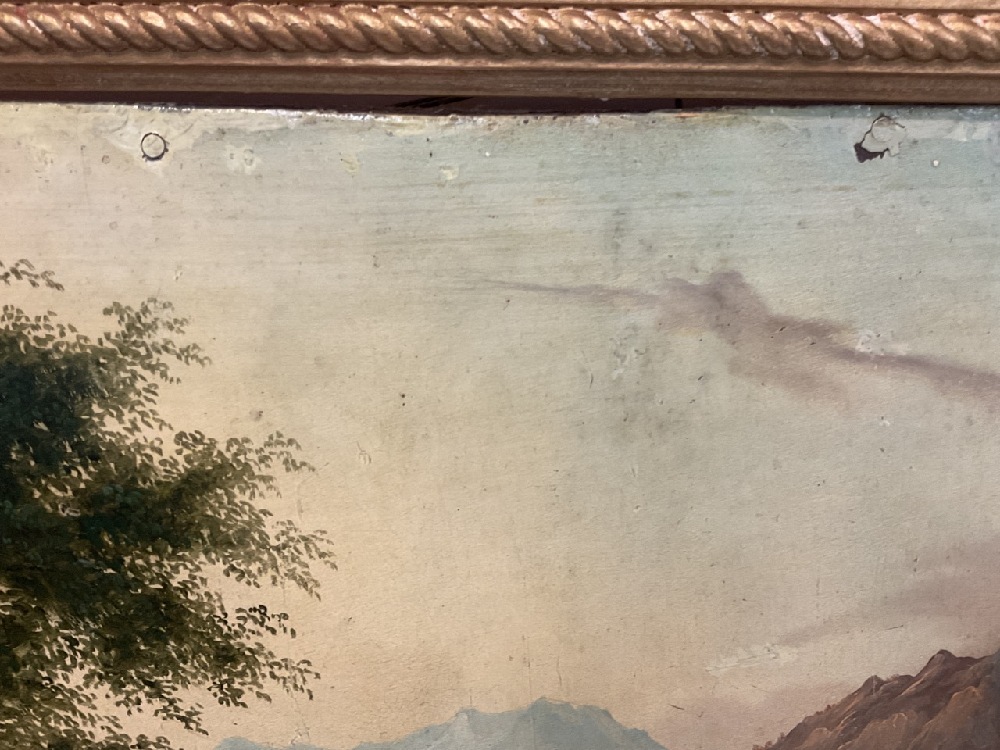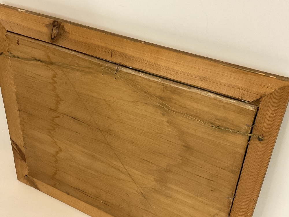 Appears to be professionally cleaned. A wood board was placed for a better backing and to keep painting properly placed in frame.