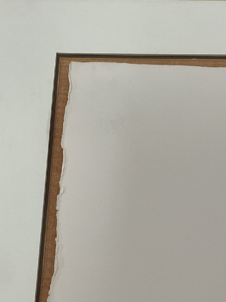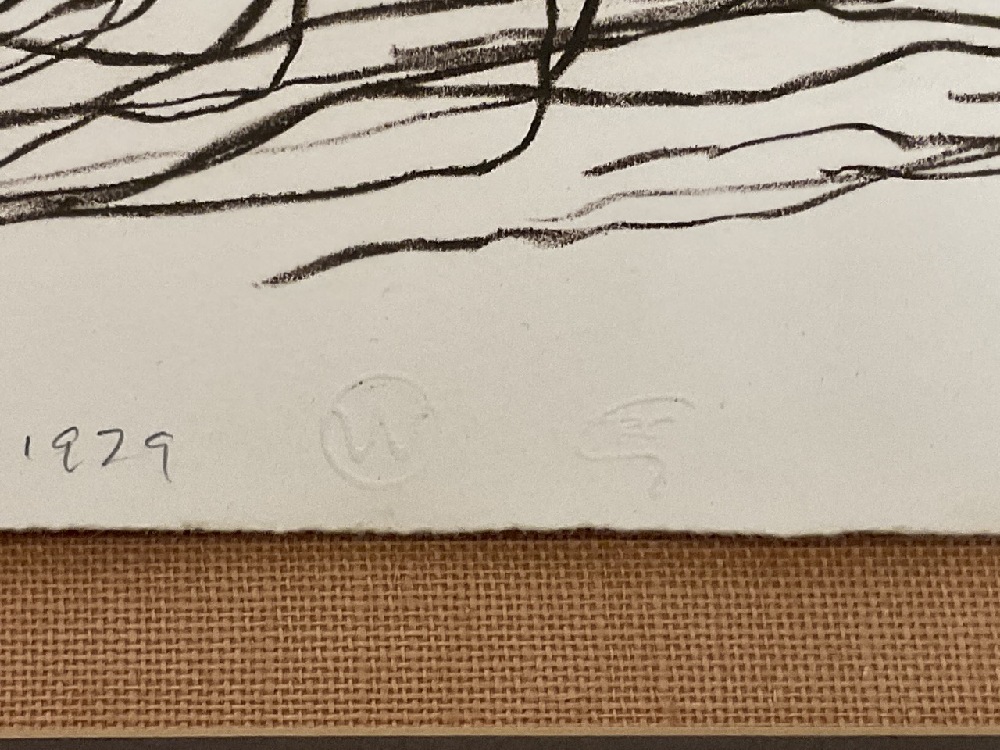 Glass removed. Artwork is loosely mounted in frame. Some staining noted. Cleaning needed. No tears. Please see photograph preview or call.
