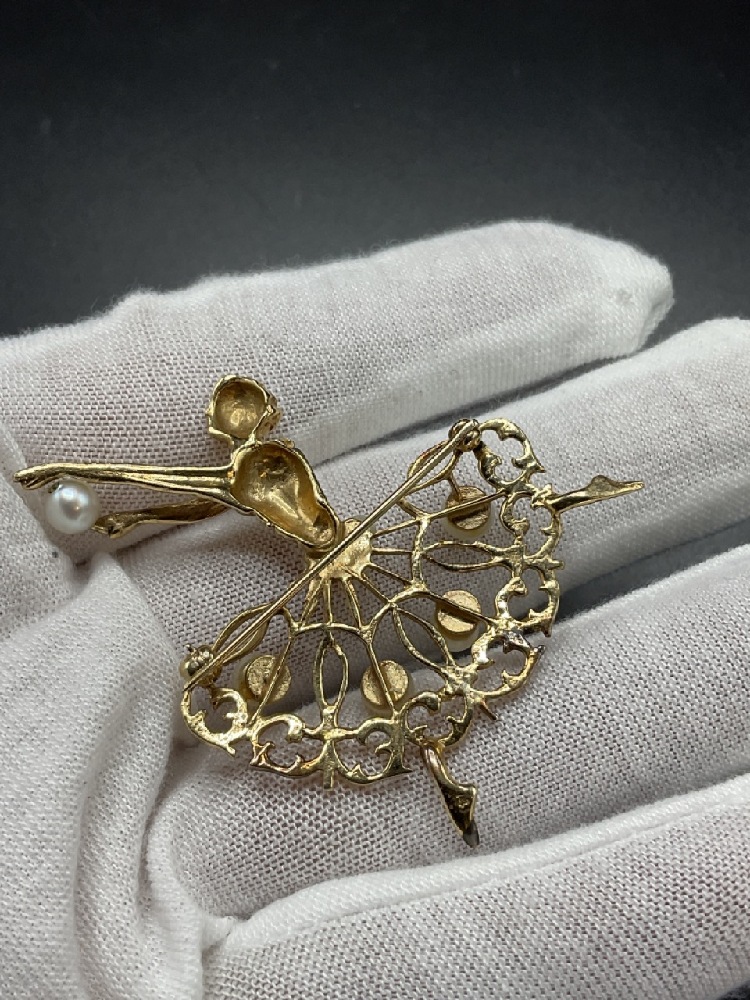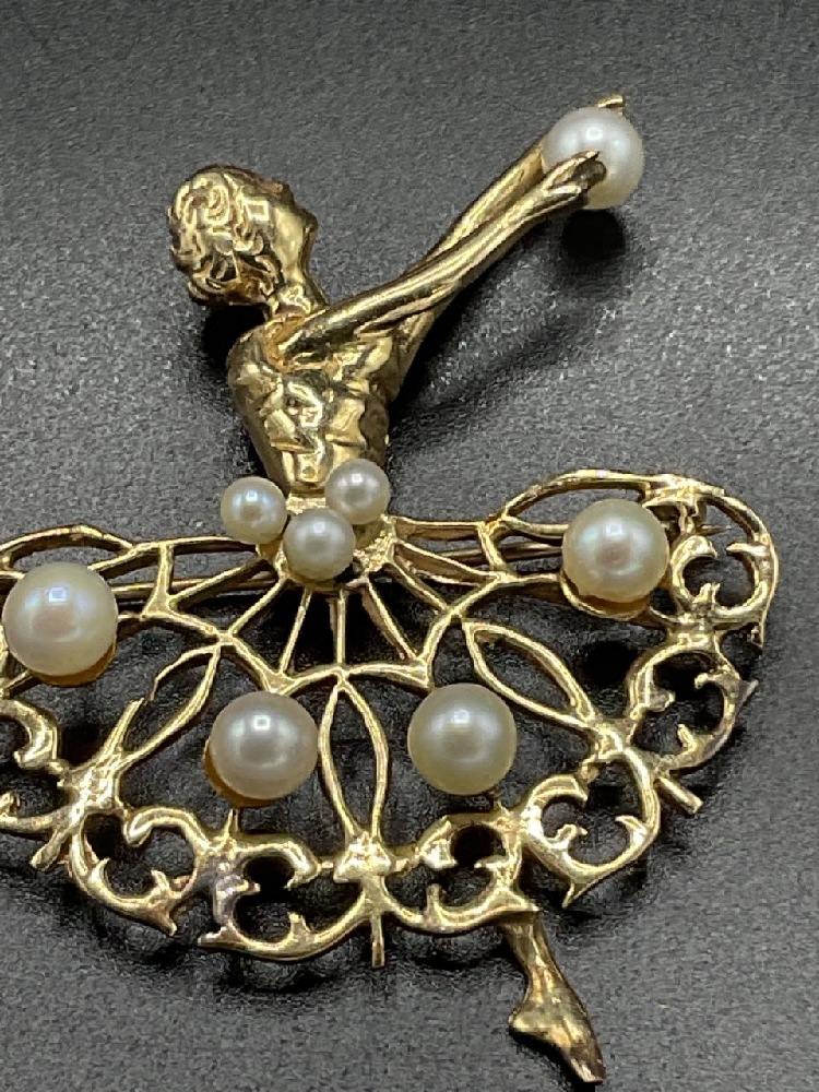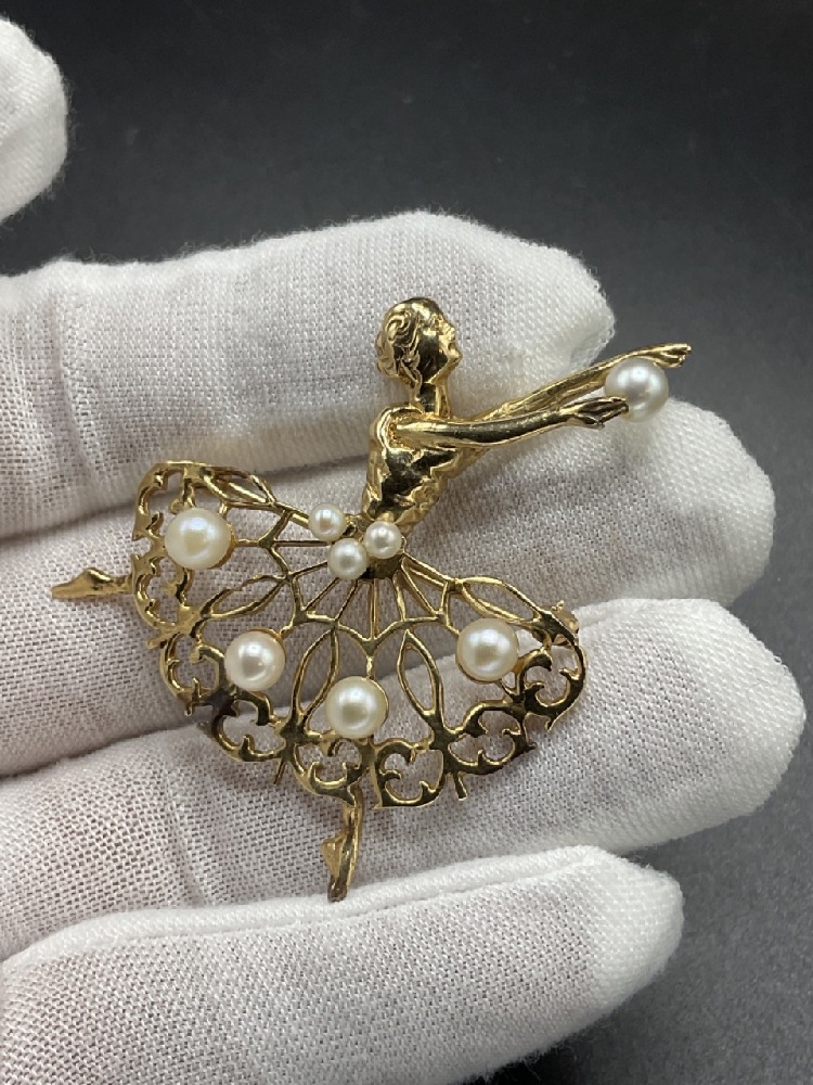 14K yellow gold ballerina dancer pin with freshwater pearls. c. 1950's.