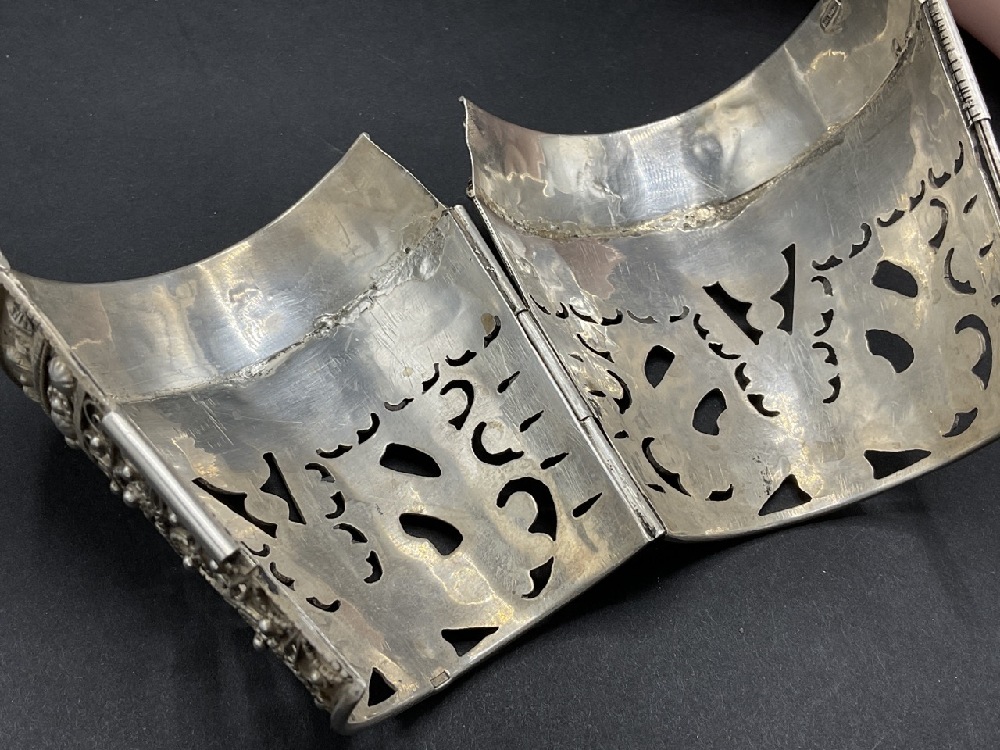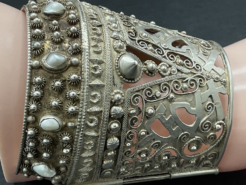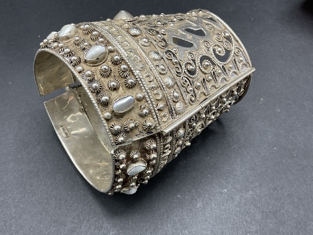 European 800 Silver Cuff Bracelet encrusted wtih mother-of-pearl. Signed 84 PFI. Probably Russian or Turkish.