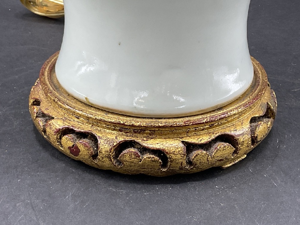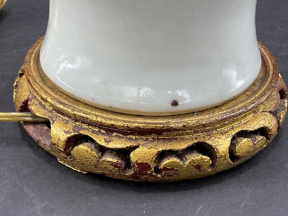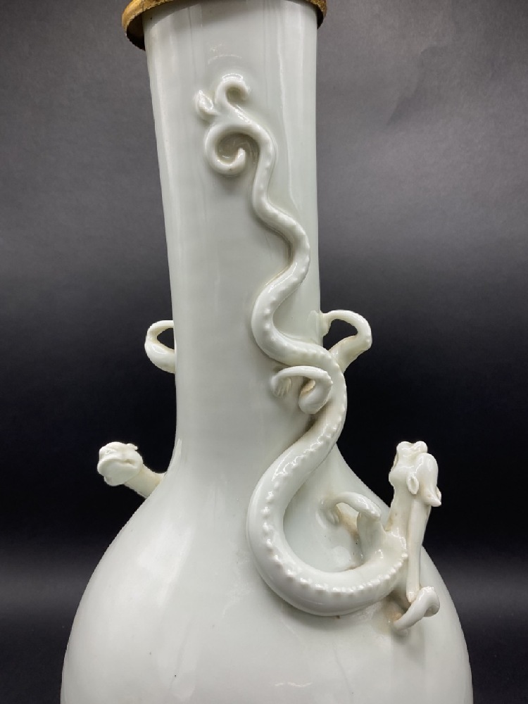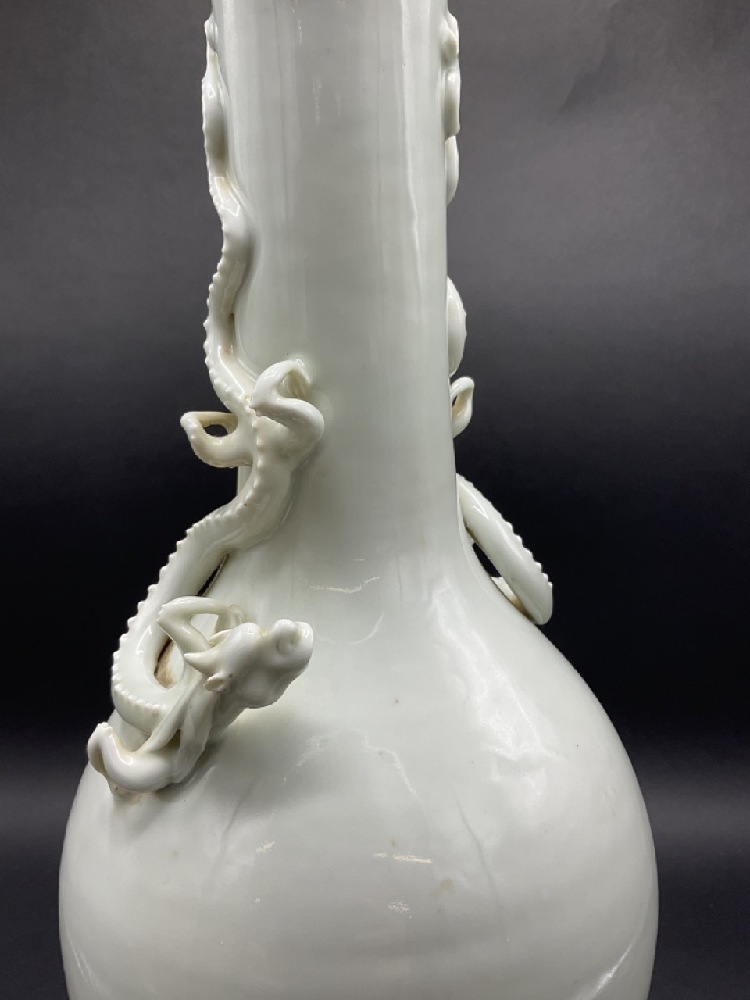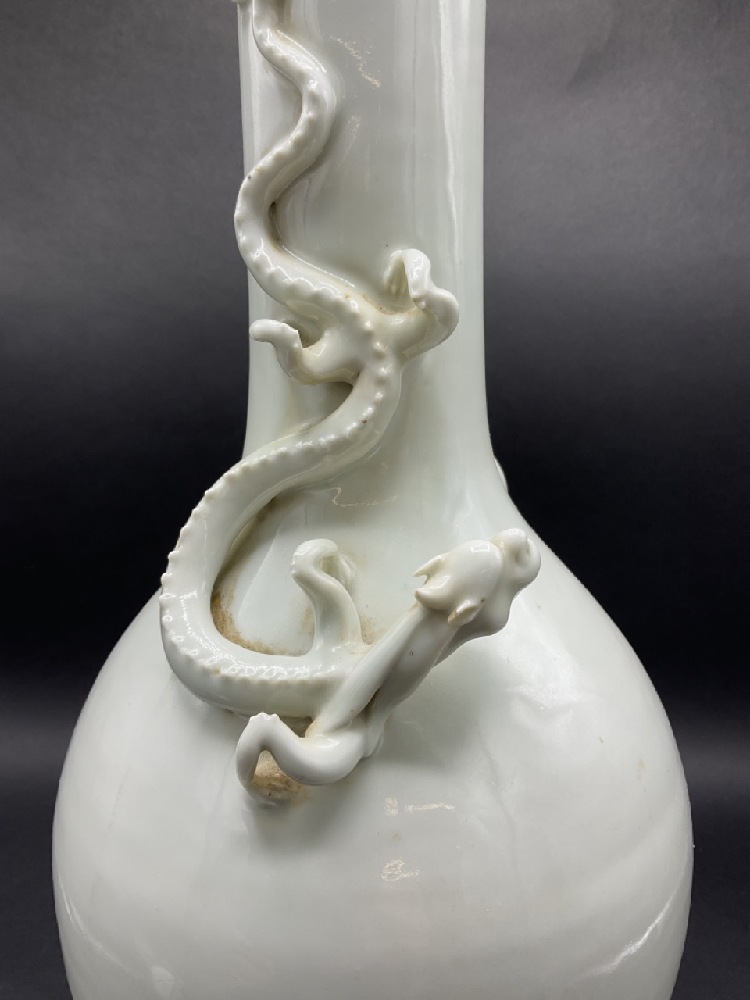Chinese Blanc De Chin white porcelain table lamp with dragons.