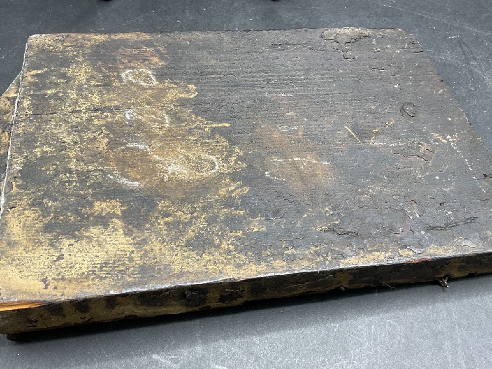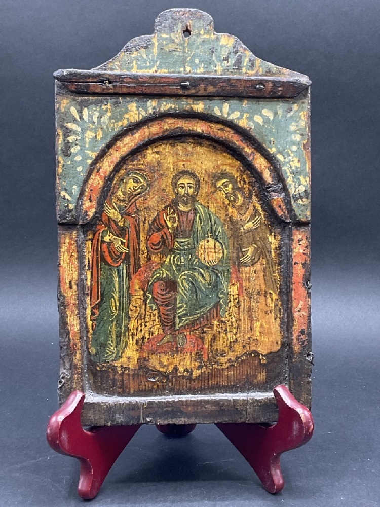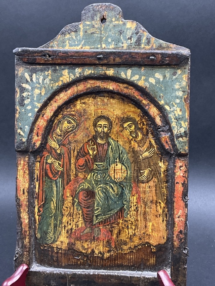 18th/19th century oil painted icon of Jesus Christ with Mary and John the Baptist.