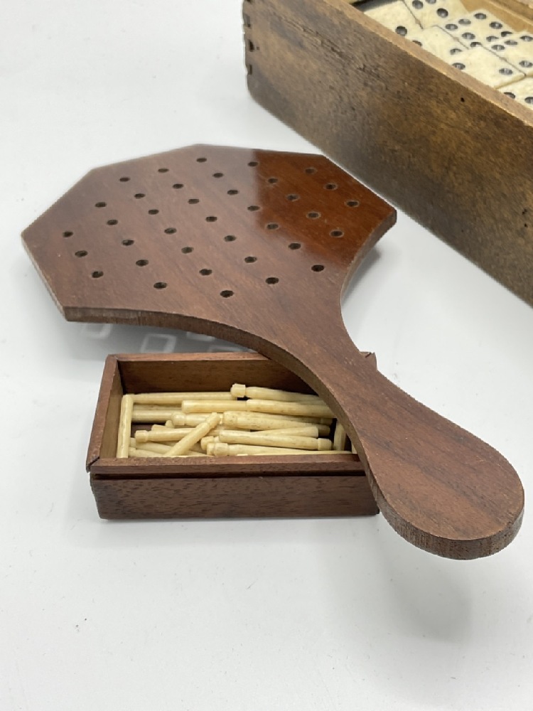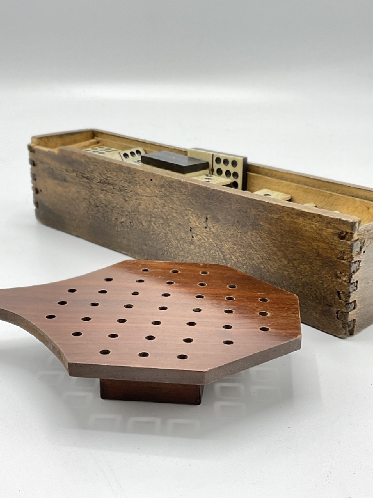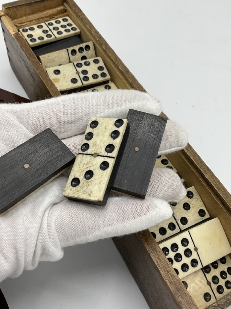 19th c. Solitaire peg game and assorted Ebony and bone dominoes. As seen in photograph preview.