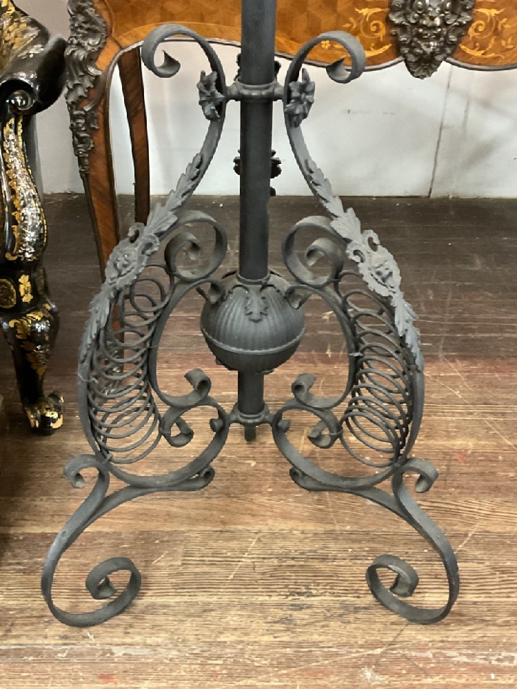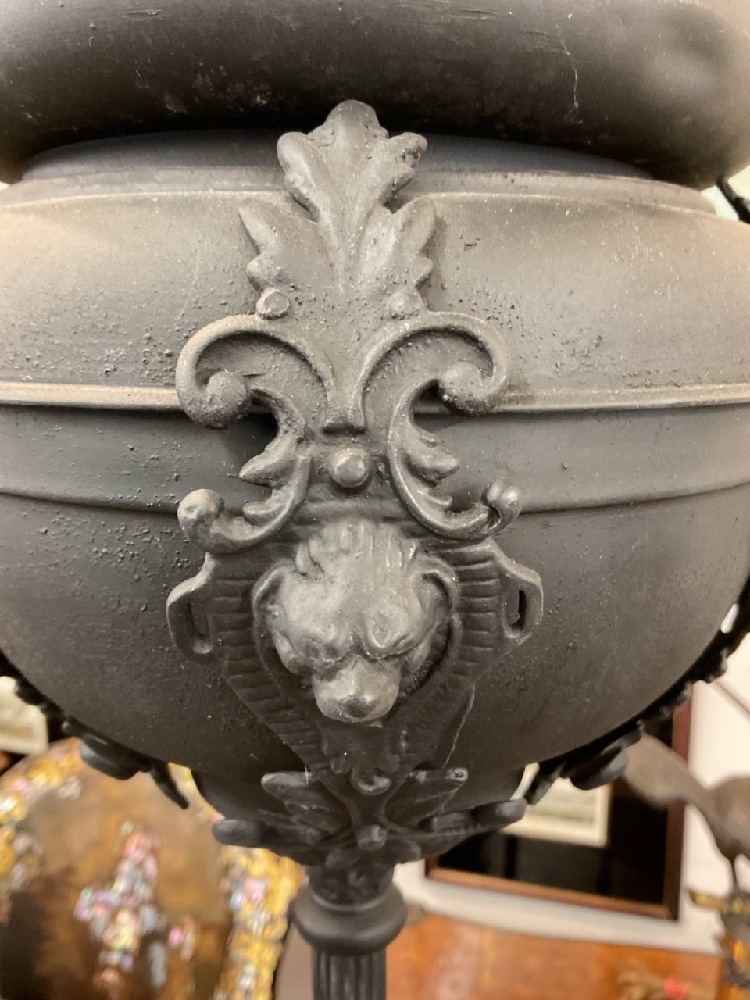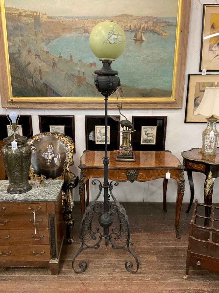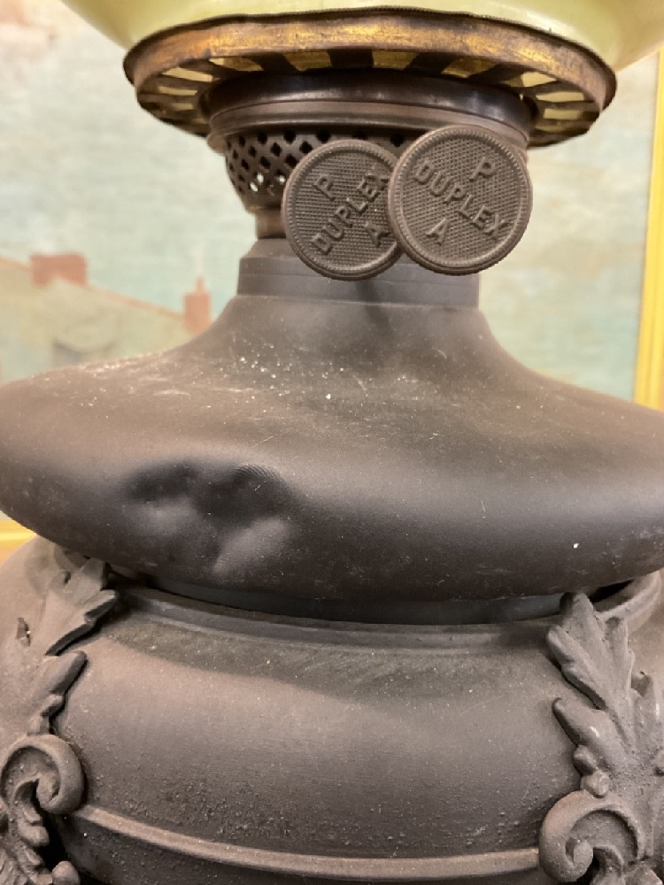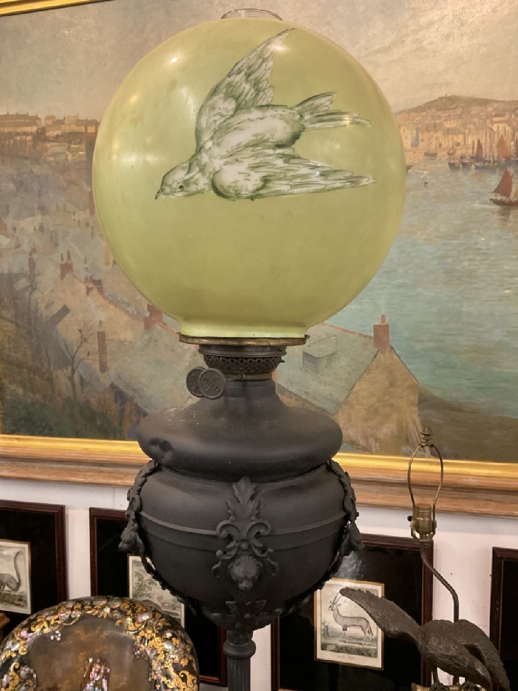 Victorian banquet lamp. Black painted iron with appearing to be original burner insert and globe shade.
