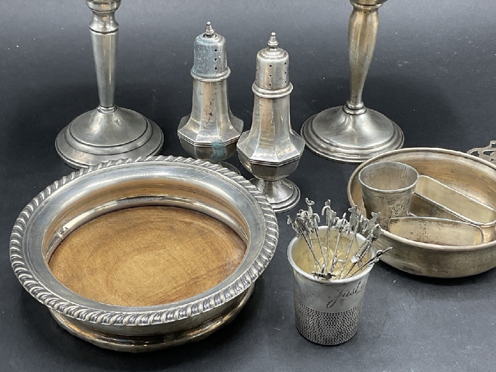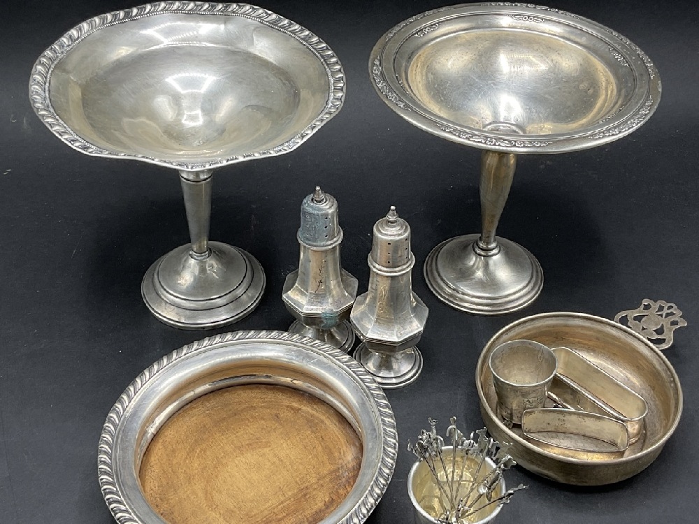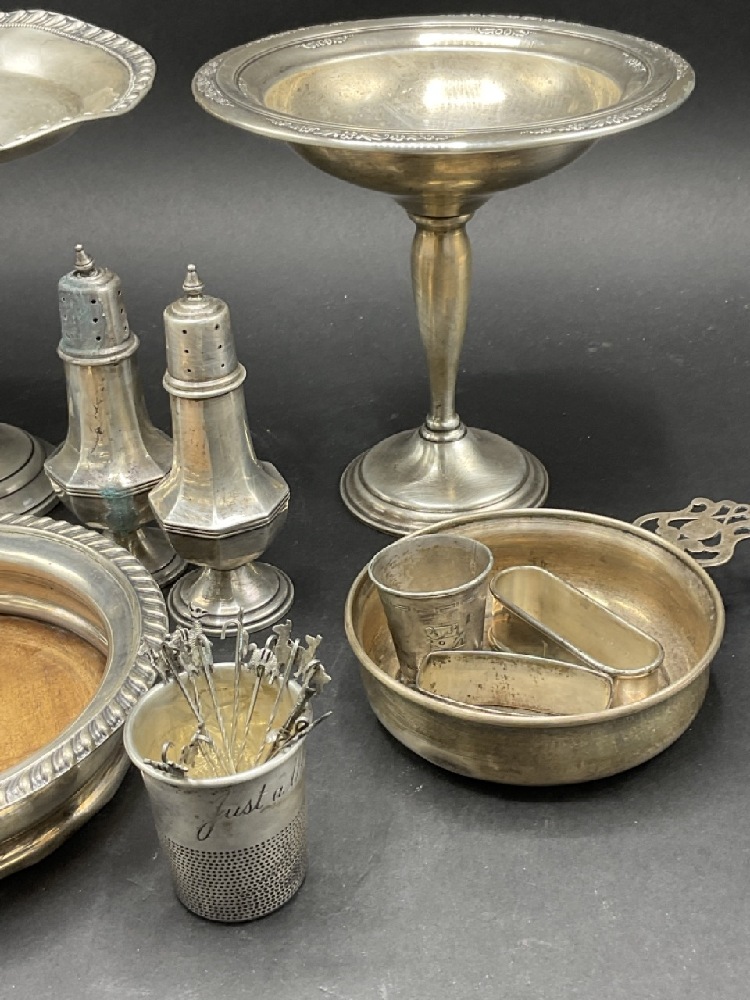 Compiled estate sterling silver. Wine coaster, weighted bowls, salt and pepper, thimble and hors d'oeuvre pieces. As seen in photograph preview.
