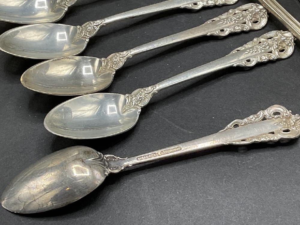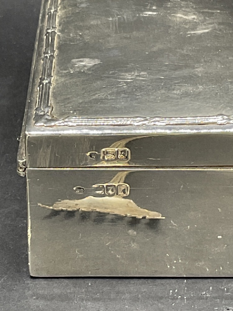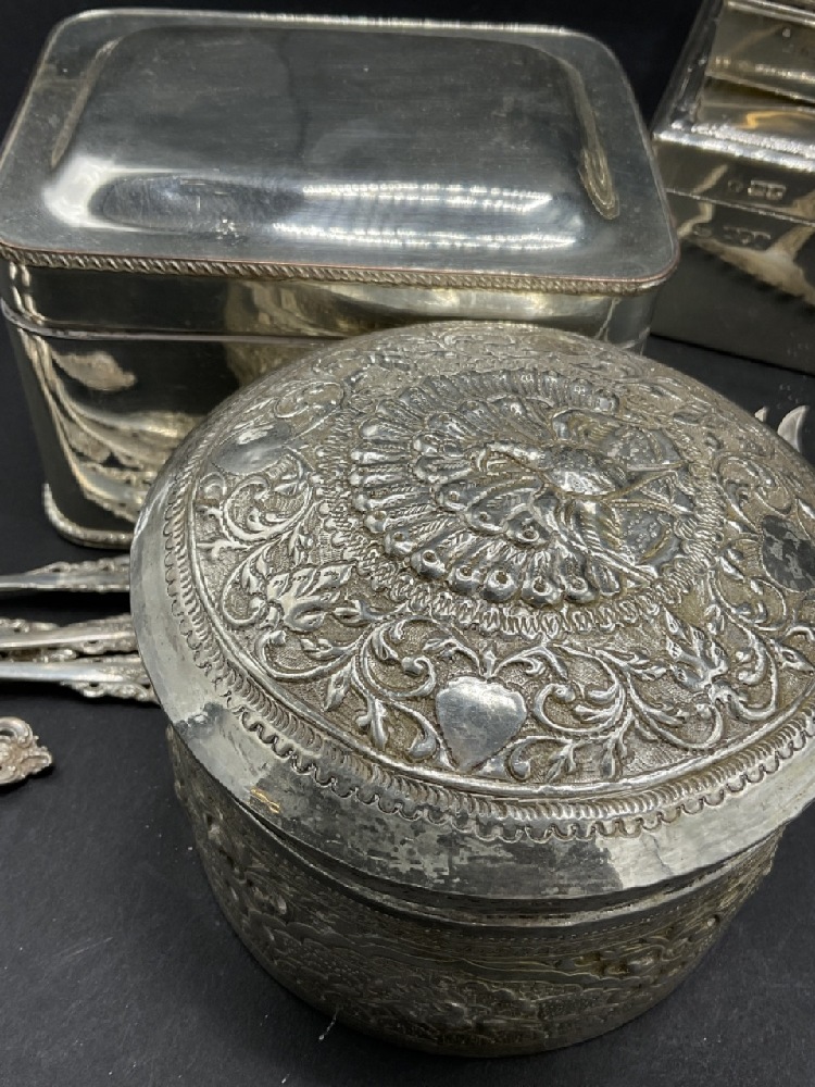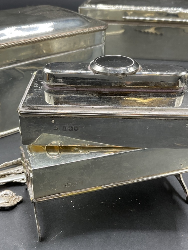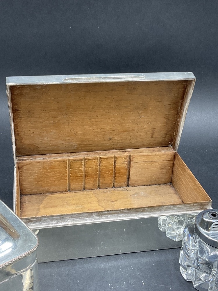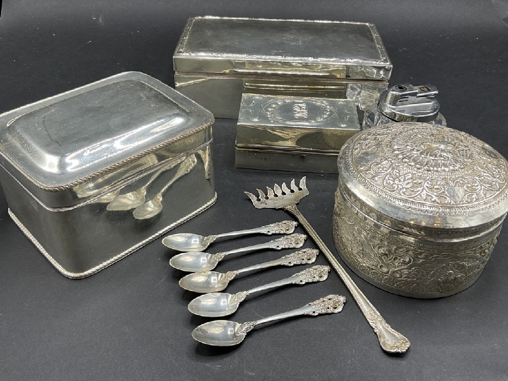 Assorted sterling silver and silver plated objects. EP Paris cigar lighter with miniature pull out table and English sterling silver case. Sterling silver wood lined humidor box, silver plated boxes, stelring silver spoons and fork. As seen in photograph preview.