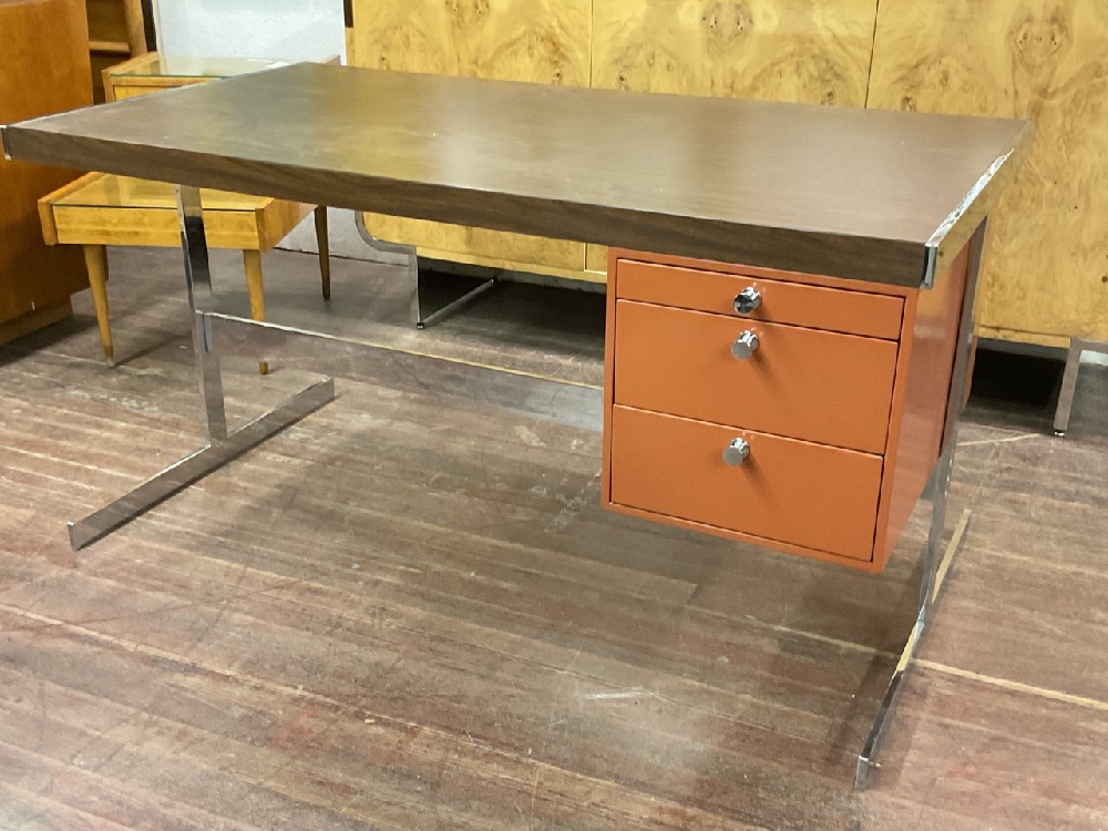 Modern Design Coral Painted Metal and Chrome Desk with formica wood top. Very good condition.