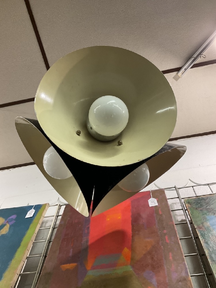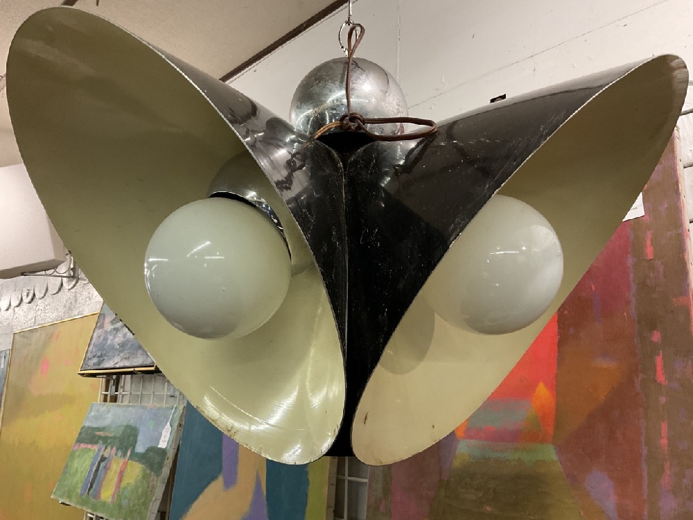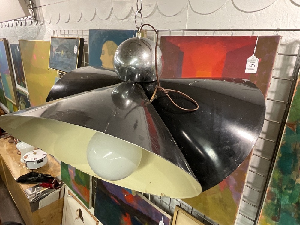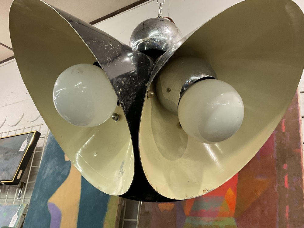 Vintage MCM Chrome, Black and White Three Part Hanging Light Fixture. Underwriter's laboratories label.