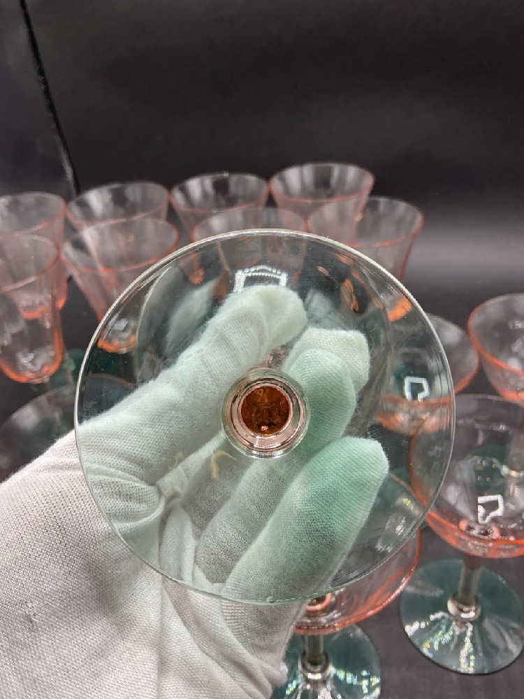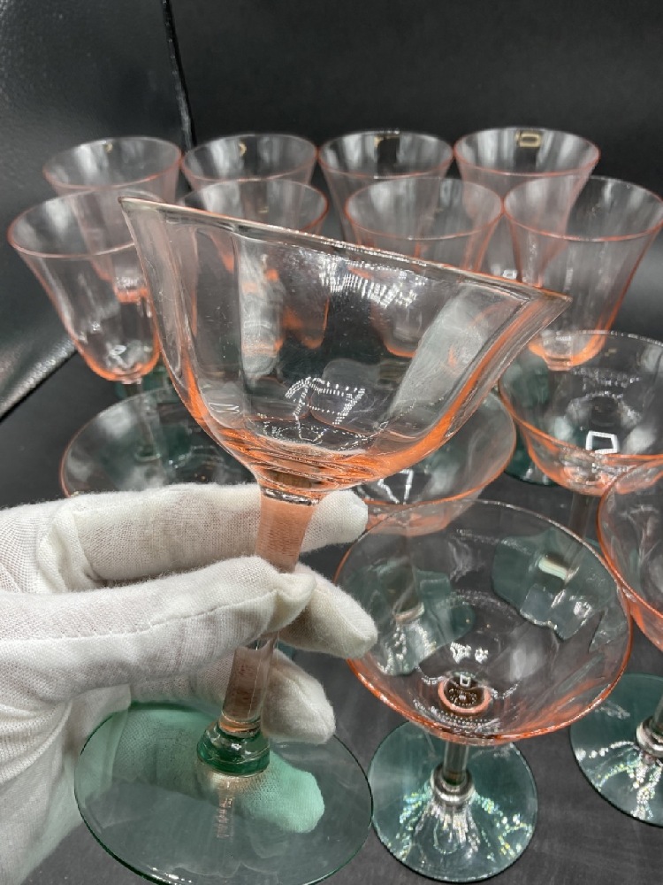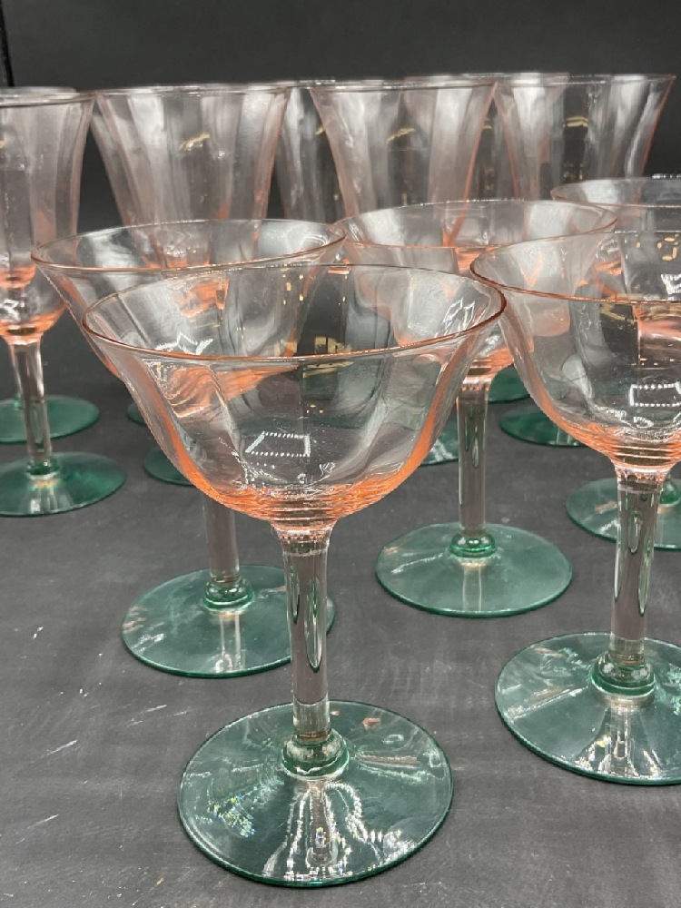 Depression era Watermelon green and pink stemware. Eight of each piece. Total 16