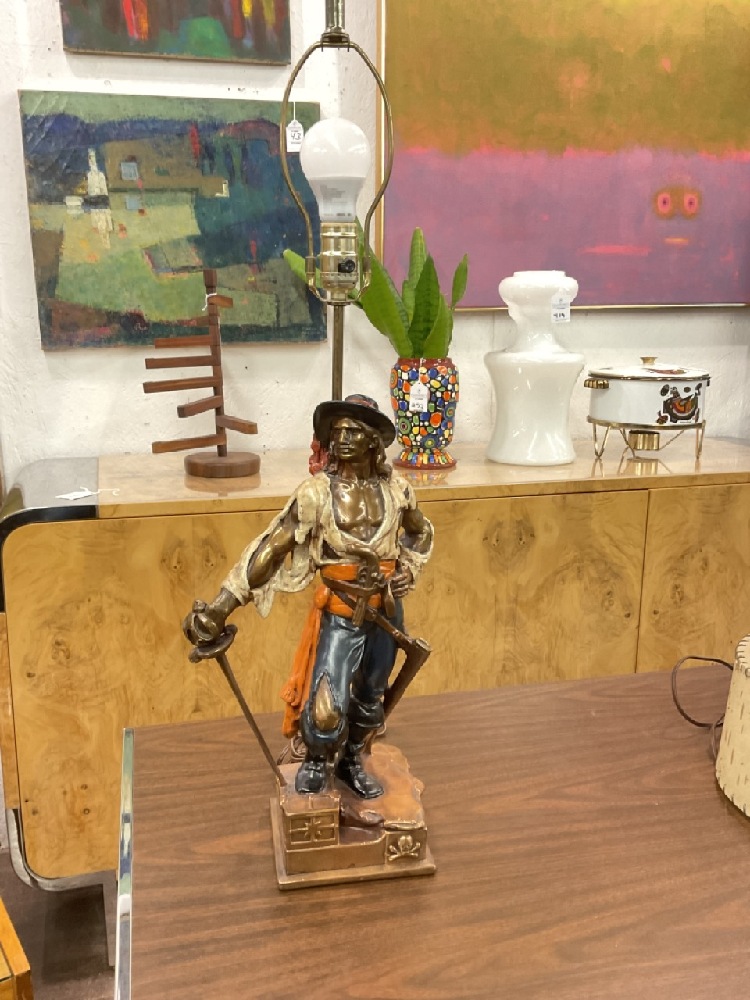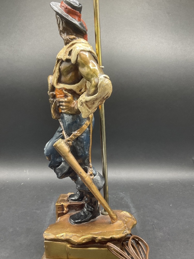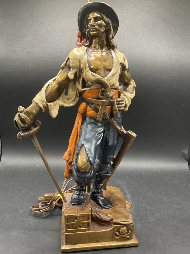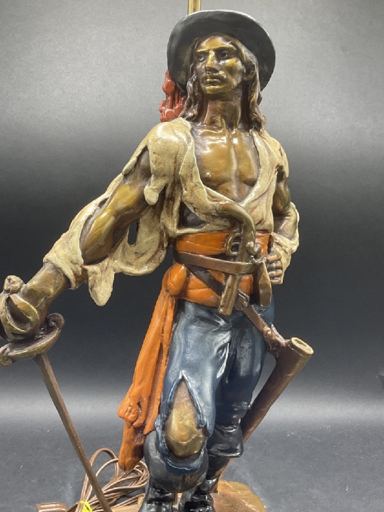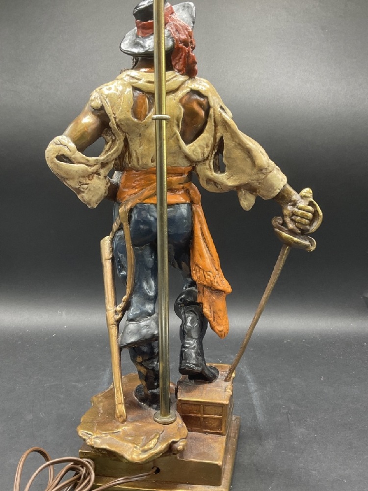 Quality bronze clad decorator's table lamp of a pirate making his stake.