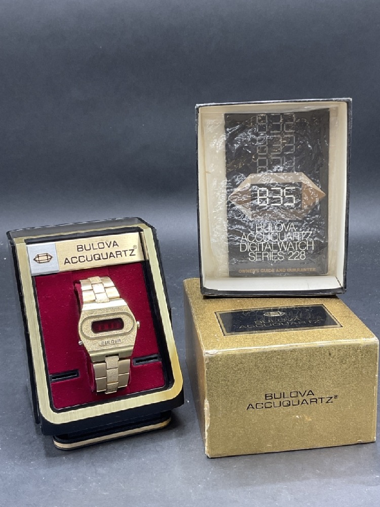 A vintage Bulova Digital watch. Series 228. Immaculate condition with original box and paperwork. Box window has some scuffing. Watch is near mint. Please see photograph preview.