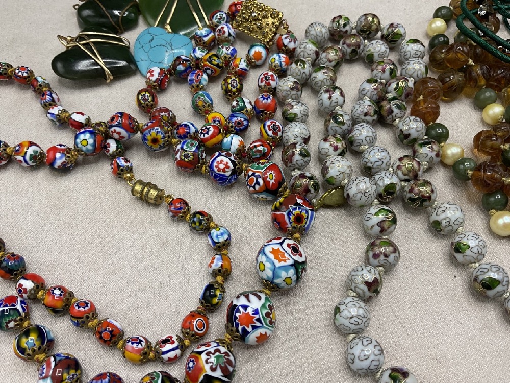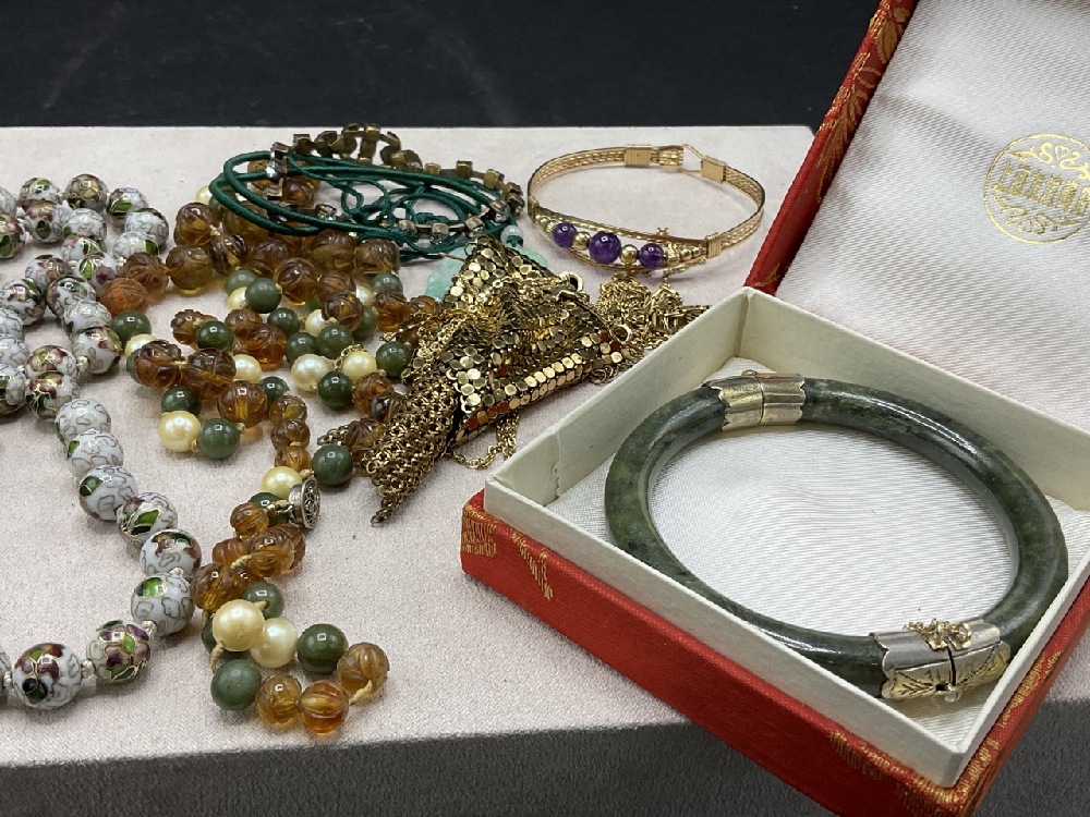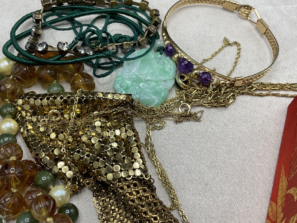 Compiled jewelry including jade hearts, turquoise/14k heart, jade bangle bracelet, bead necklaces etc.
