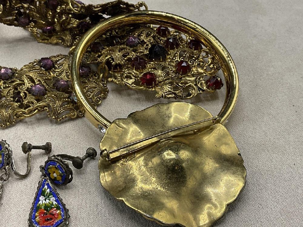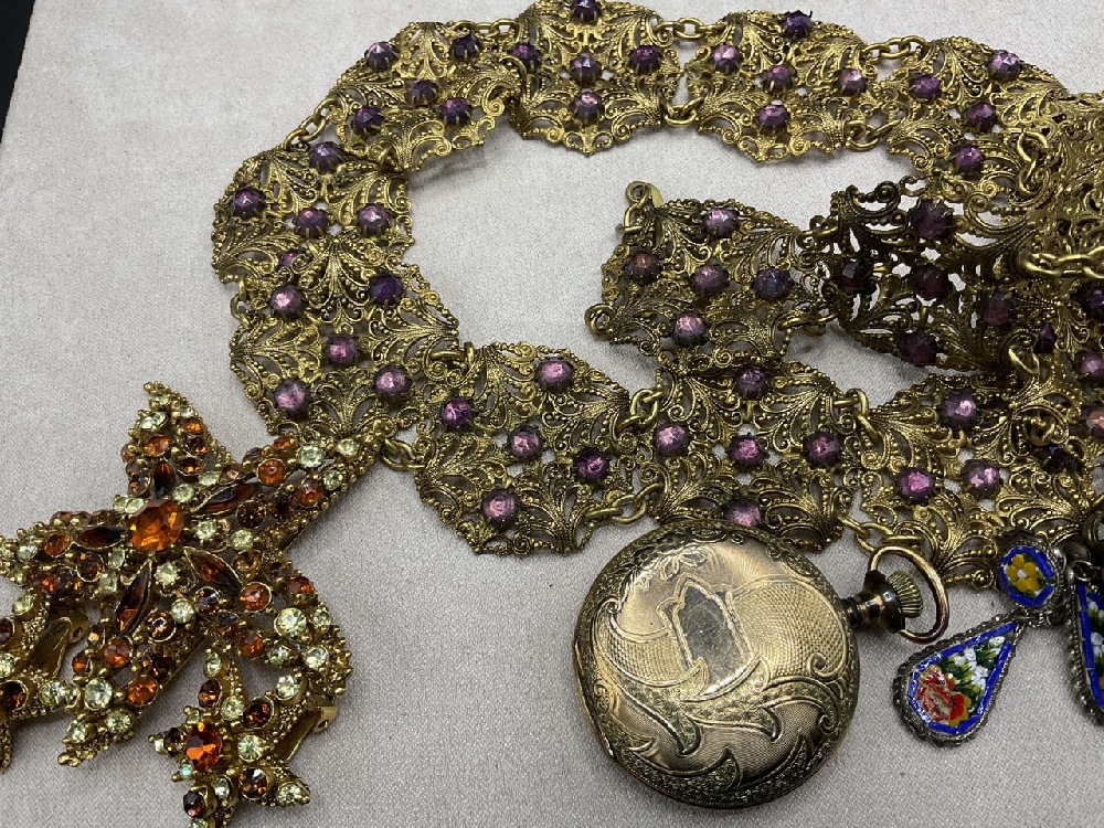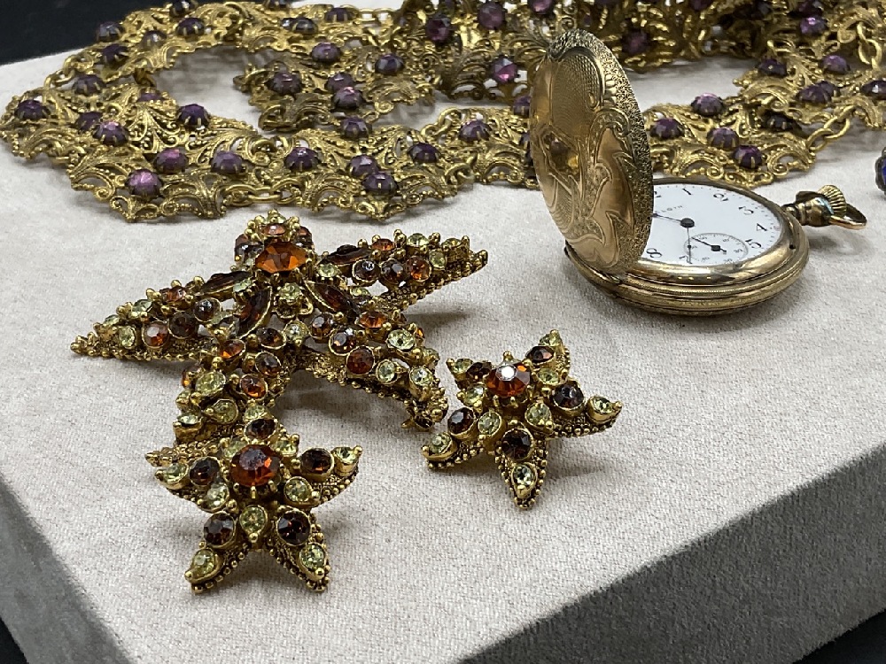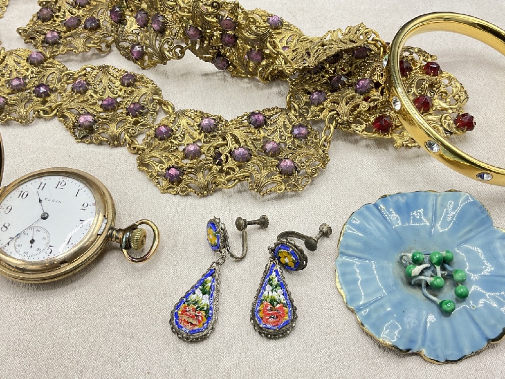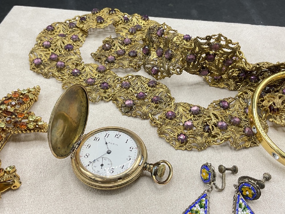 Compiled jewelry including Sandor enameled broach, Elgin gold filled pocket watch, rhinestone belt, Florenza starfish broach and earrings, Millefiori earrings and other gold filled pieces.