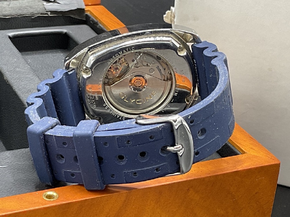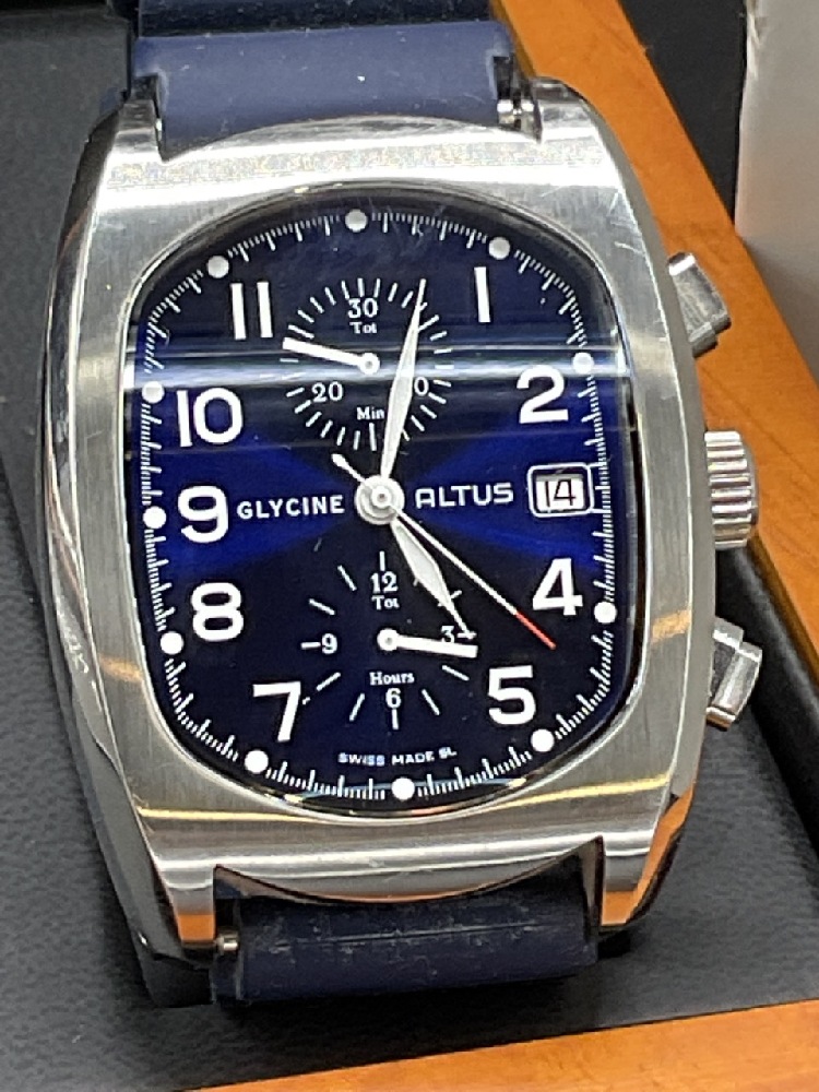 Glycine Men's Wristwatch "Altus Chronograph 3ATM-3811. Swiss Movement w/ Date. Dimensions: 2" X 1 1/2" face. Original blue band. Some light wear to band and box from storage.