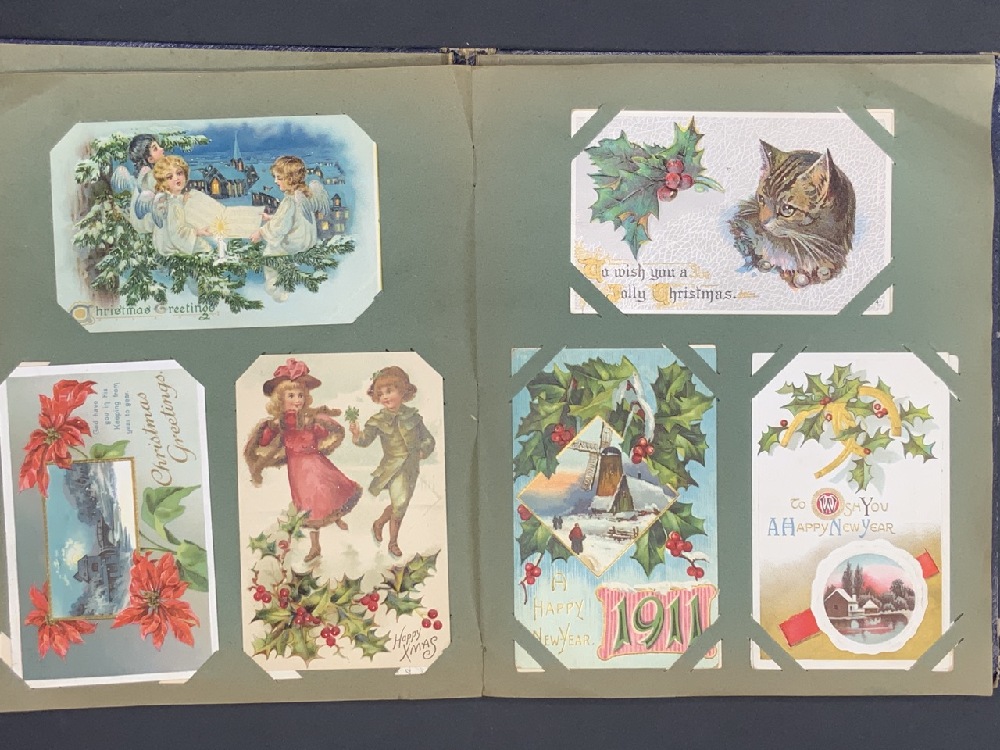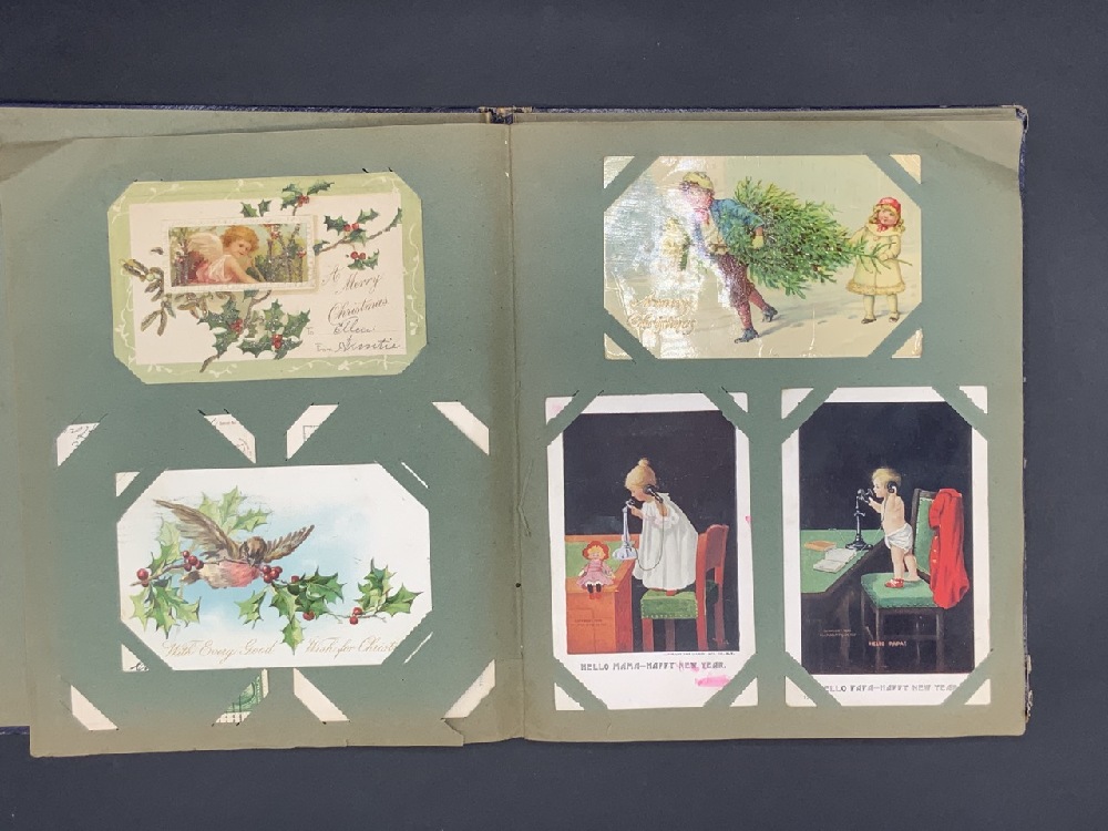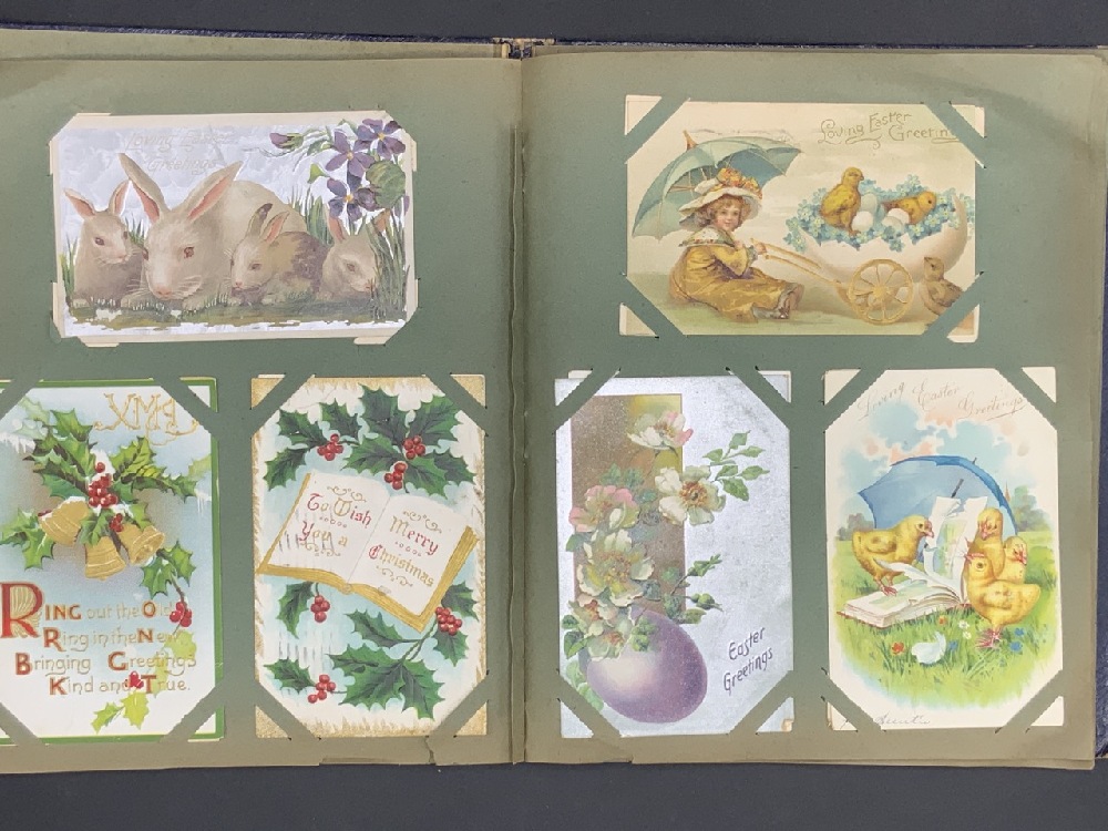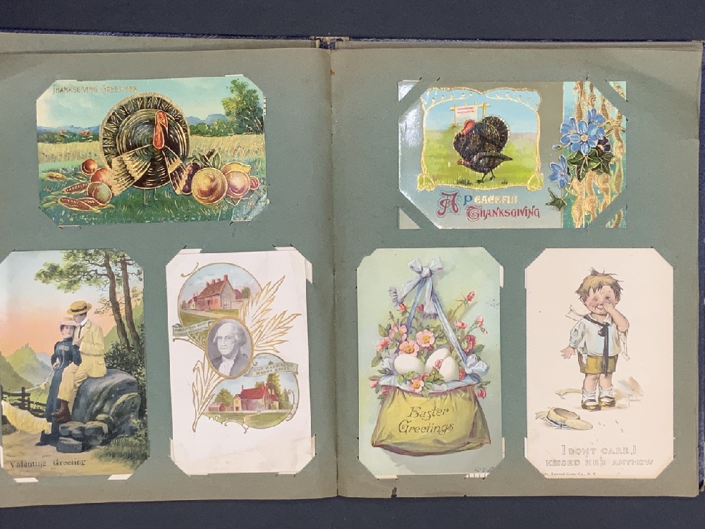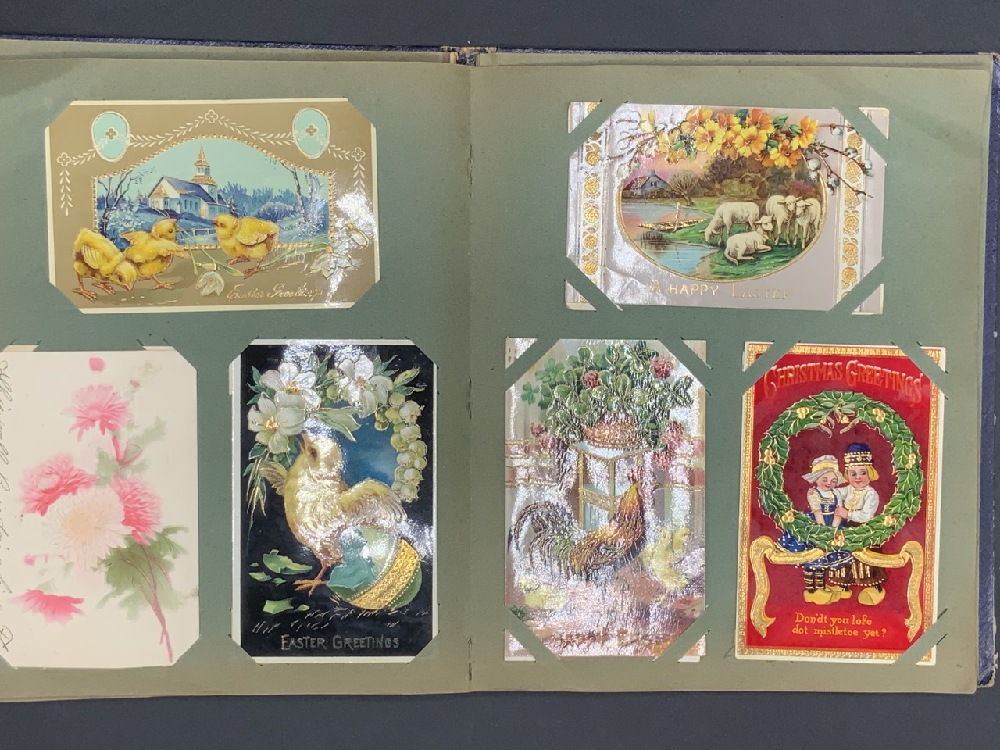 92 Mixed Post Cards housed in original leather album. Assorted holidays etc.