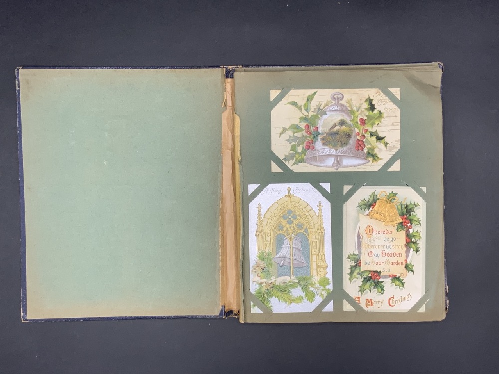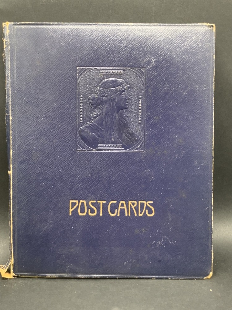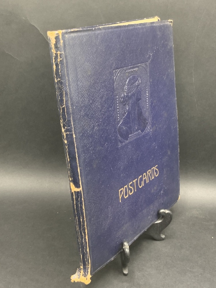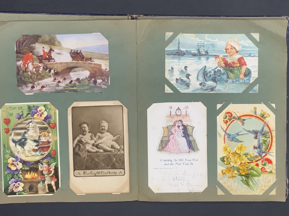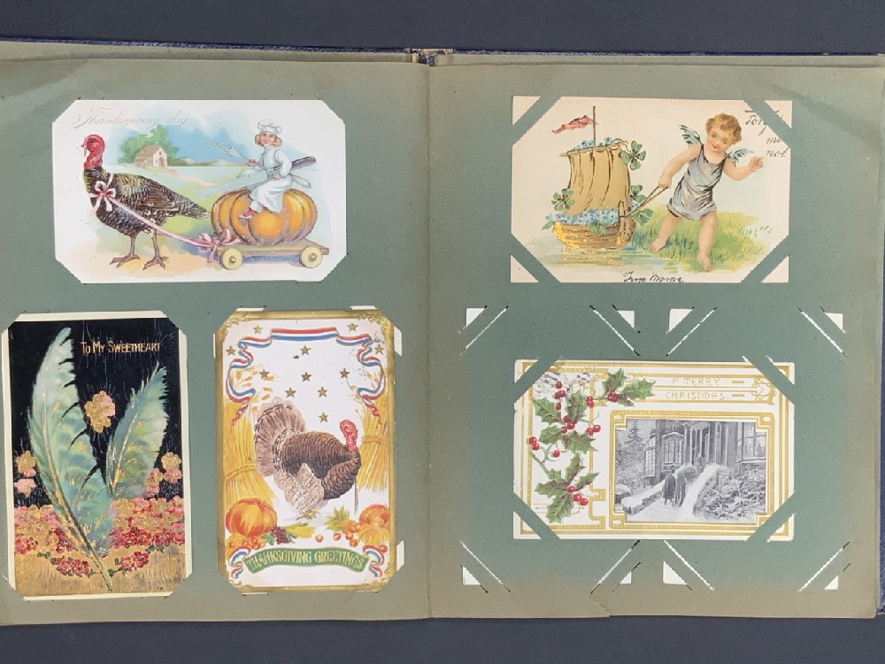 92 Mixed Post Cards housed in original leather album. Assorted holidays etc.